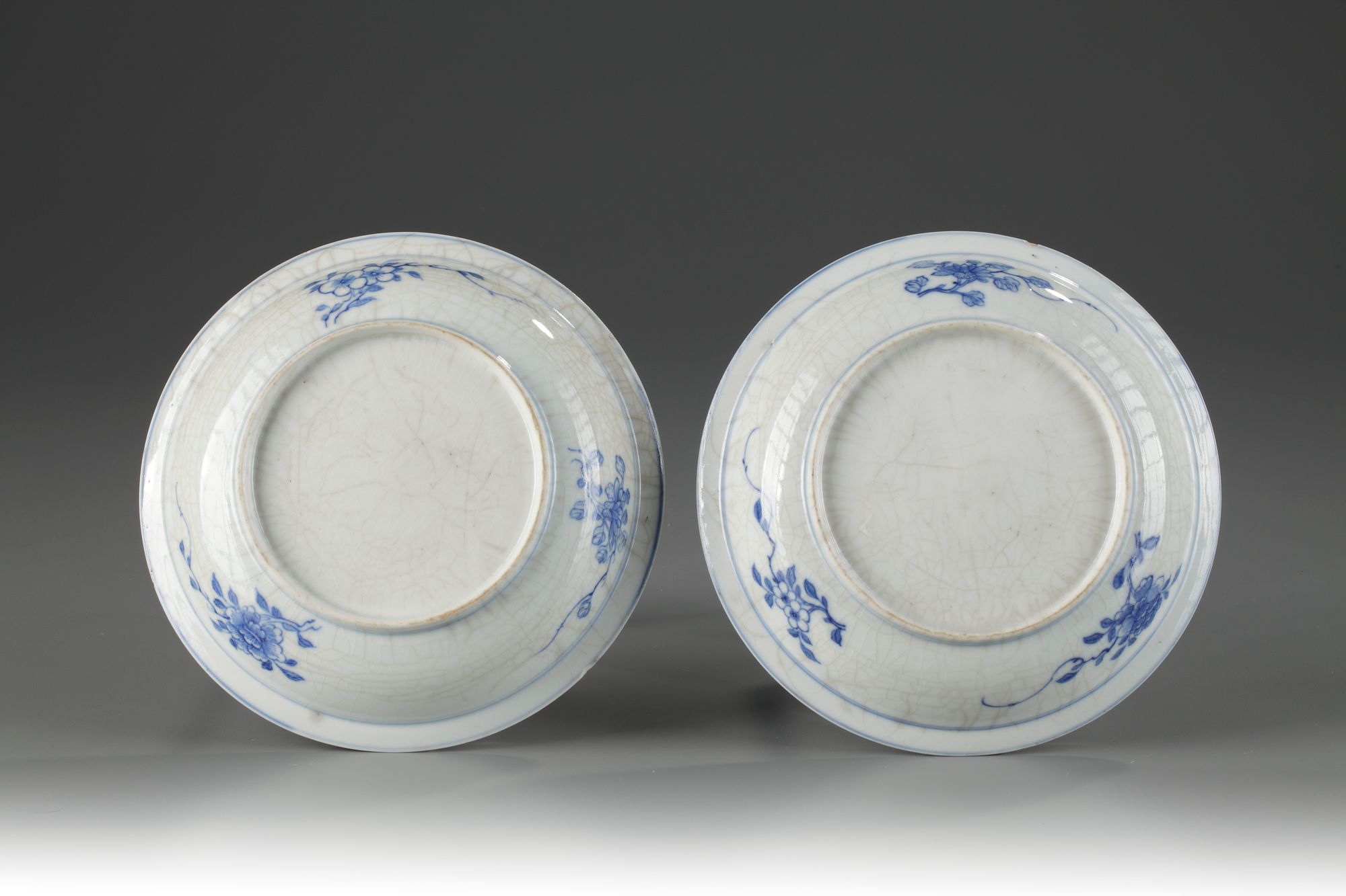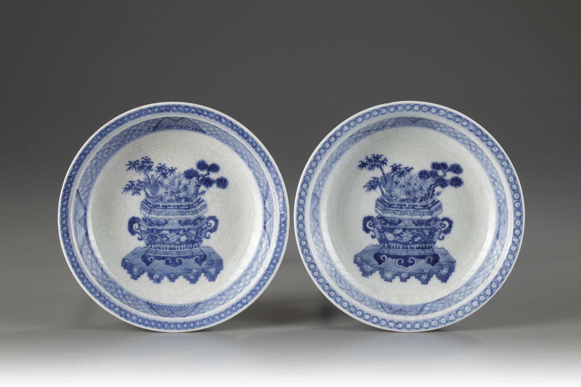 Each dish is decorated with an elaborate archaistic censer filled with the Three Friends of Winter: pine, bamboo and prunus. The reverse is decorated with prunus, chrysanthemum, and peony sprays. The dishes are covered overall with a finely crackled glaze.