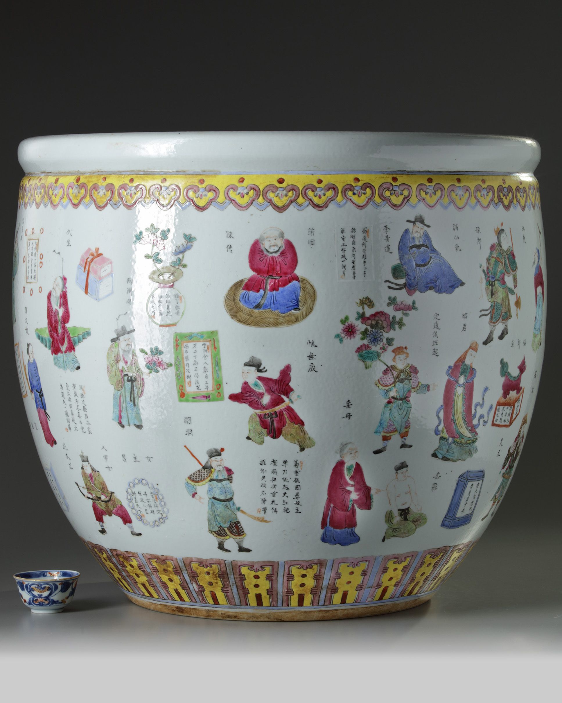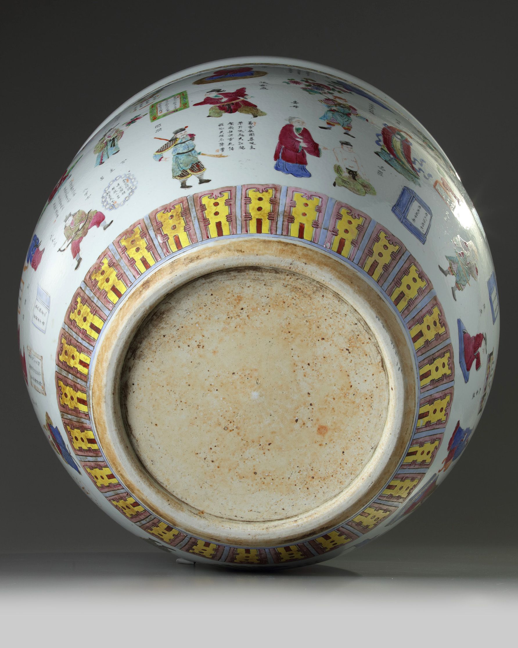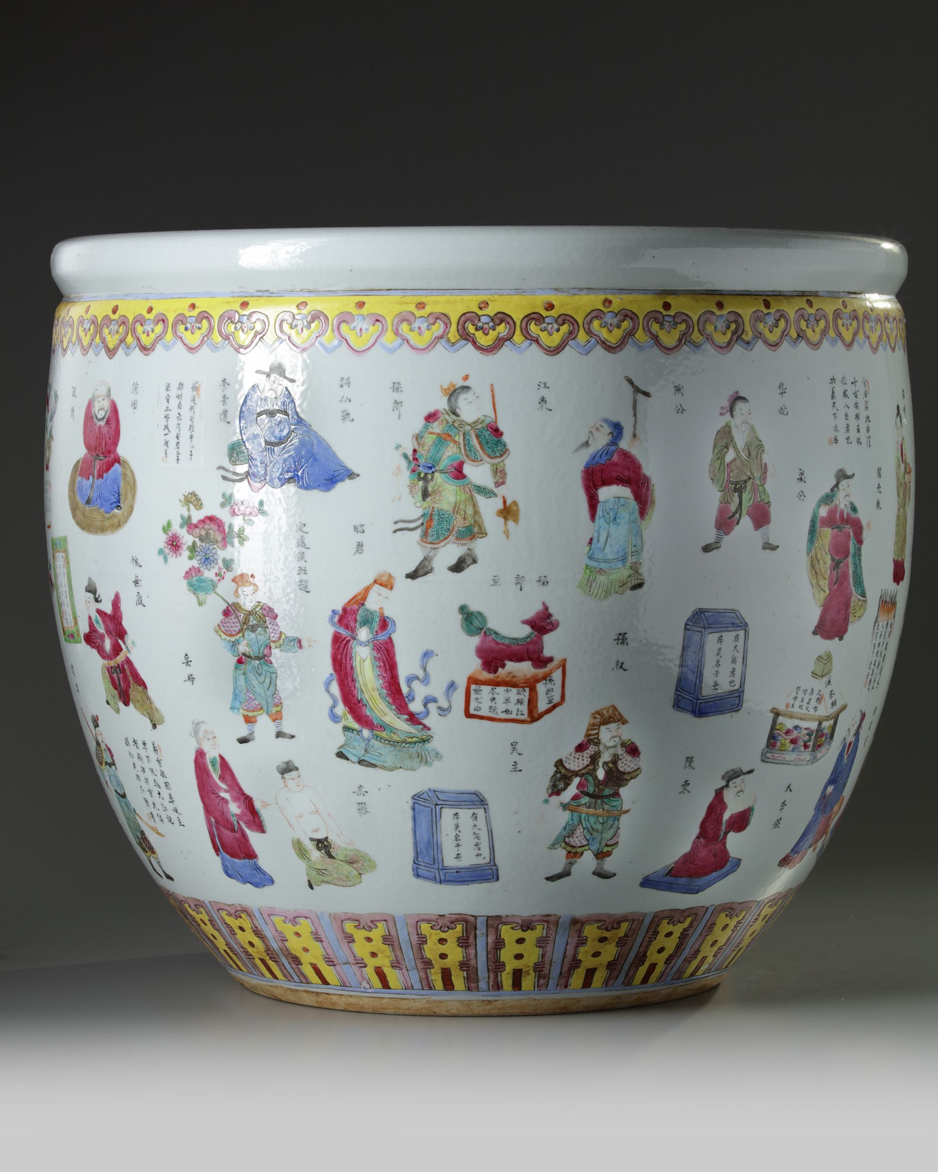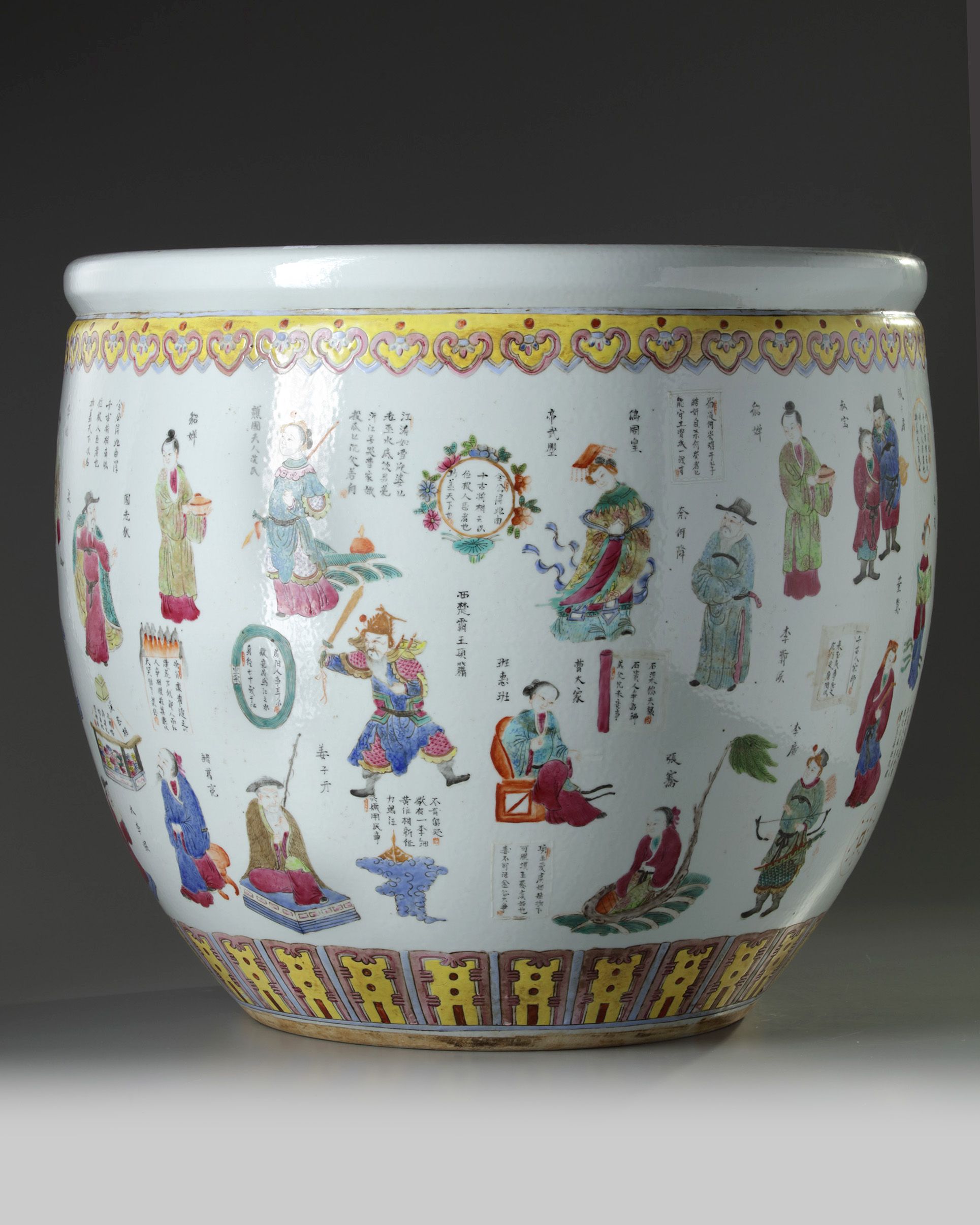 The large vessel is decorated to the exterior with the personages from the Wu Shuang Pu (The Table of Peerless Heroes), each accompanied with a panel enclosing the description about the character, all below a yellow-ground ruyi-head band to the rim.