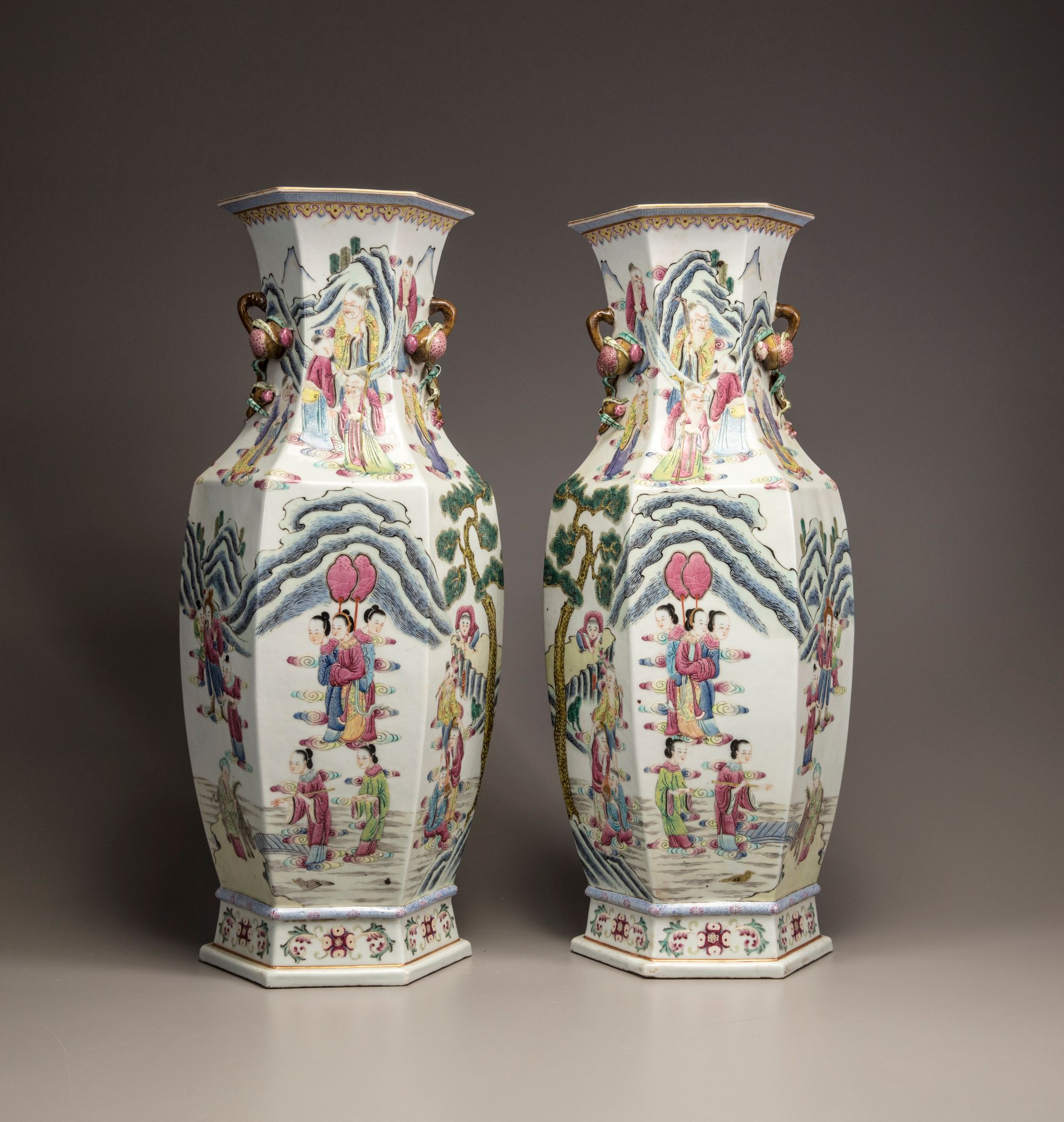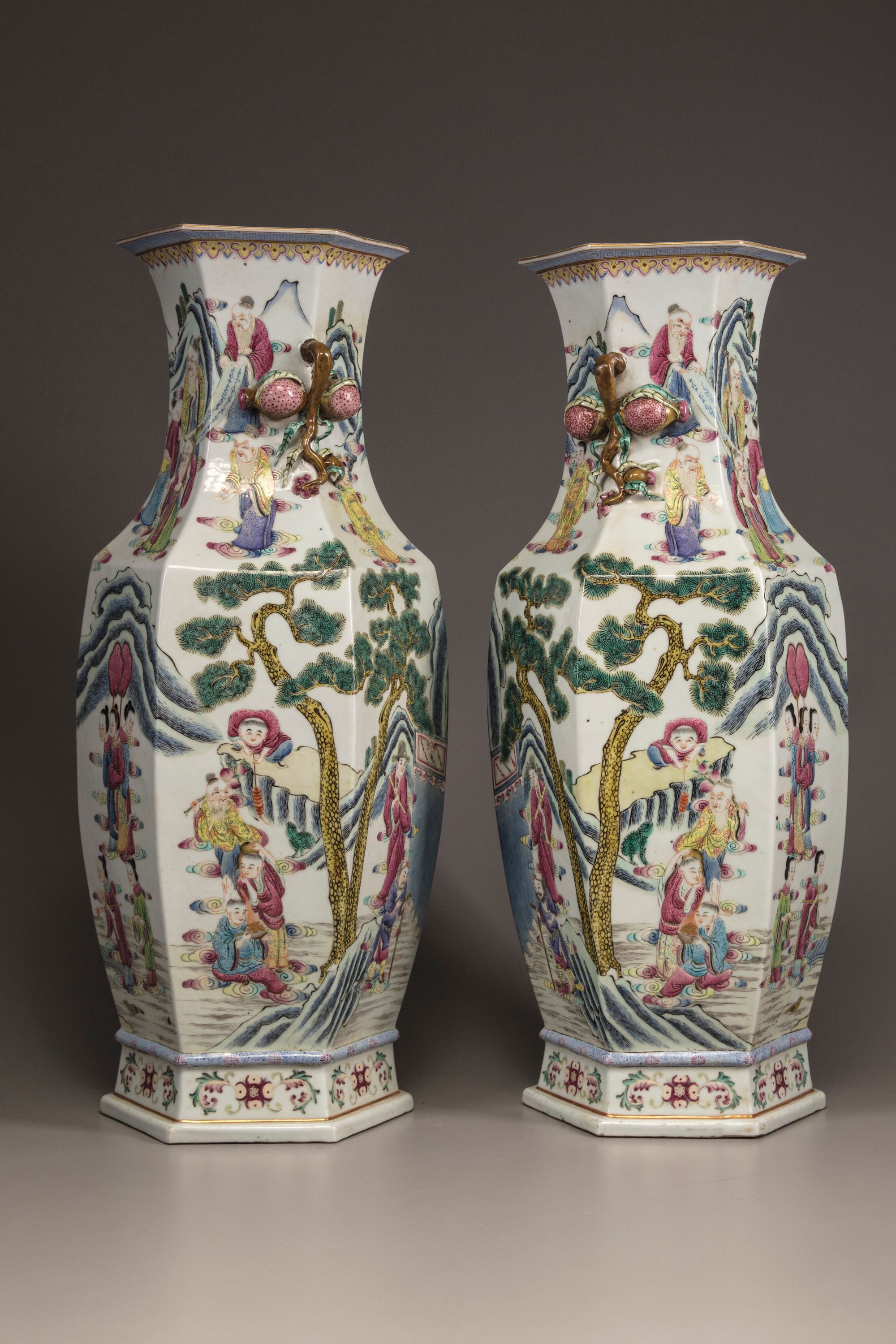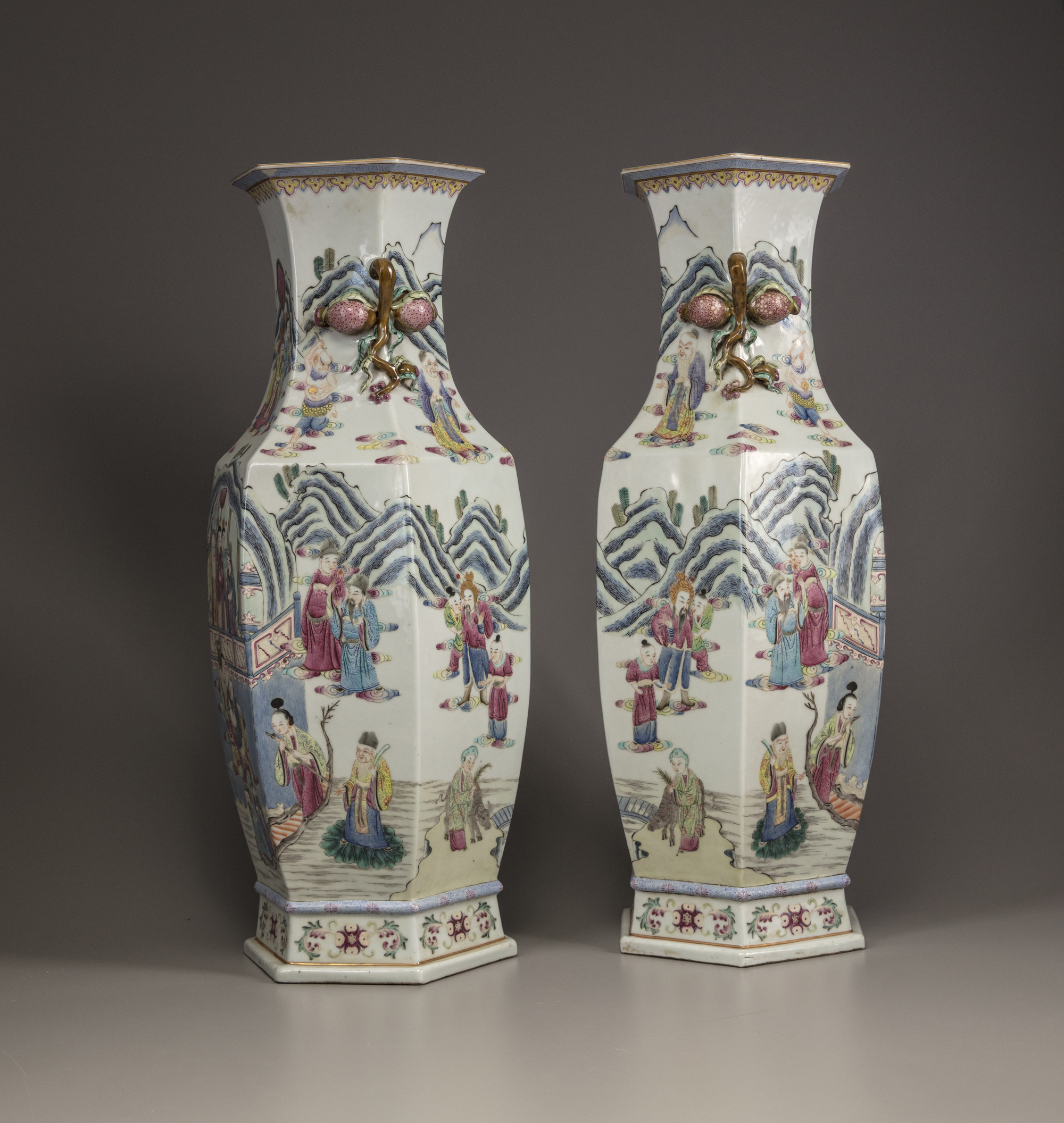 Each vase is decorated in mirror image with a continuous scene of various Immortals (including the Jade Emperor, Liu Hai, Niu Lang and the Weaver Girl) at leisure amongst pine and cloud scrolls in a mountainous river landscape, all below a ruyi-head band and a floral band to the foot. The neck is decorated with two moulded pomegranate branch handles. The interior is glazed turquoise.