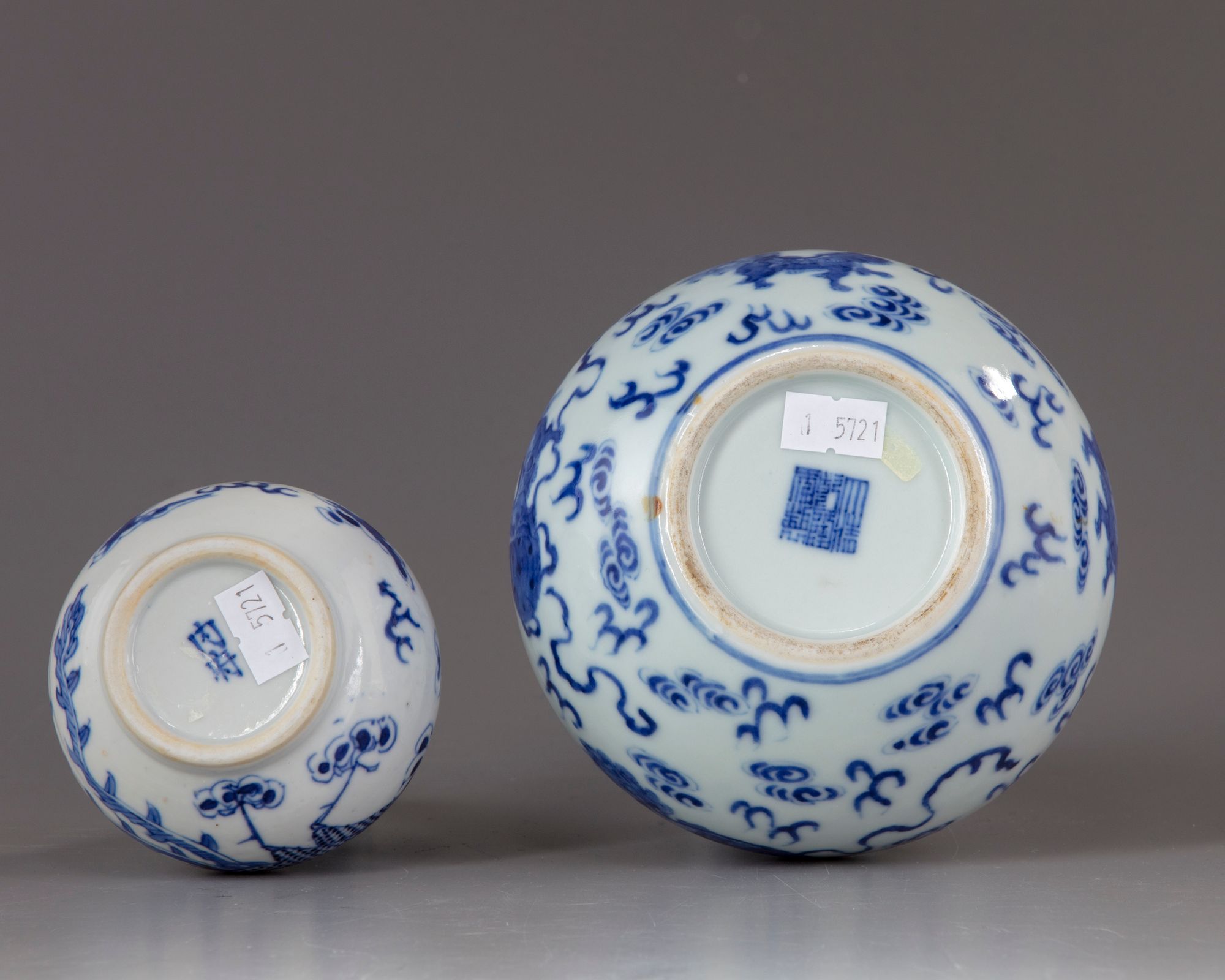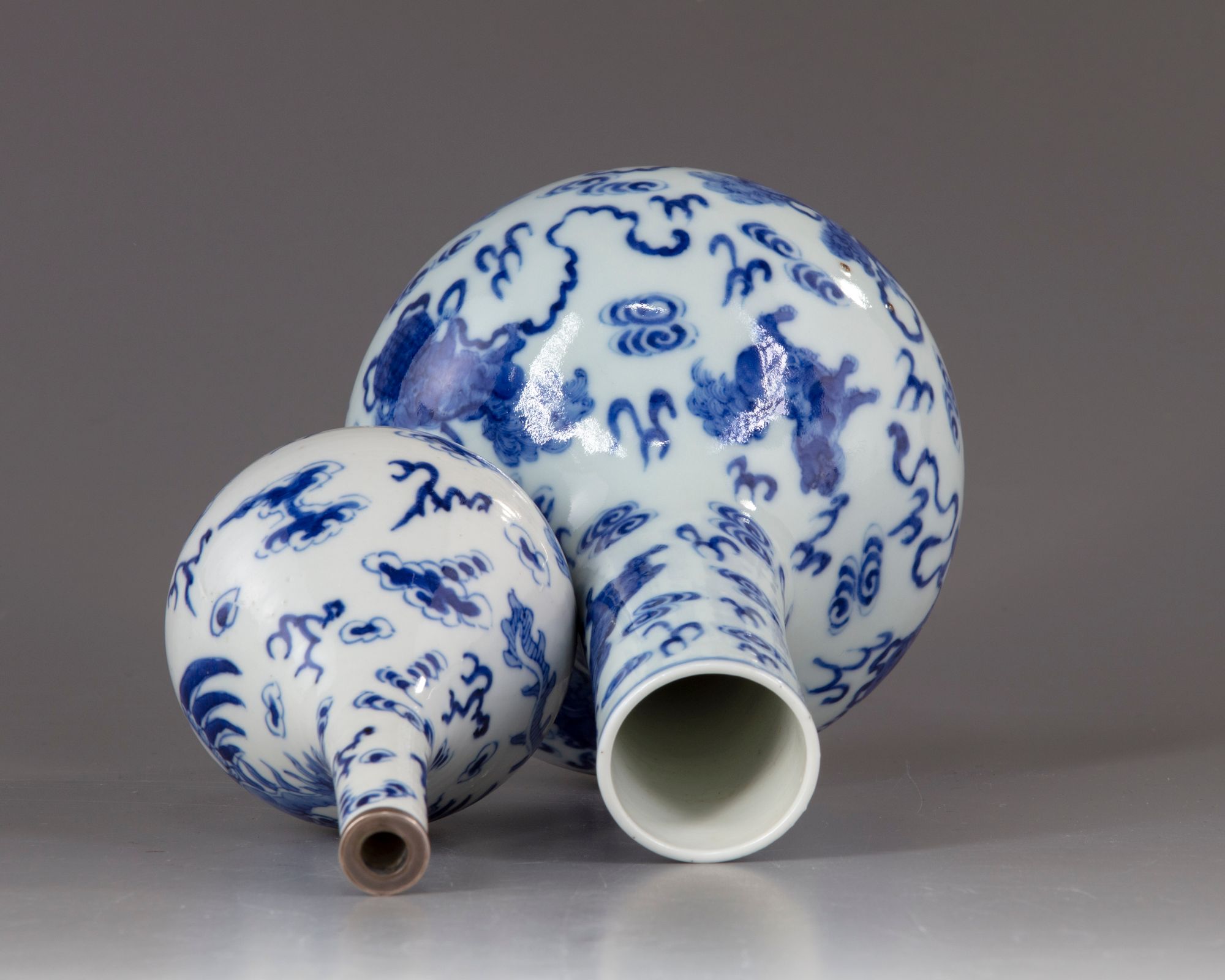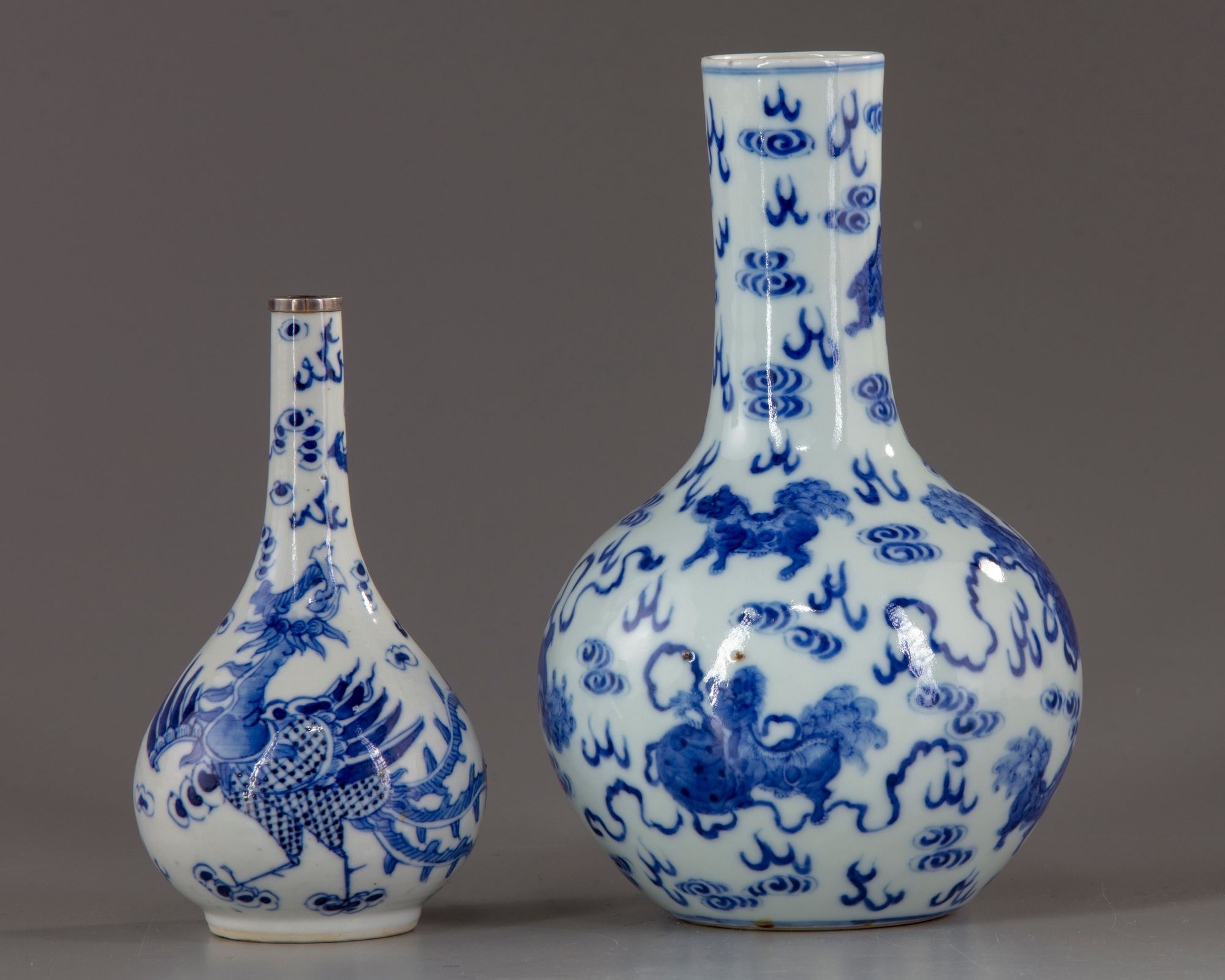 -A blue and white porcelain vase decorated with Fu lion with precious objects amongst clouds. -A smaller blue and white porcelain vase decorated with a phoenix amongst clouds and flowers. The larger vase: 20.50 CM. High The smaller vase: 15.00 CM. High