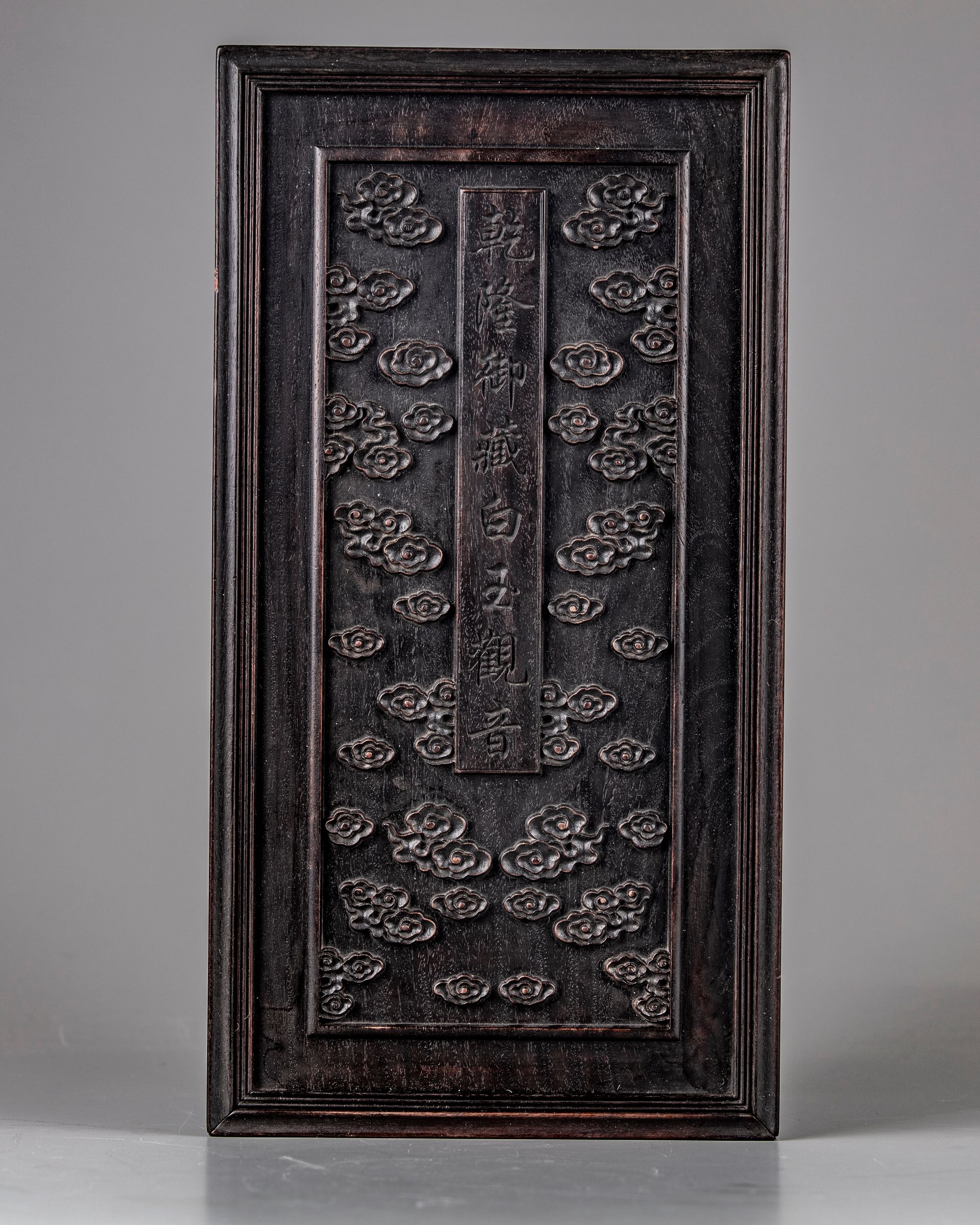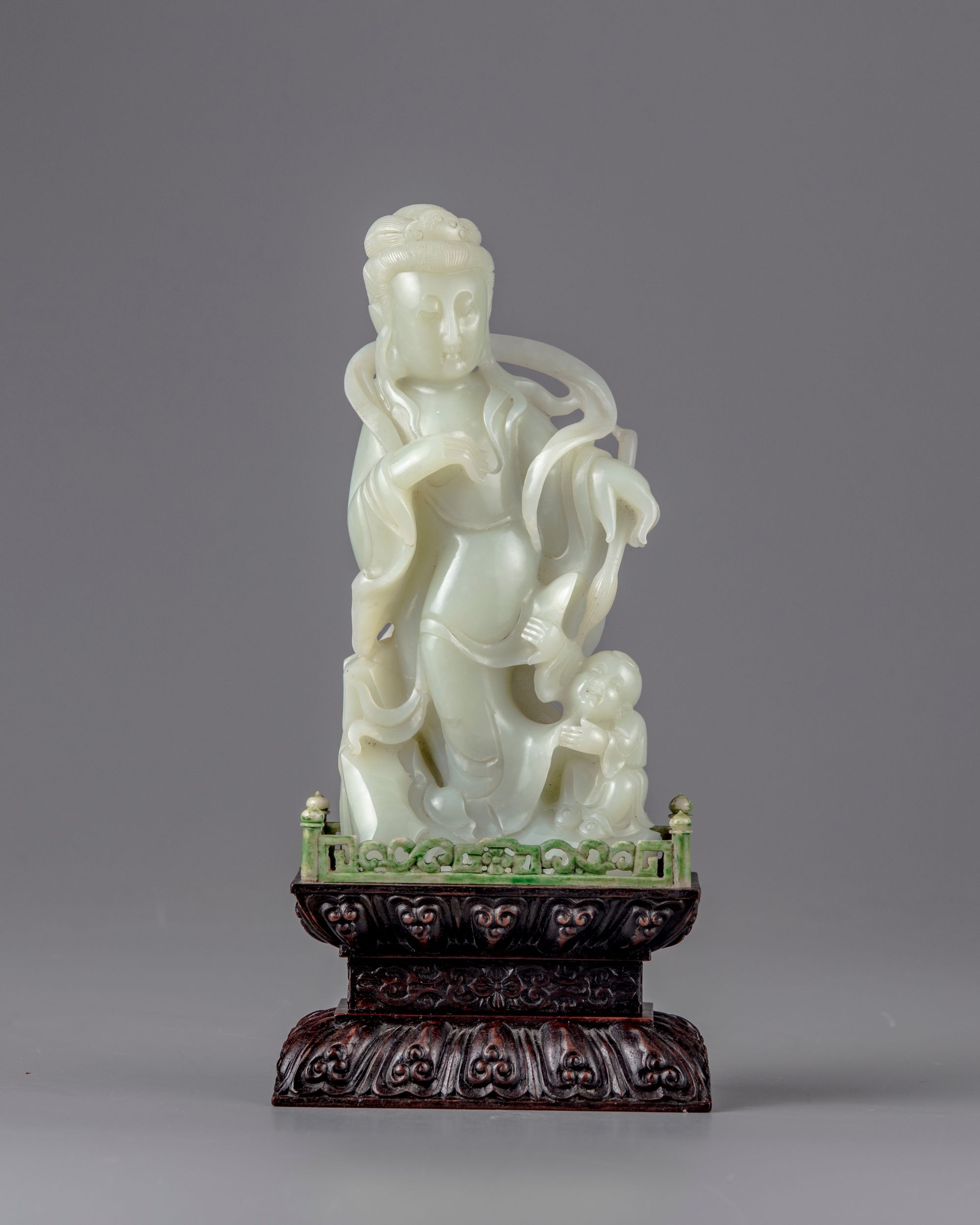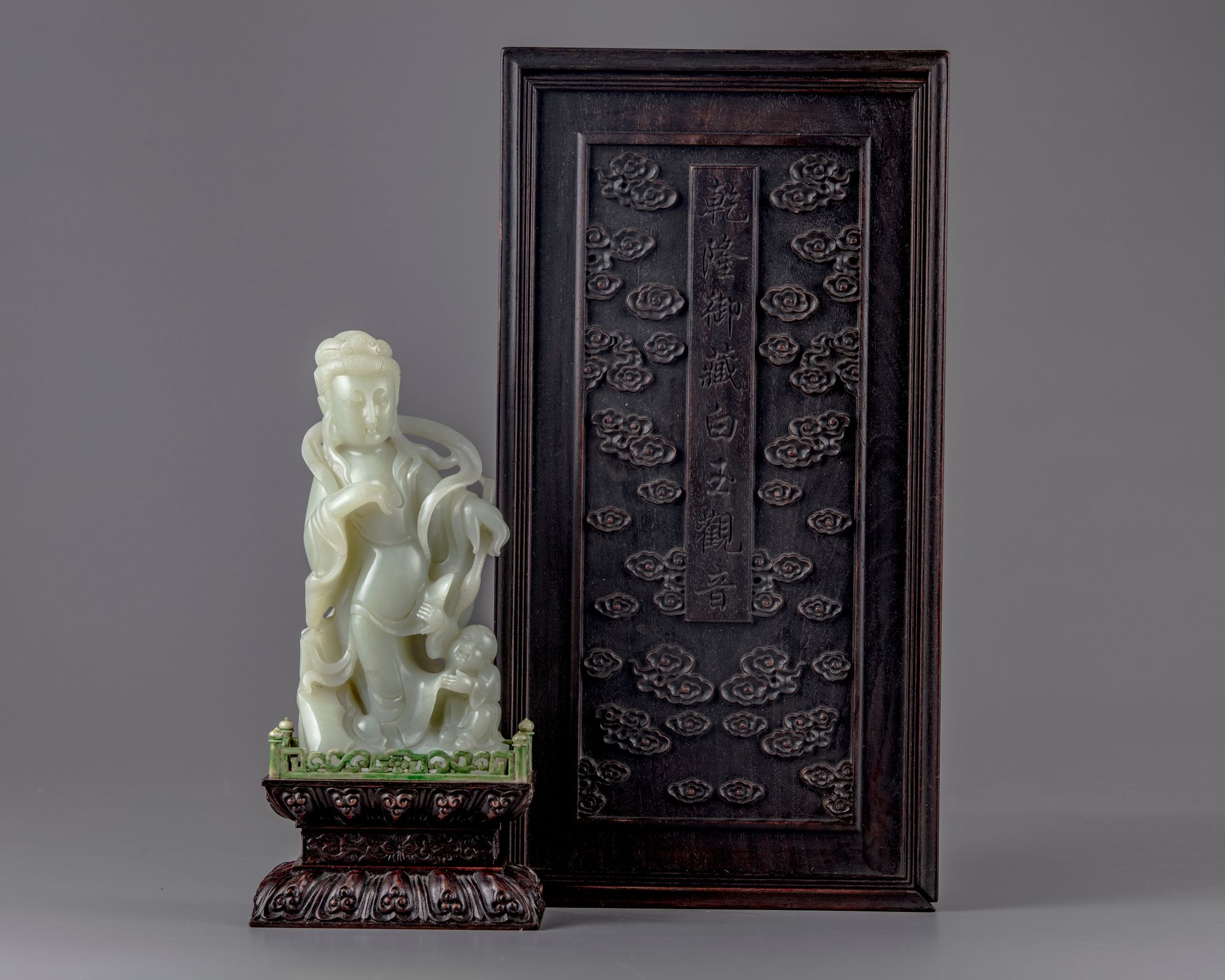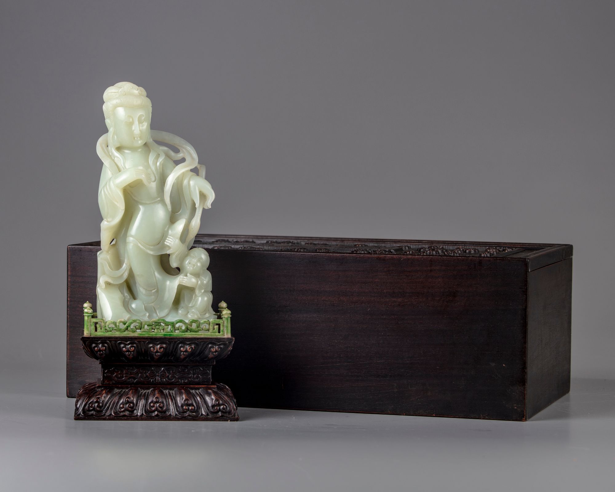 The jade carving consists of a guanyin modelled standing on rock work with a seated boy, wearing long-sleeved robes falling in graceful folds open at the chest, her hair is worn in plaits that fall onto her shoulders. one hand resting on her chest, the face with downcast eyes and benign expression, the zitan base is carved as double lotus base with pierced borders. The stone is of an even pale tone. All in a Zitan box ,The cover is carved with a rectangular panel enclosing a Chinese calligraphy with carved clouds, all with a large rectangular panel.
