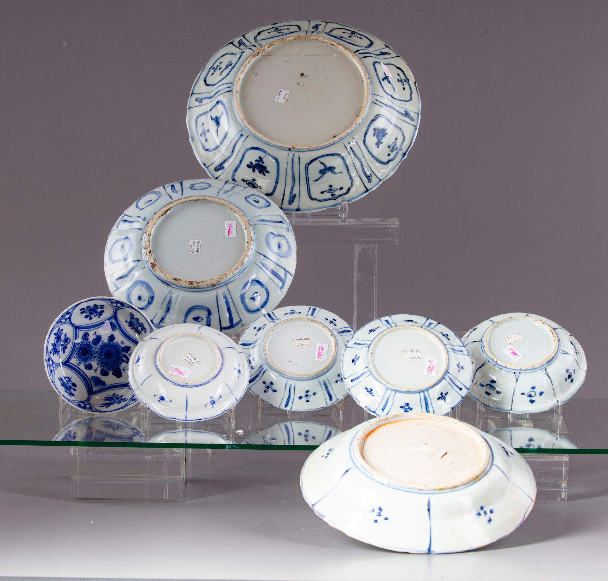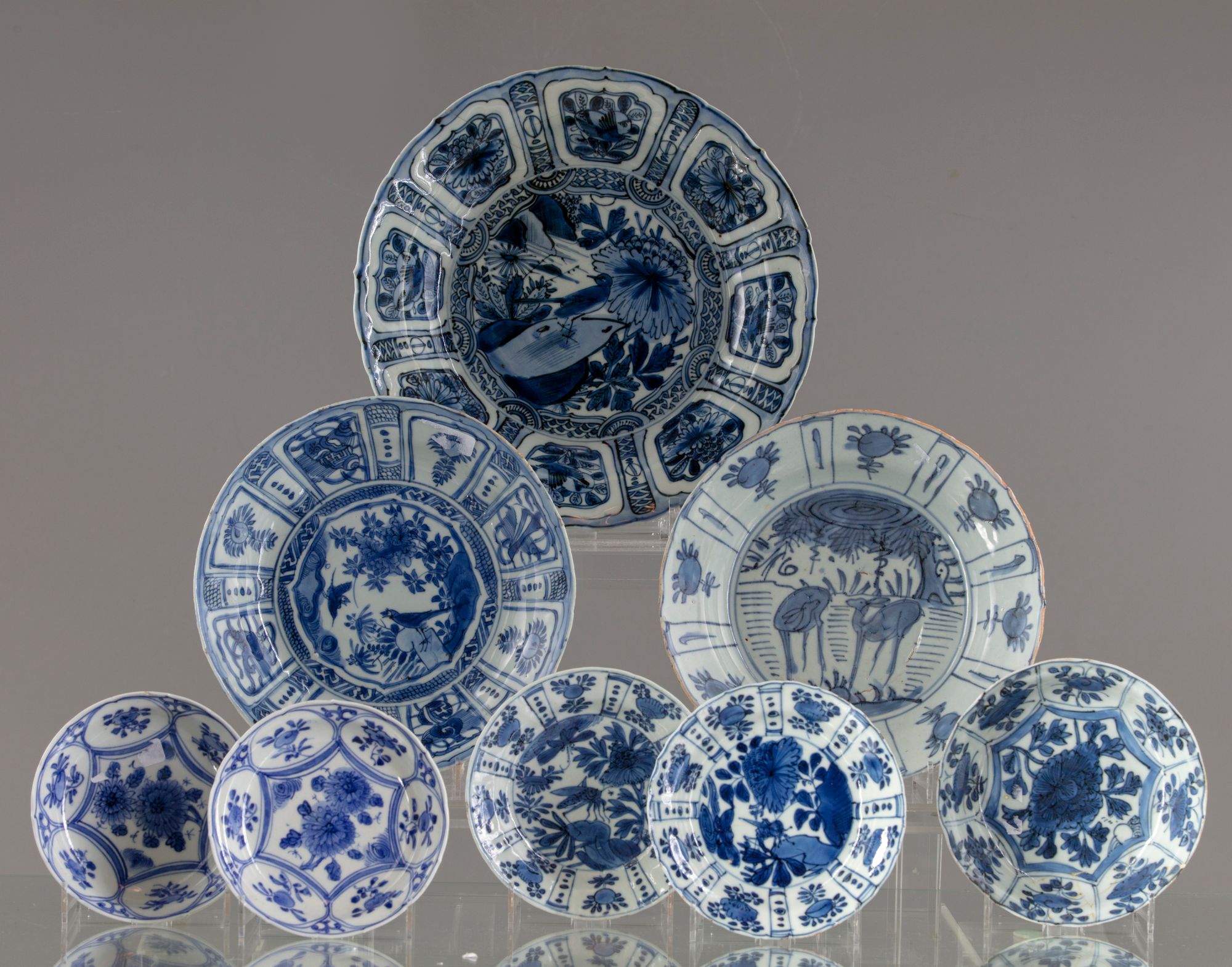 Comprising: a saucer painted with a phoenix perched on a rock; a small dish decorated with flowers; a pair of ‘grasshopper and flower’ saucers; a ‘twin deer’ dish; and a ‘birds and flowers’ dish. two small dishes with panels enclosing flowers.