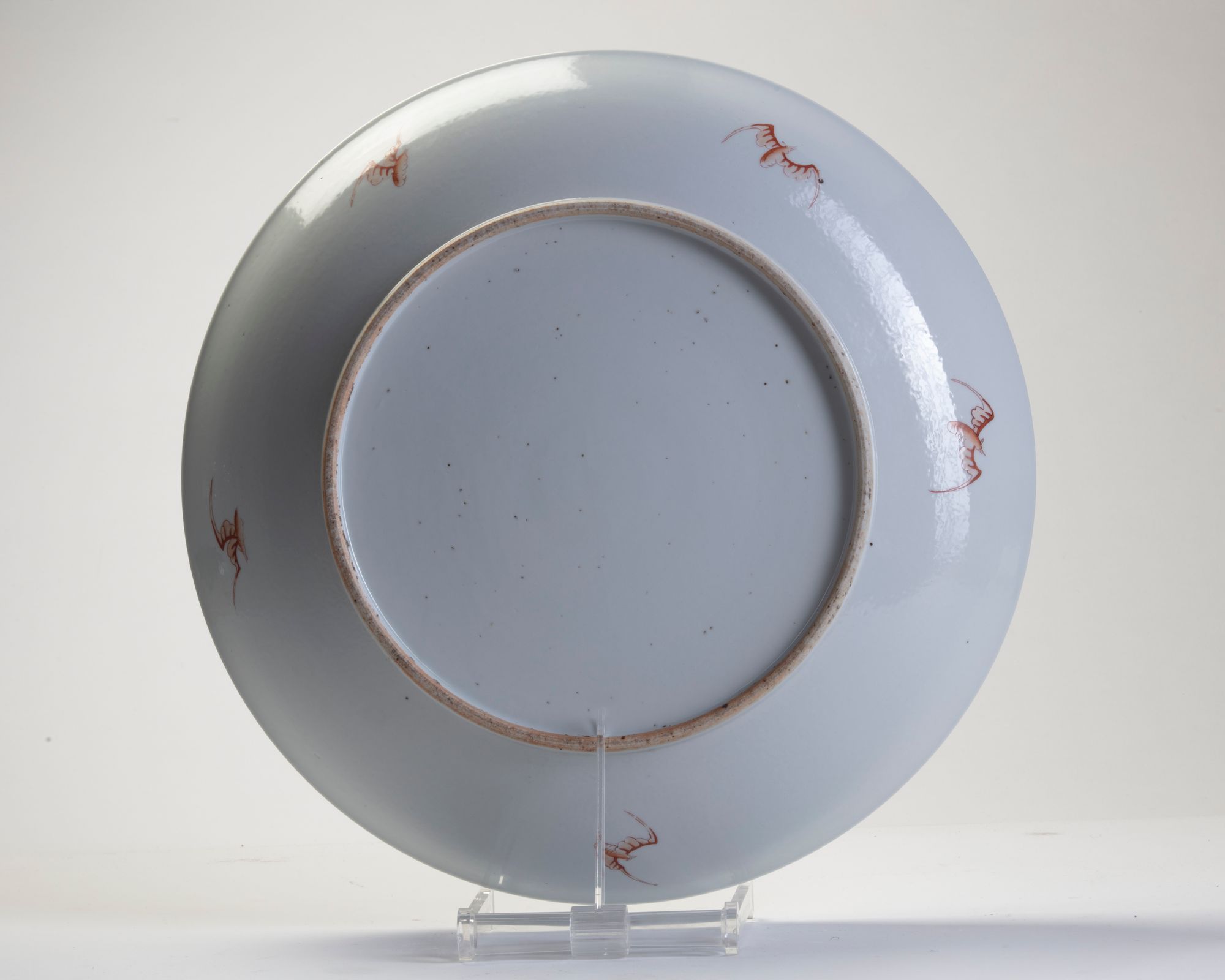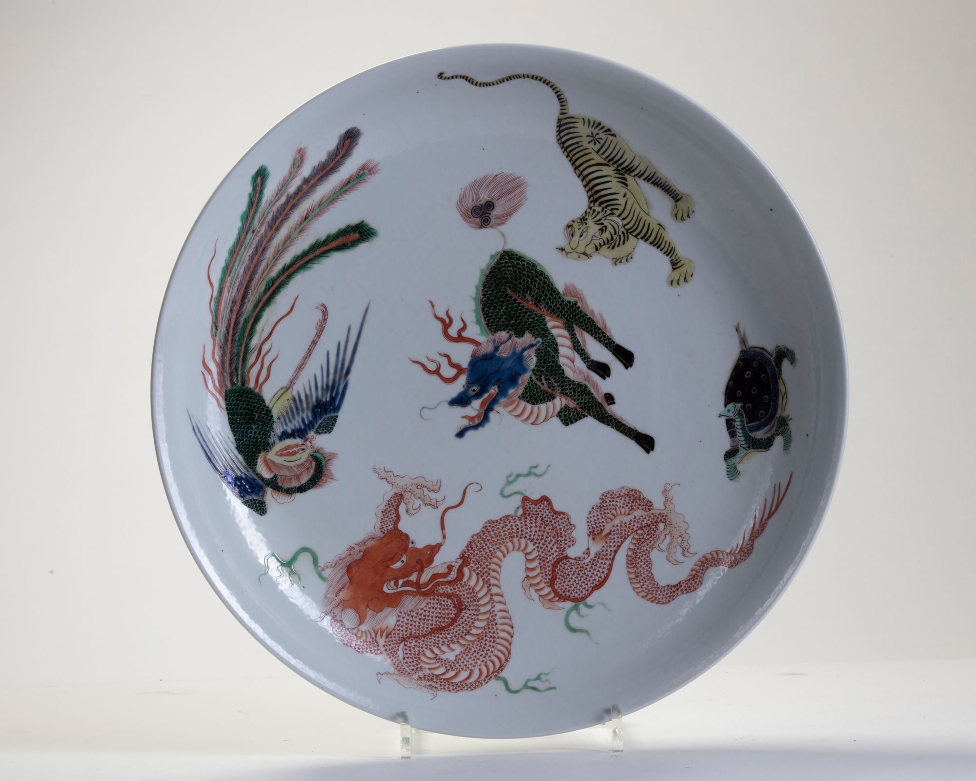 Decorated to the interior with mythical animals, five clawed leaping dragon, large phoenix with a chilong dragon, turtle and a large tiger. The reverse with iron-red Fu-bats.