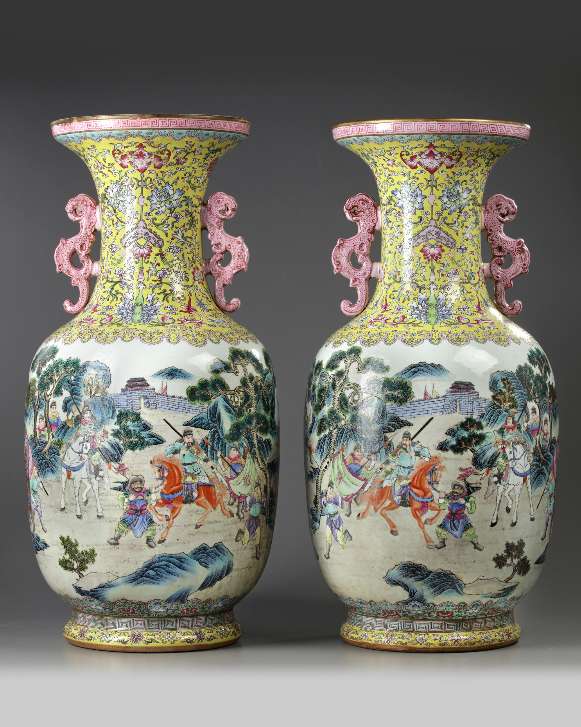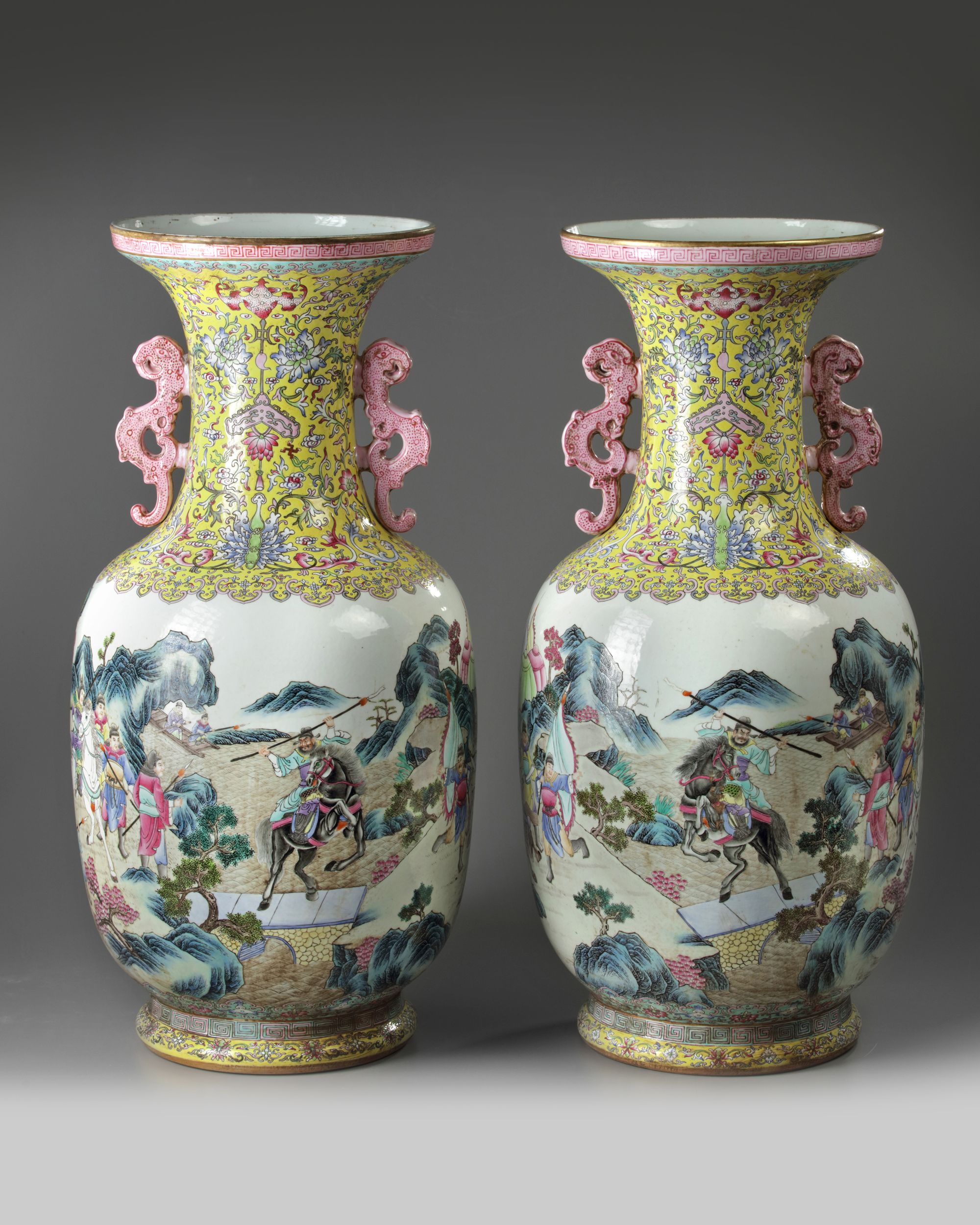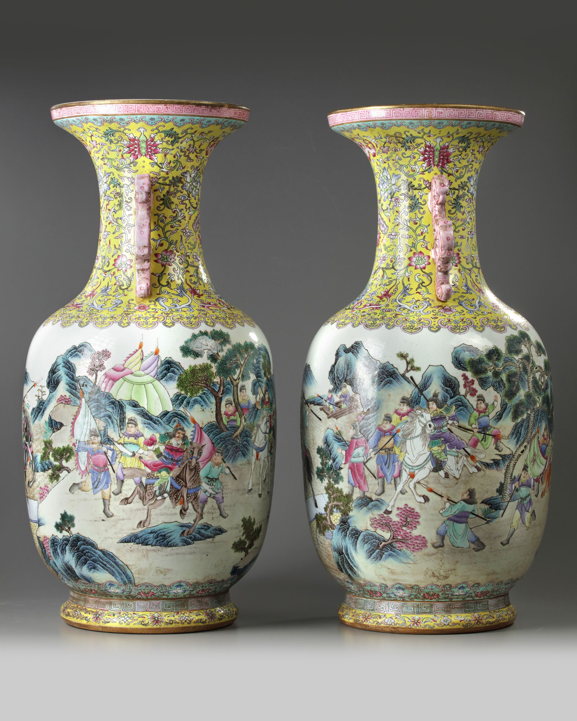 A PAIR OF LARGE CHINESE FAMILLE ROSE 'NARRATIVE' VASES