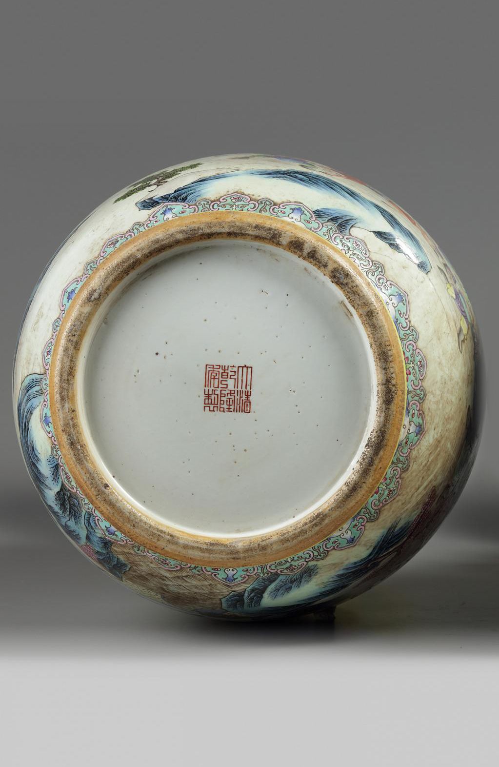 The vases is decorated with warriors in a rocky landscape, all below a neck decorated with stylised kui dragons amongst lotus scrolls. The is shoulder decorated with two stylised beast handles. With an apocryphal Qianlong marks to the base.