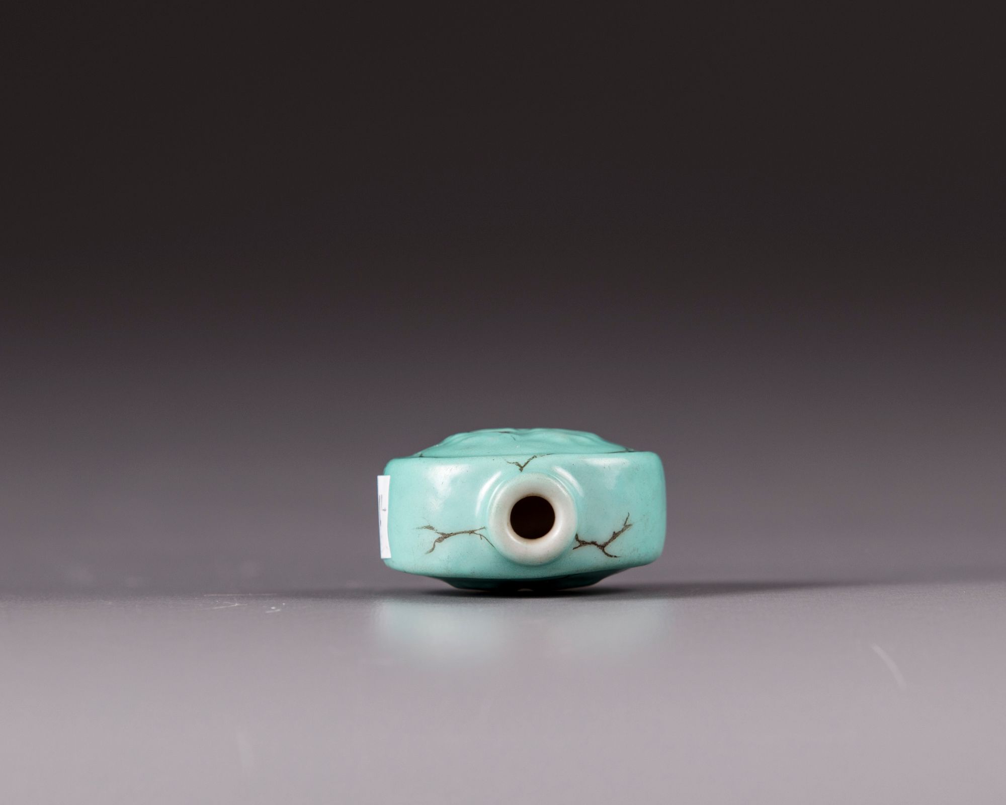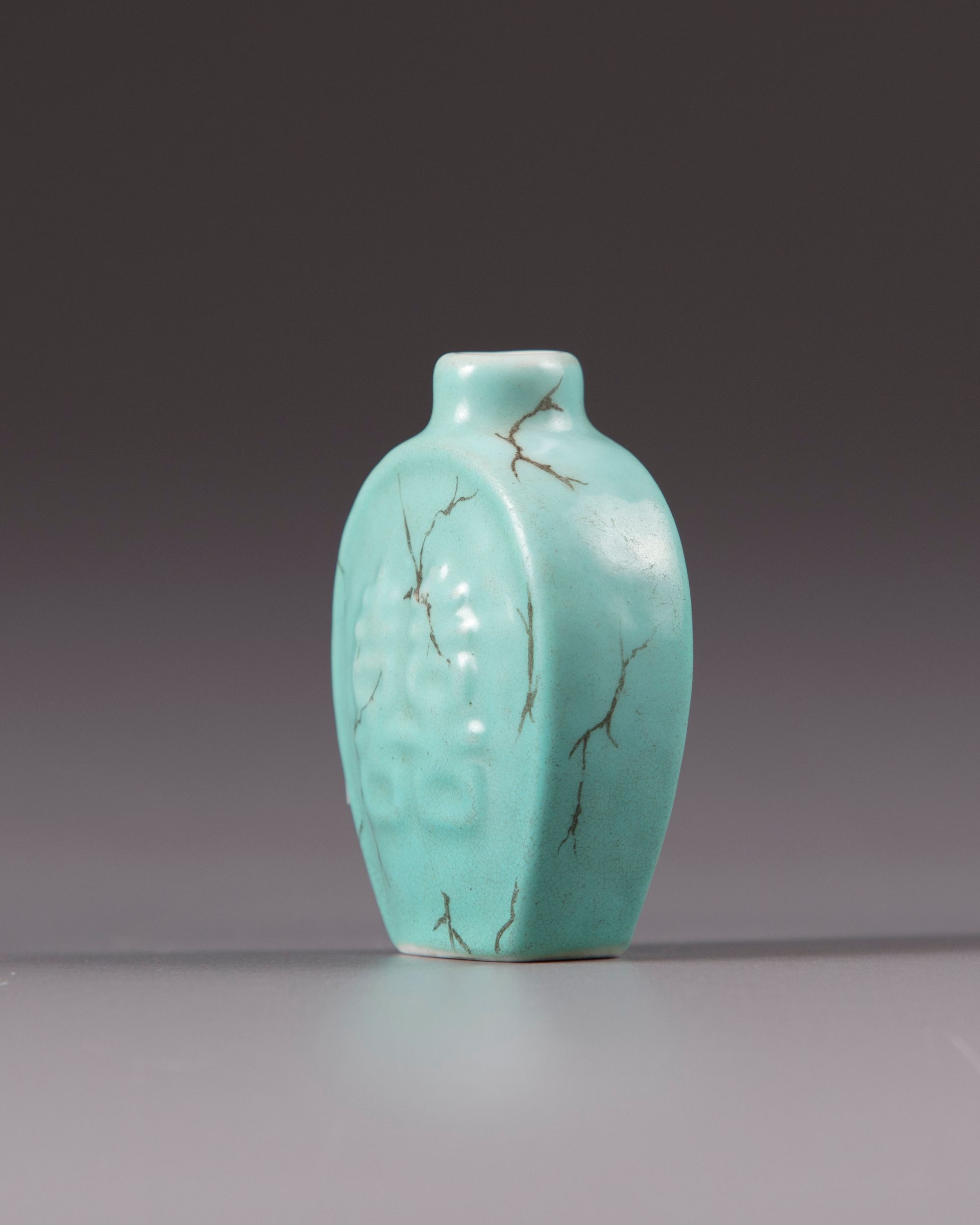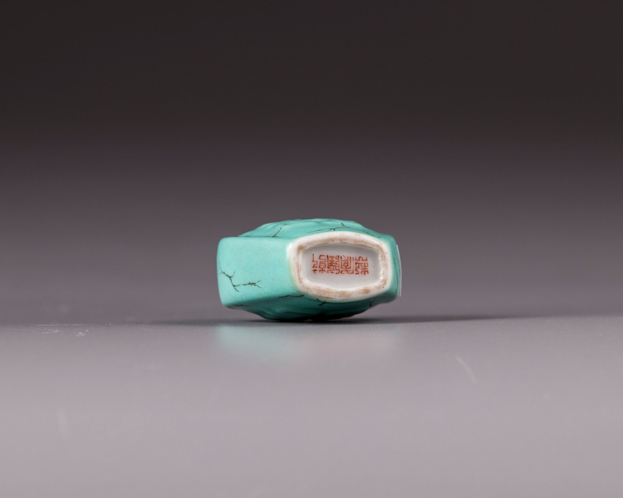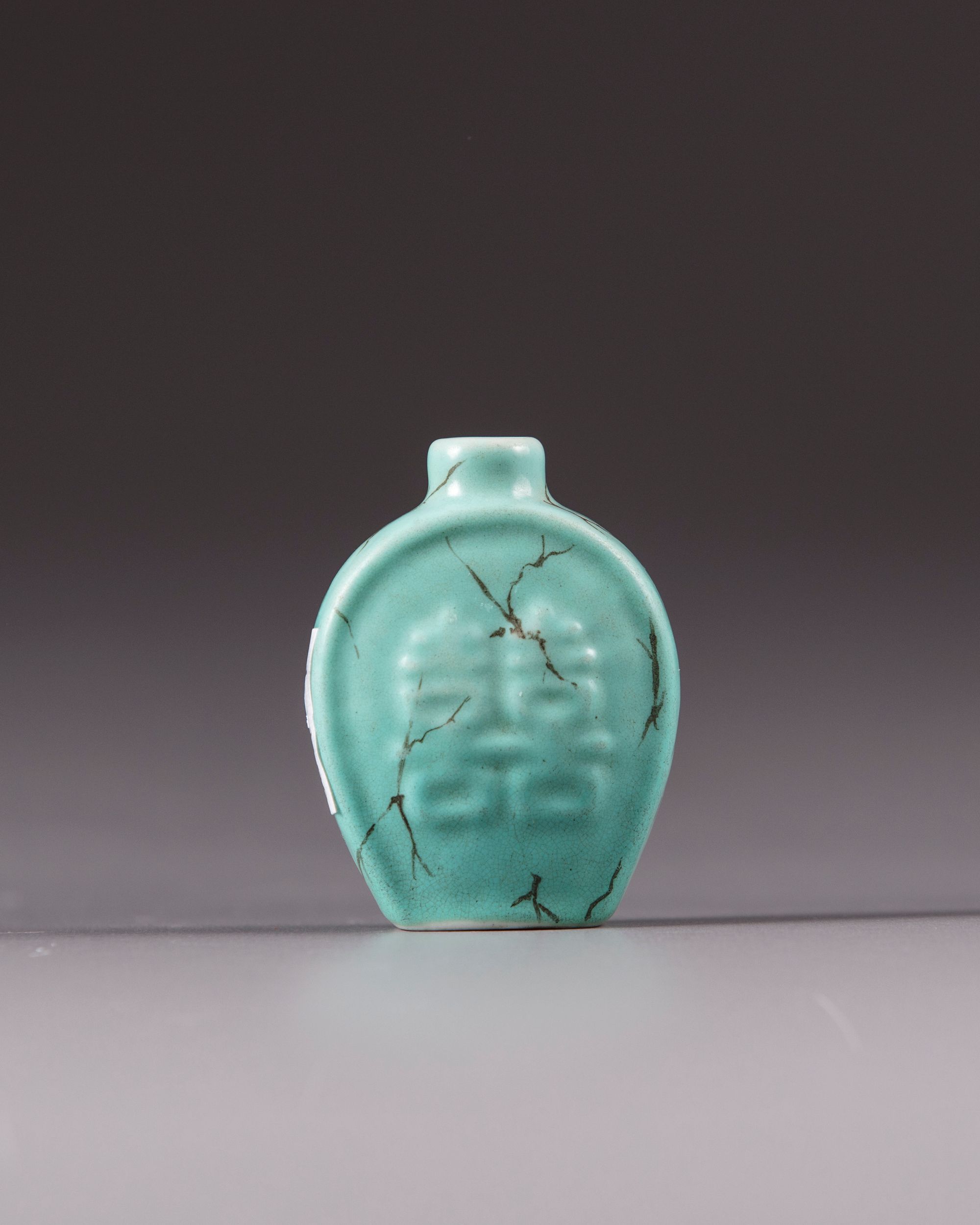 The vase is covered with a turquoise crackle glaze and decorated with Chinese double happiness characters. The unglazed base with a seal mark.