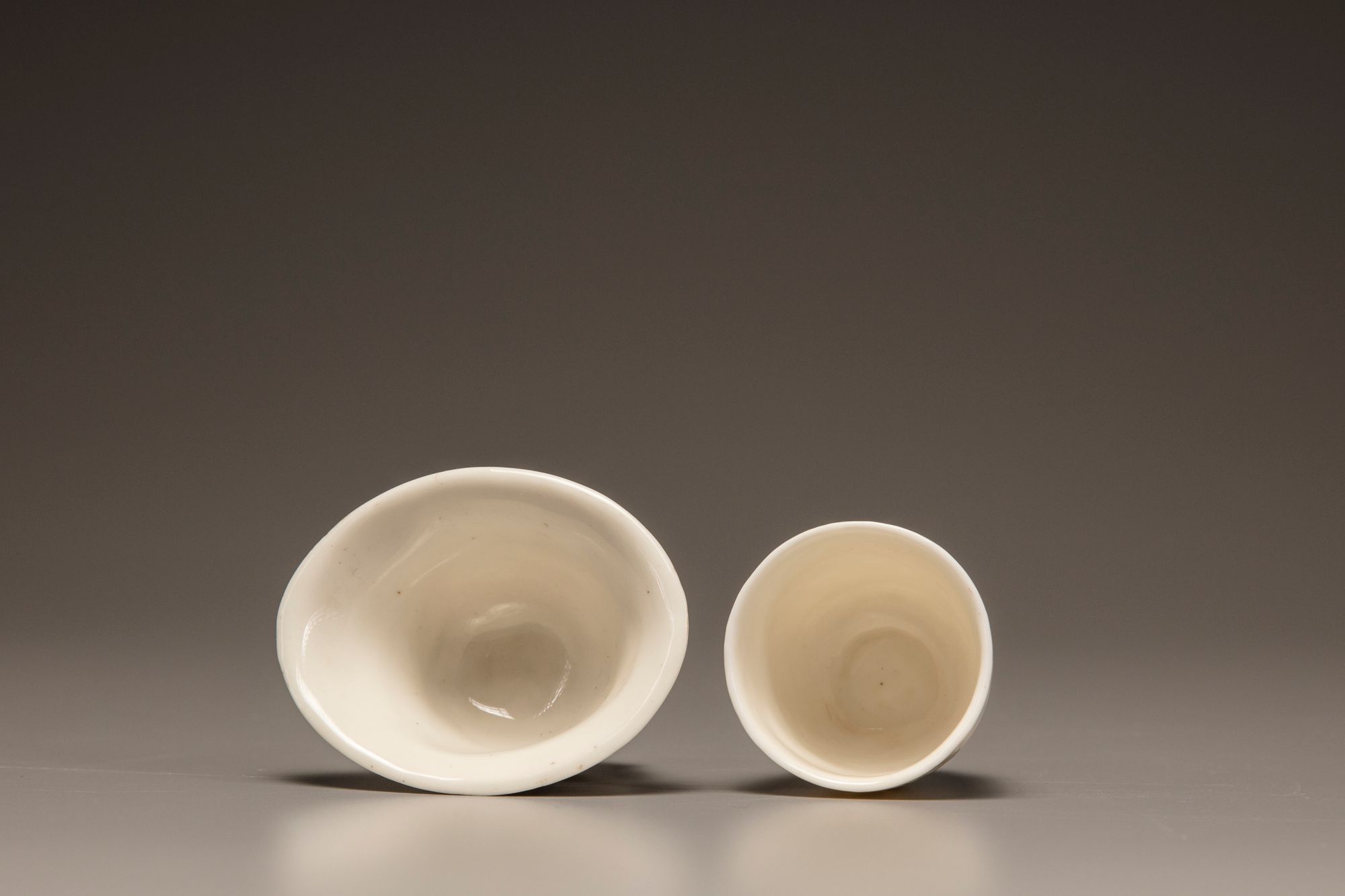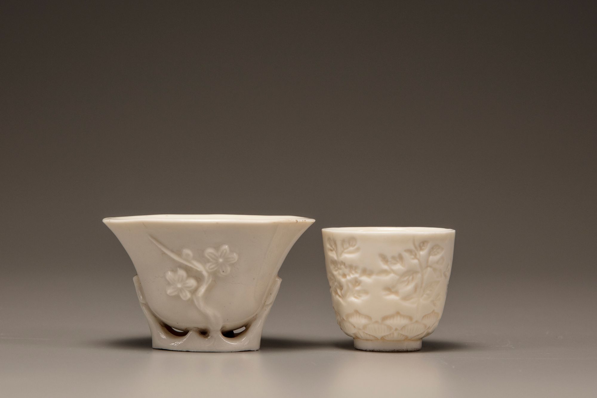 The first is shaped as a libation cup and is moulded with purnus branches, the trunk of the tree forms the stand for the cup. The second is a wine cup with impressed floral sprays and a petal band to the foot.
