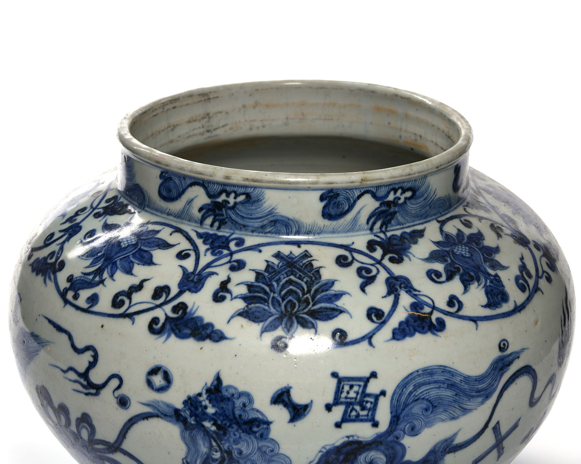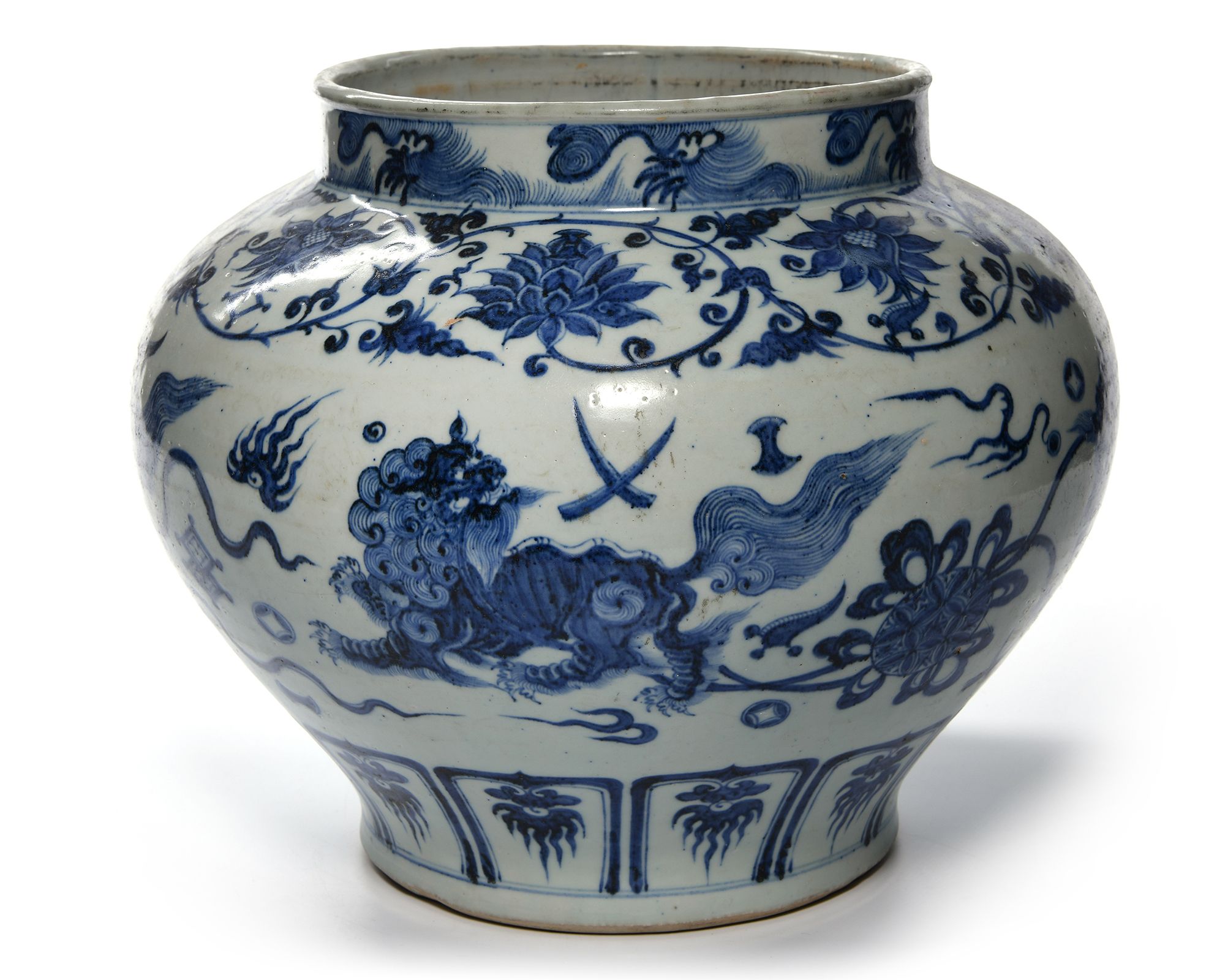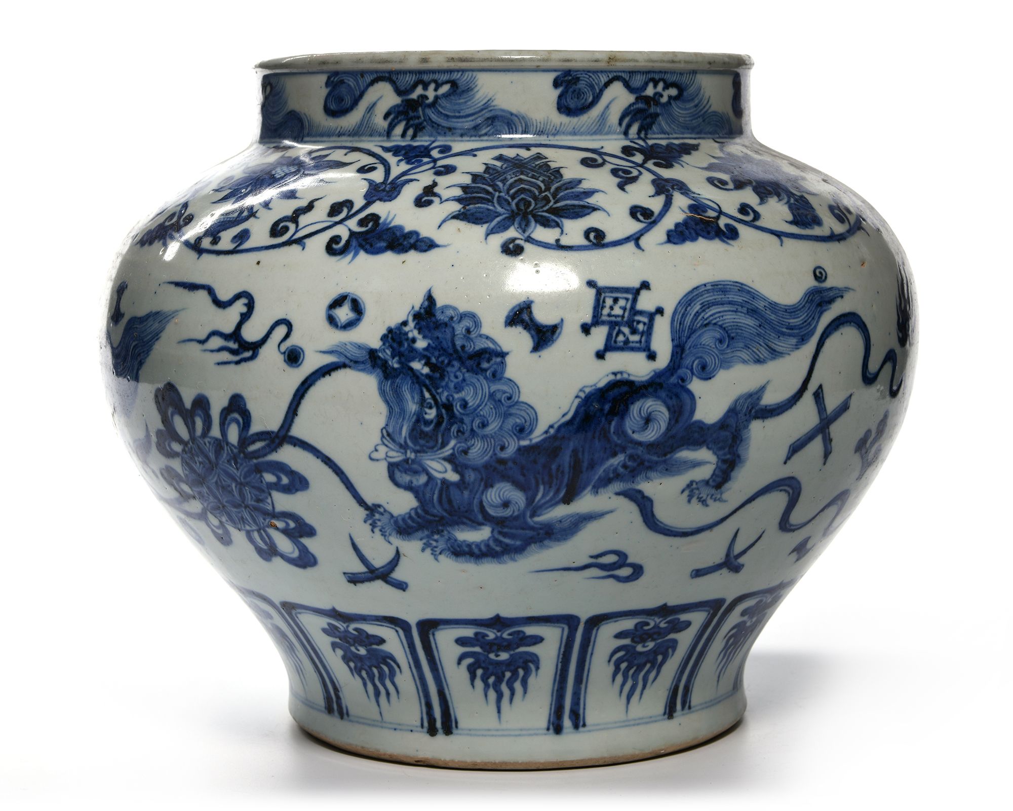 A Chinese porcelain jar decorated in cobalt blue with Buddhist lions chasing balls knotted with ribbons, between a large lotus and chrysanthemum scroll with foliage and a petal lappet border to the base.