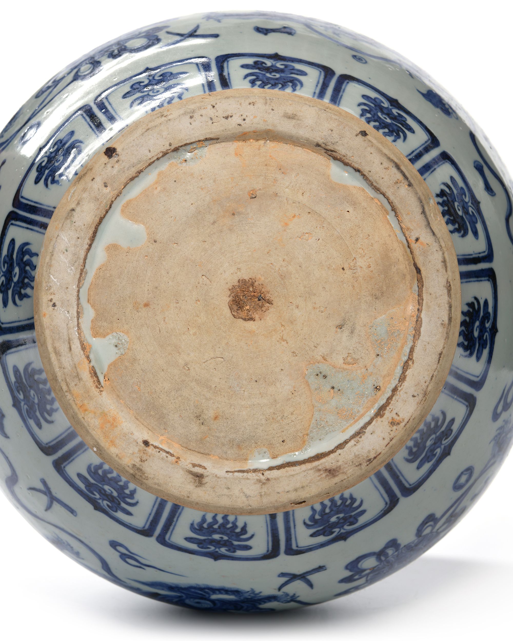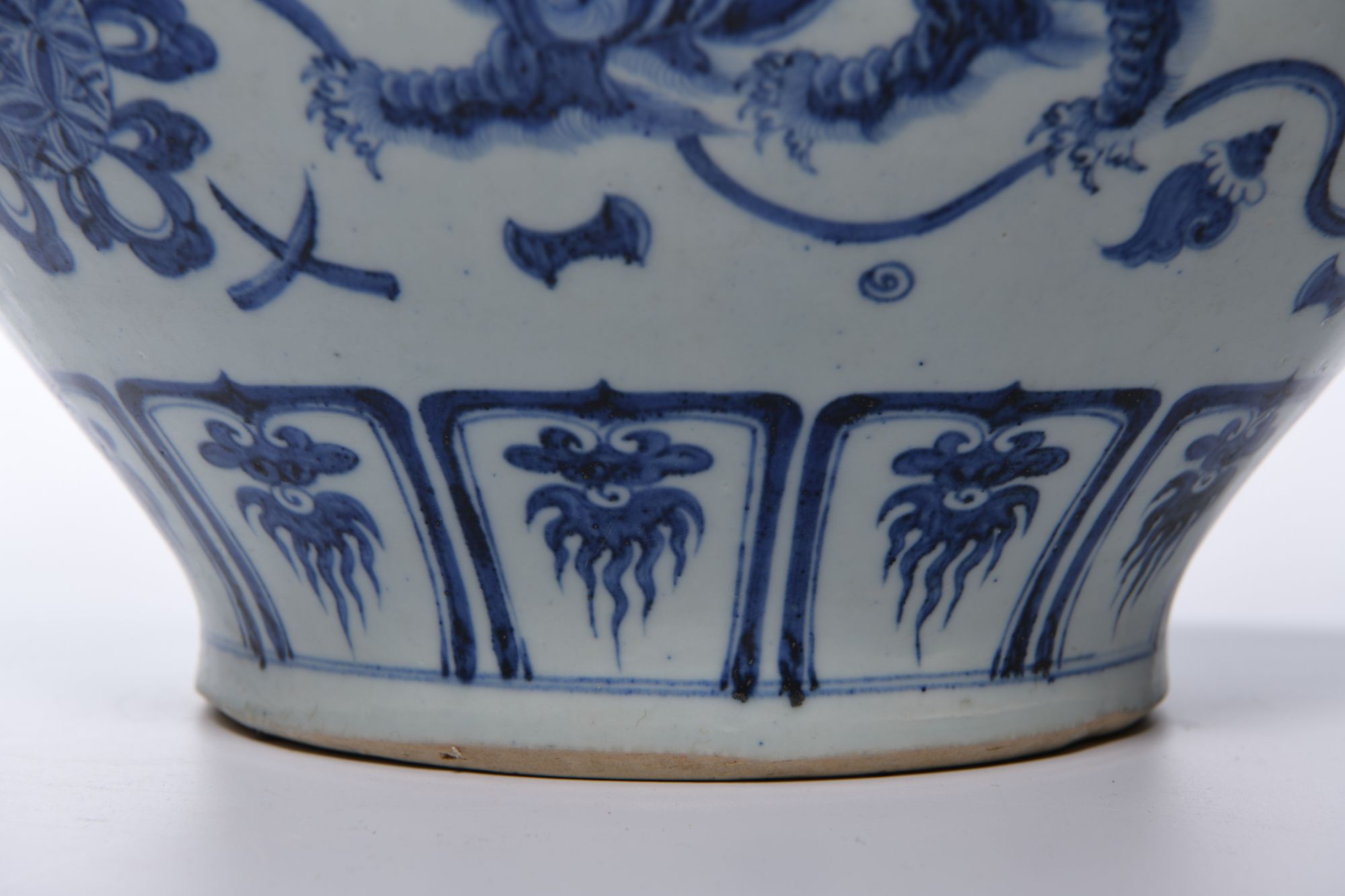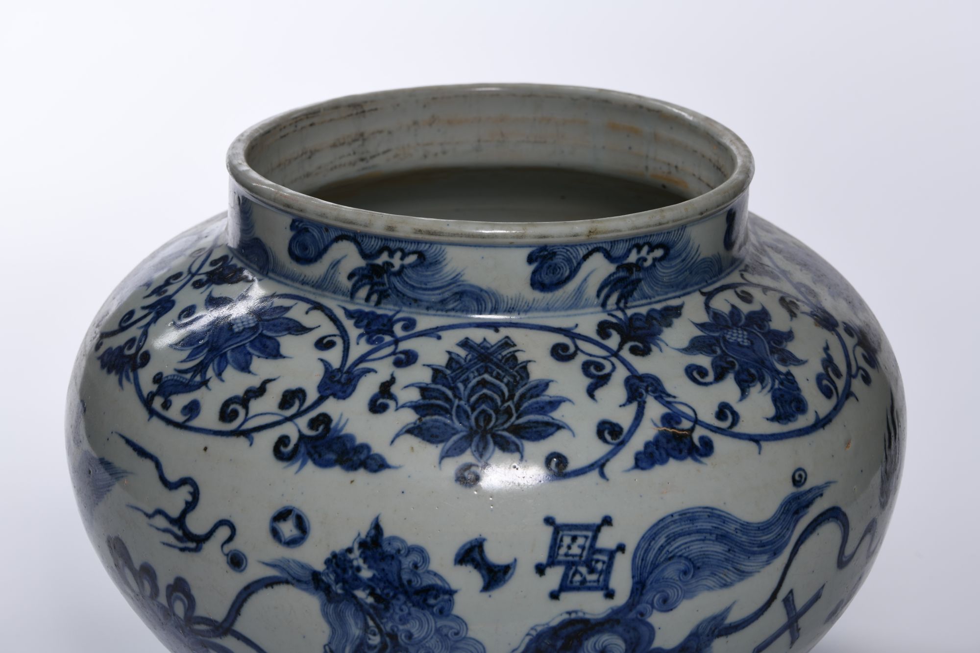 A Chinese porcelain jar decorated in cobalt blue with Buddhist lions chasing balls knotted with ribbons, between a large lotus and chrysanthemum scroll with foliage and a petal lappet border to the base.