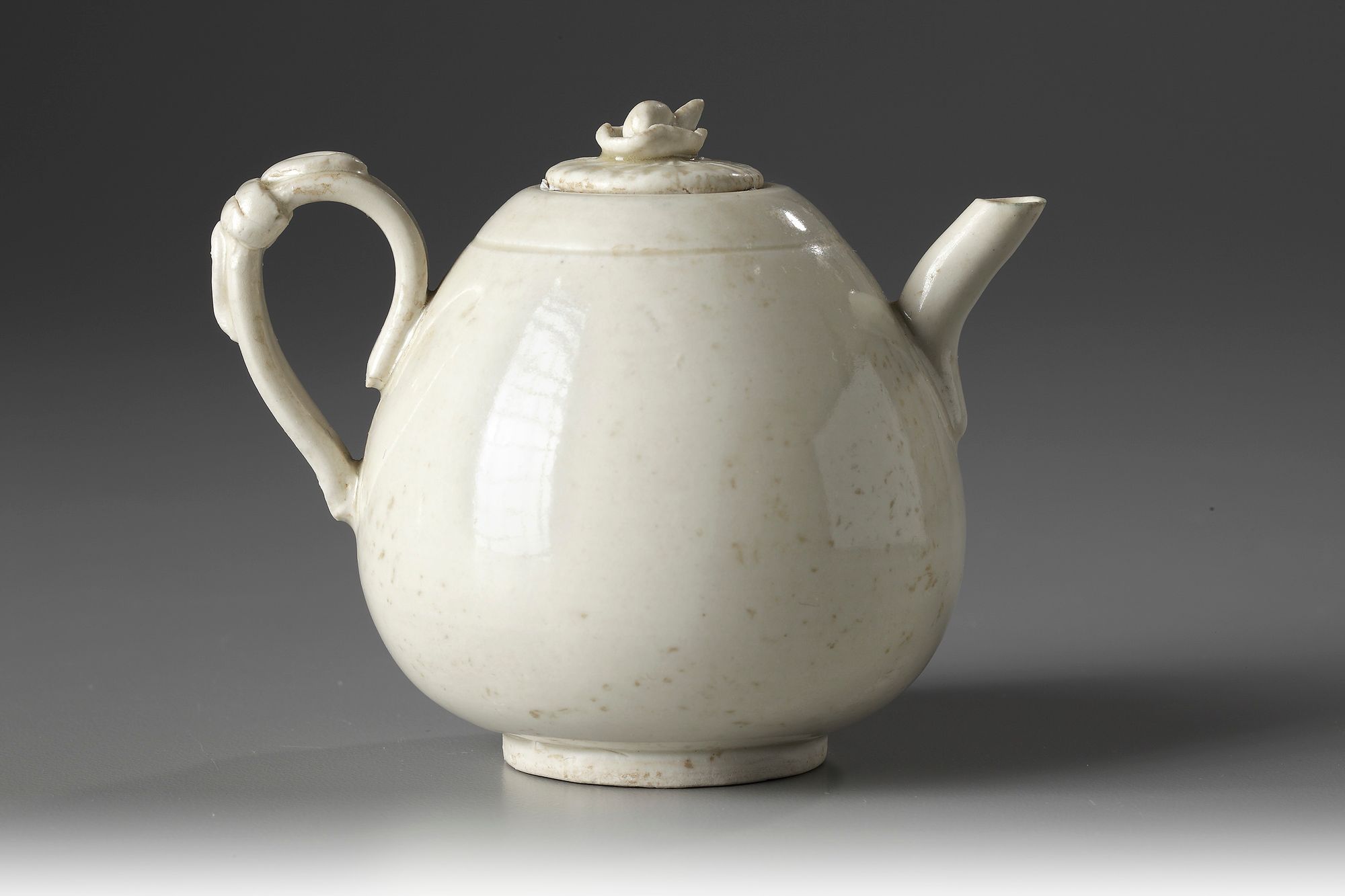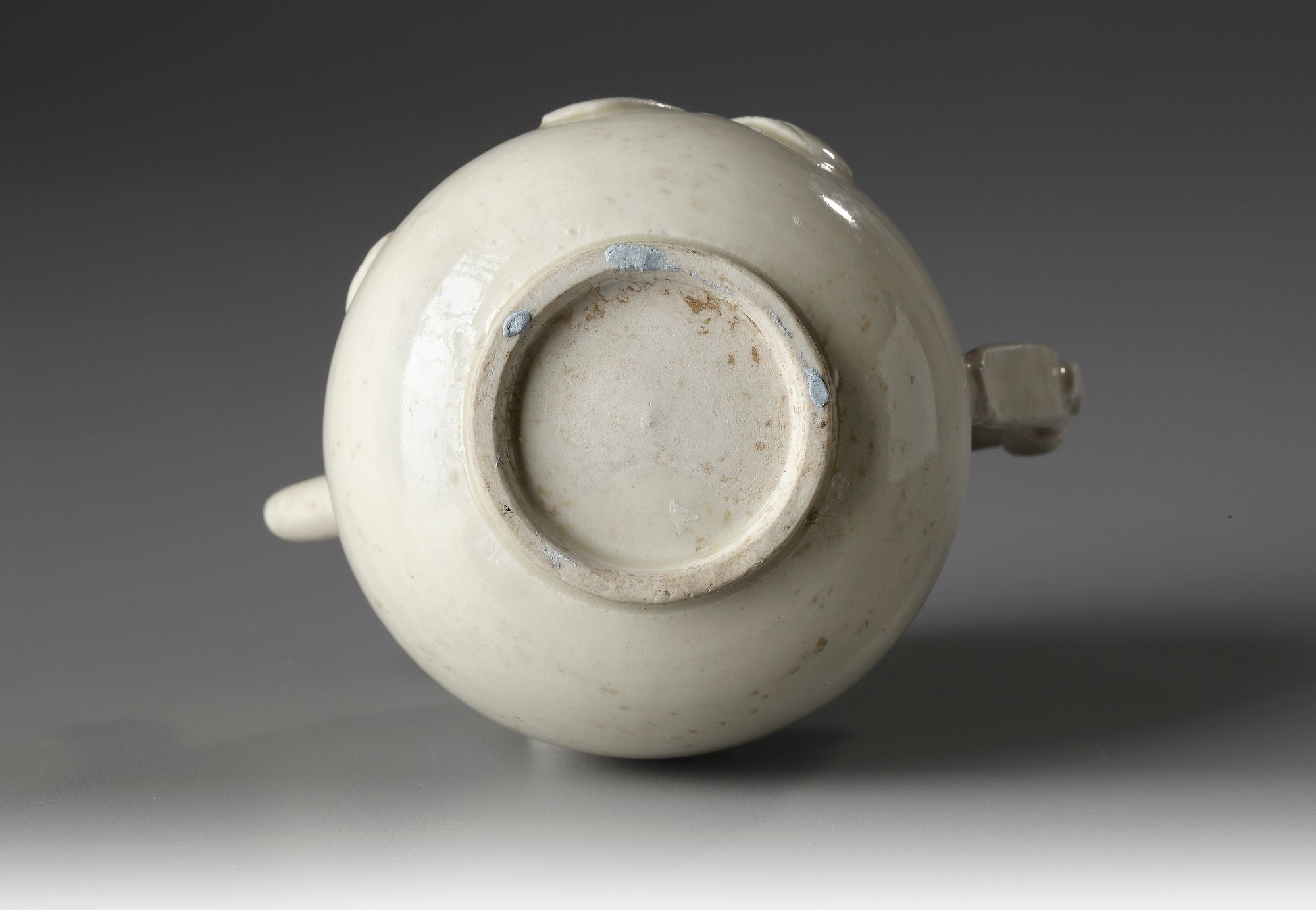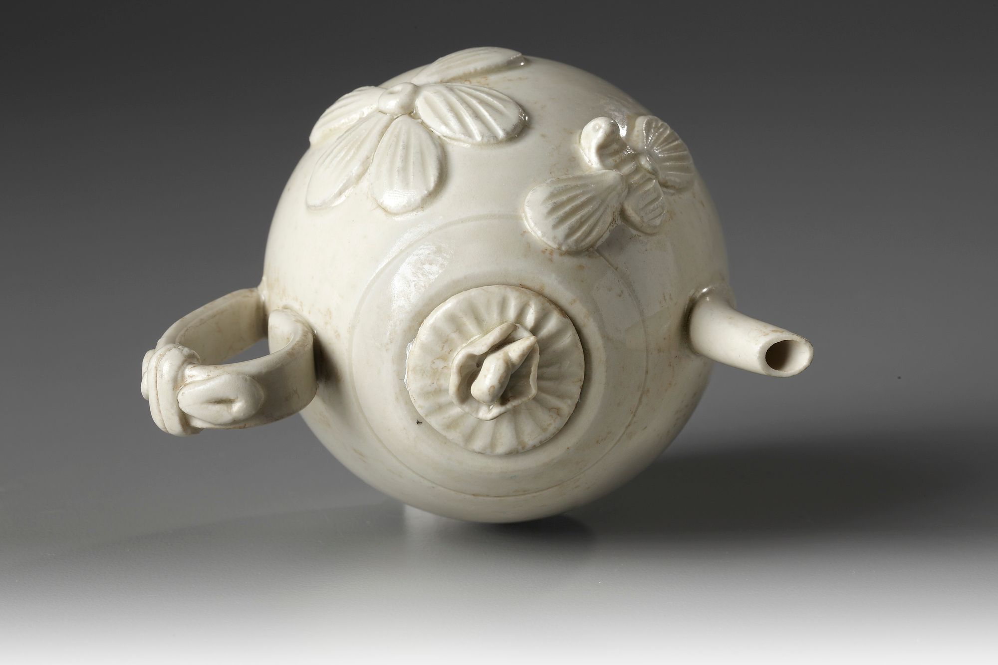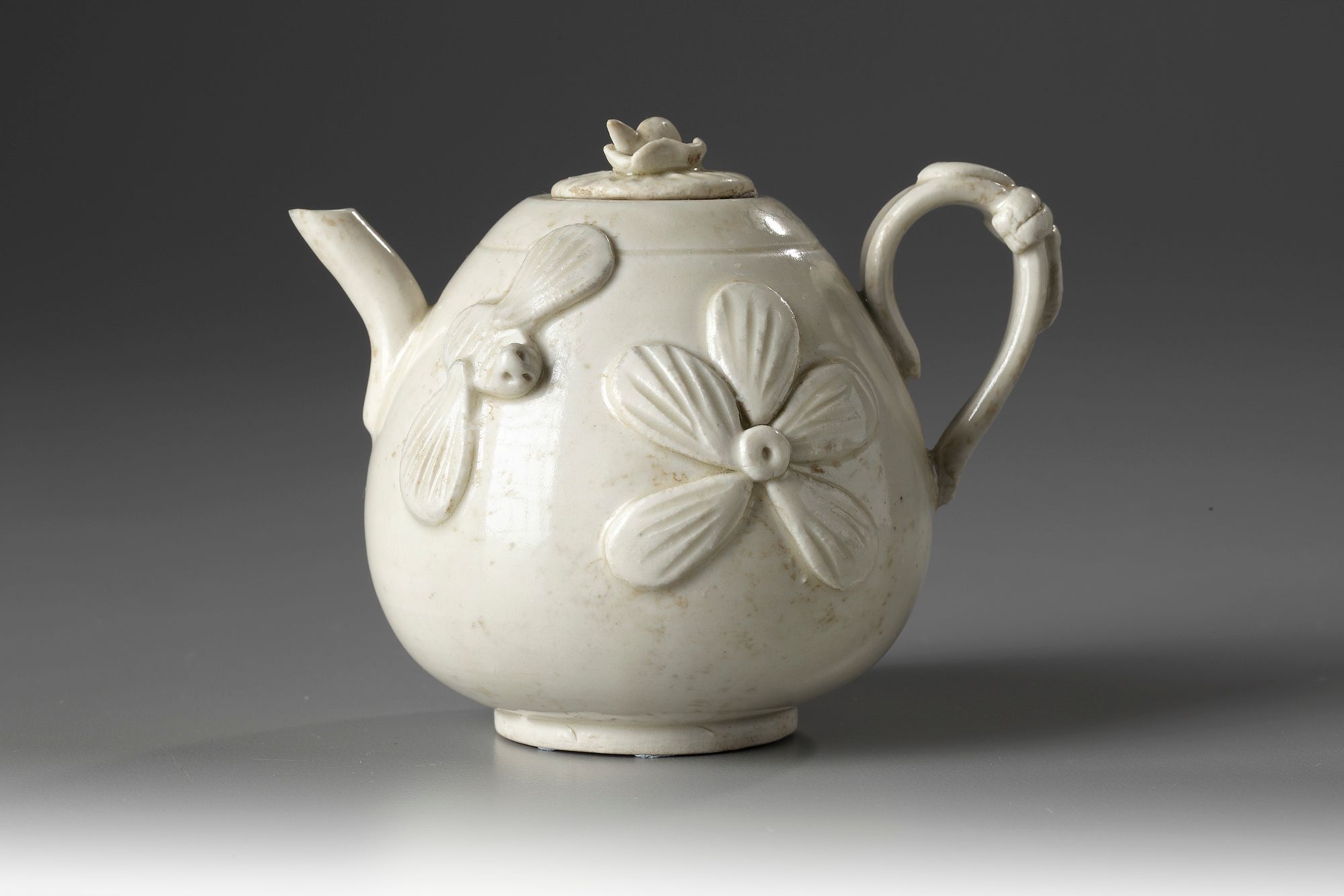 with a full round body and a vigorously stretched handle and spout, the body with an applied flower and flying insect.