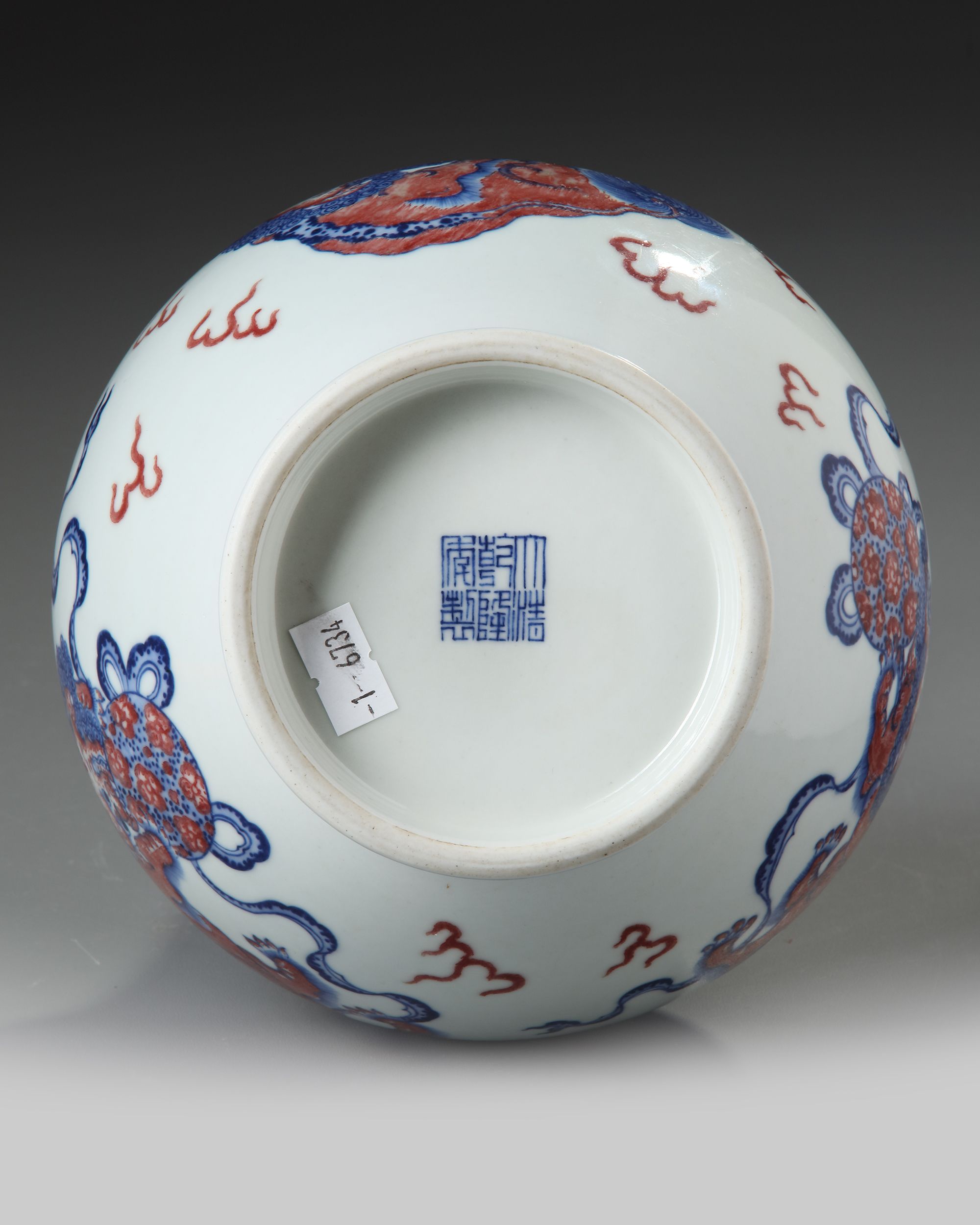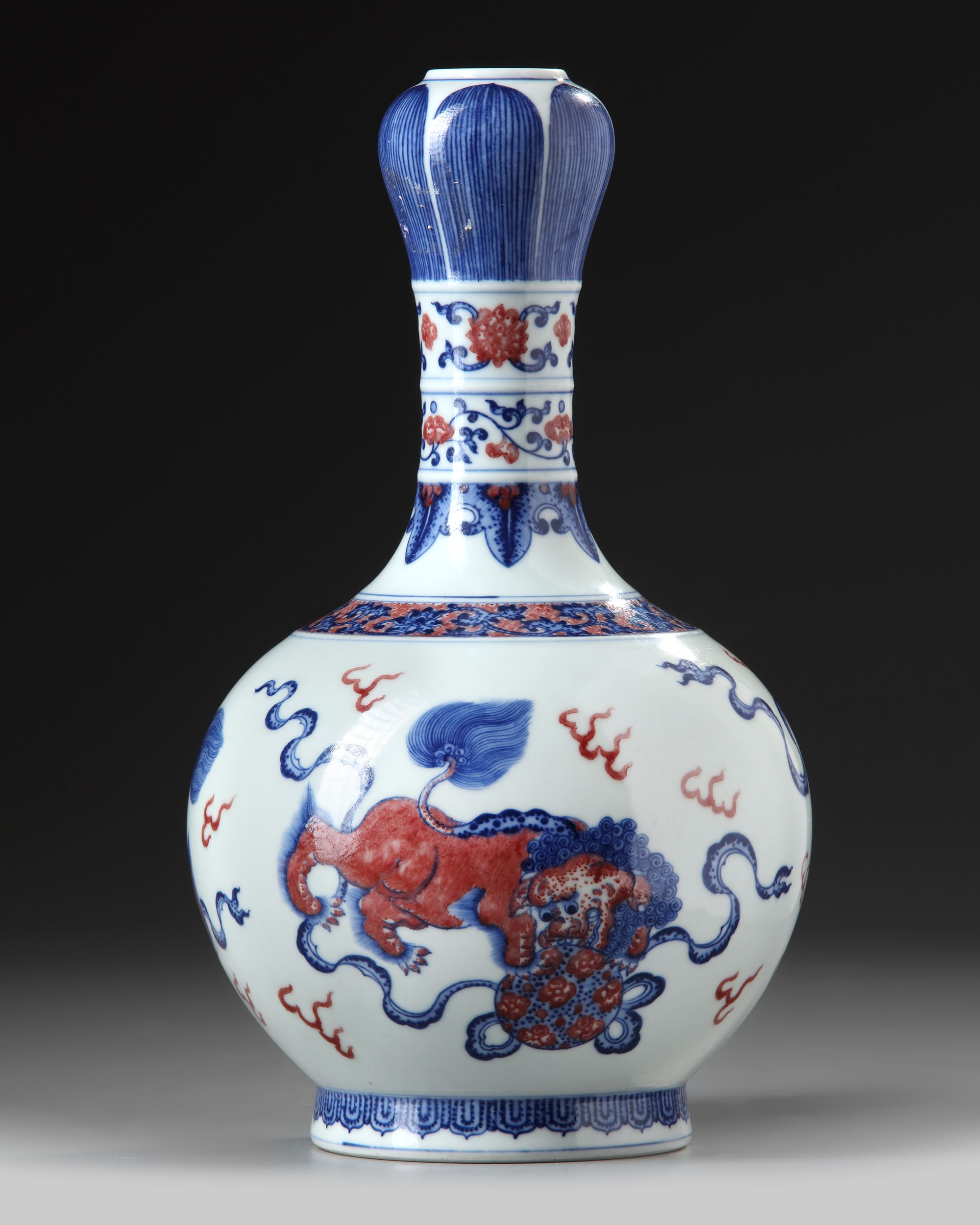 The vase is decorated to the bulbous lower body with three Buddhist lions playing with beribboned brocade balls amongst flame scrolls, above a lappet band at the foot. The neck is decorated with a raised rib between atop bands of flowers and a stiff leaf band to the rim. The base marked with a Chinese Qianlong seal mark.