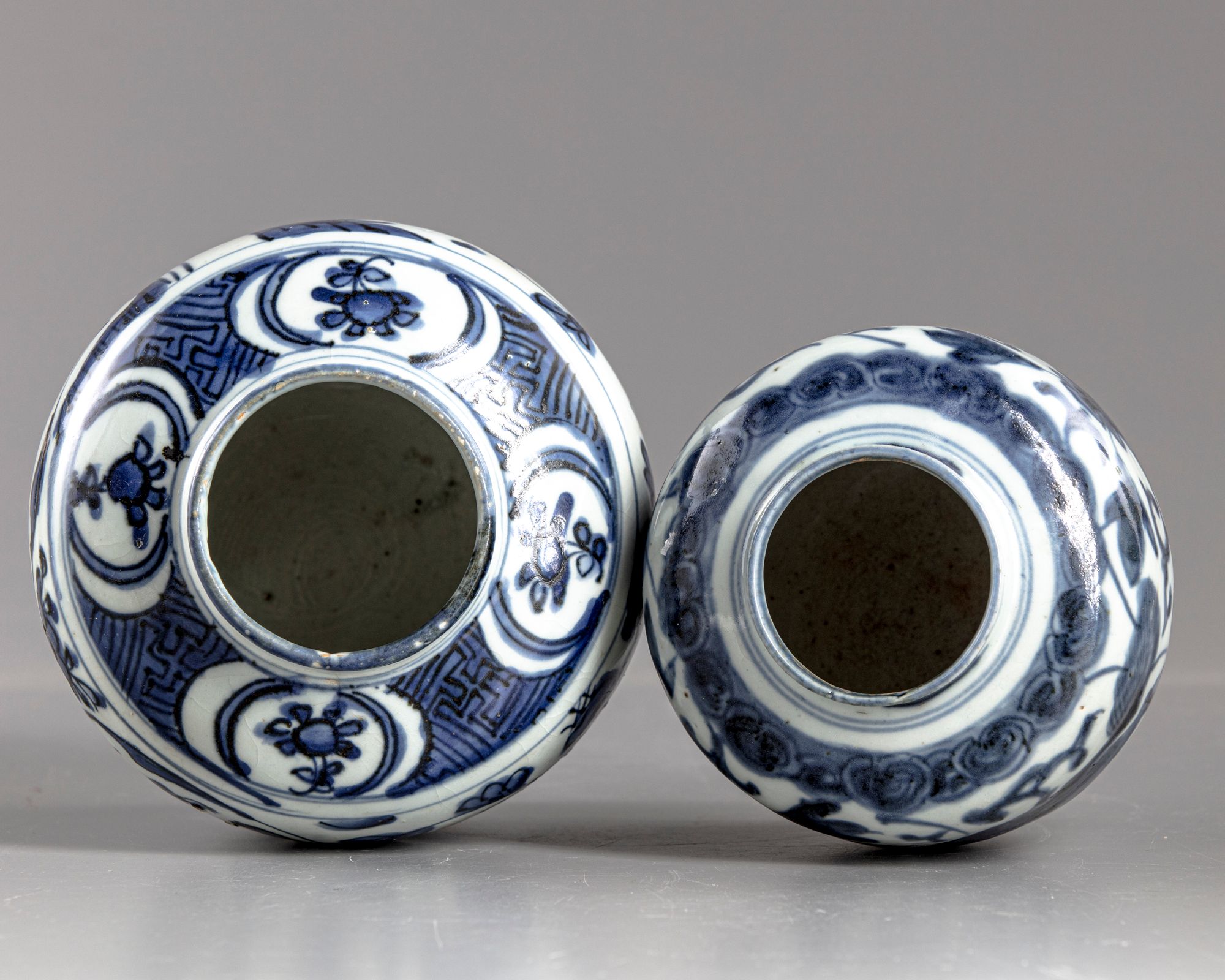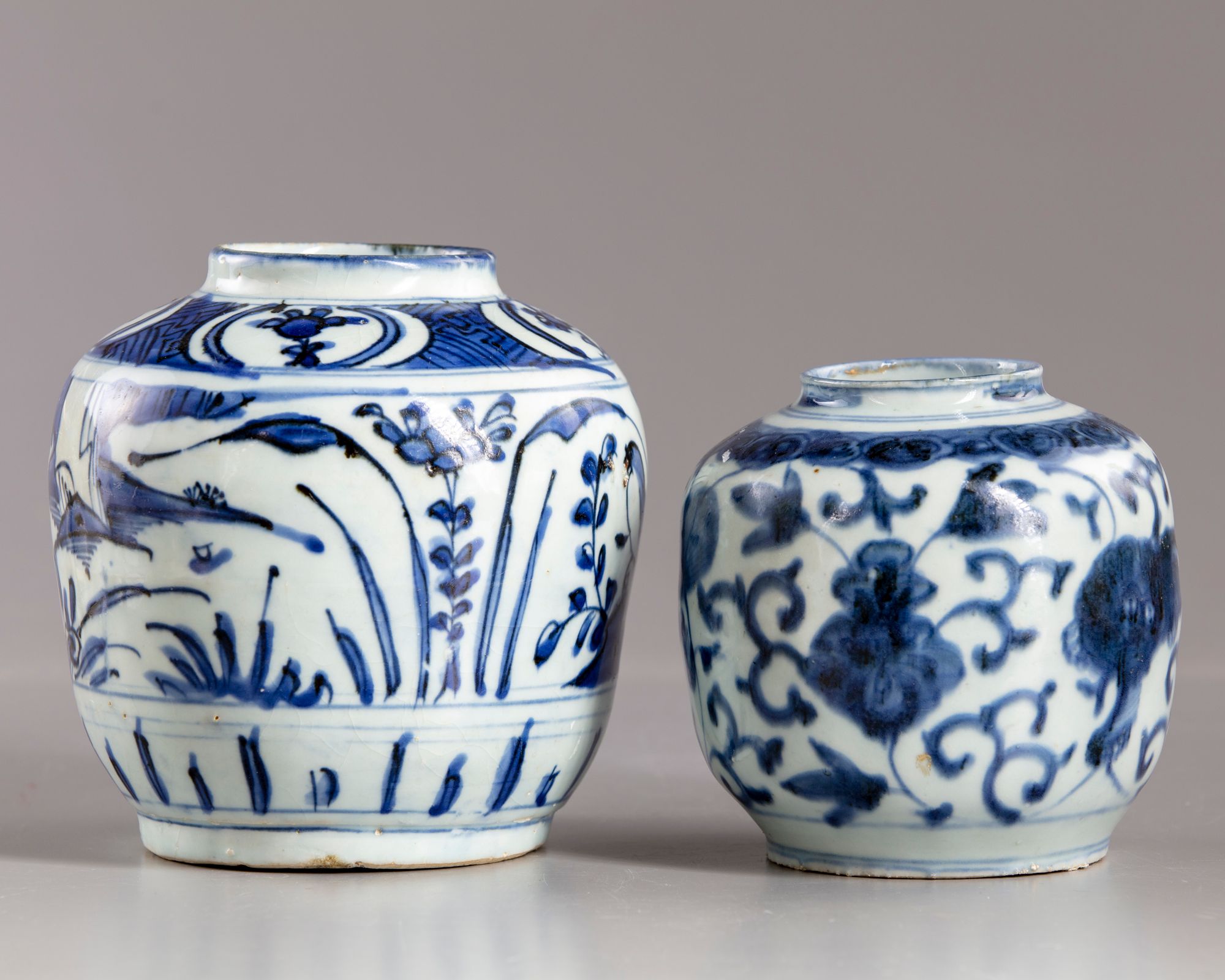 Two Chinese ginger jars , decorated in cobalt-blue with flowers and foliage, 15. 18 cm.