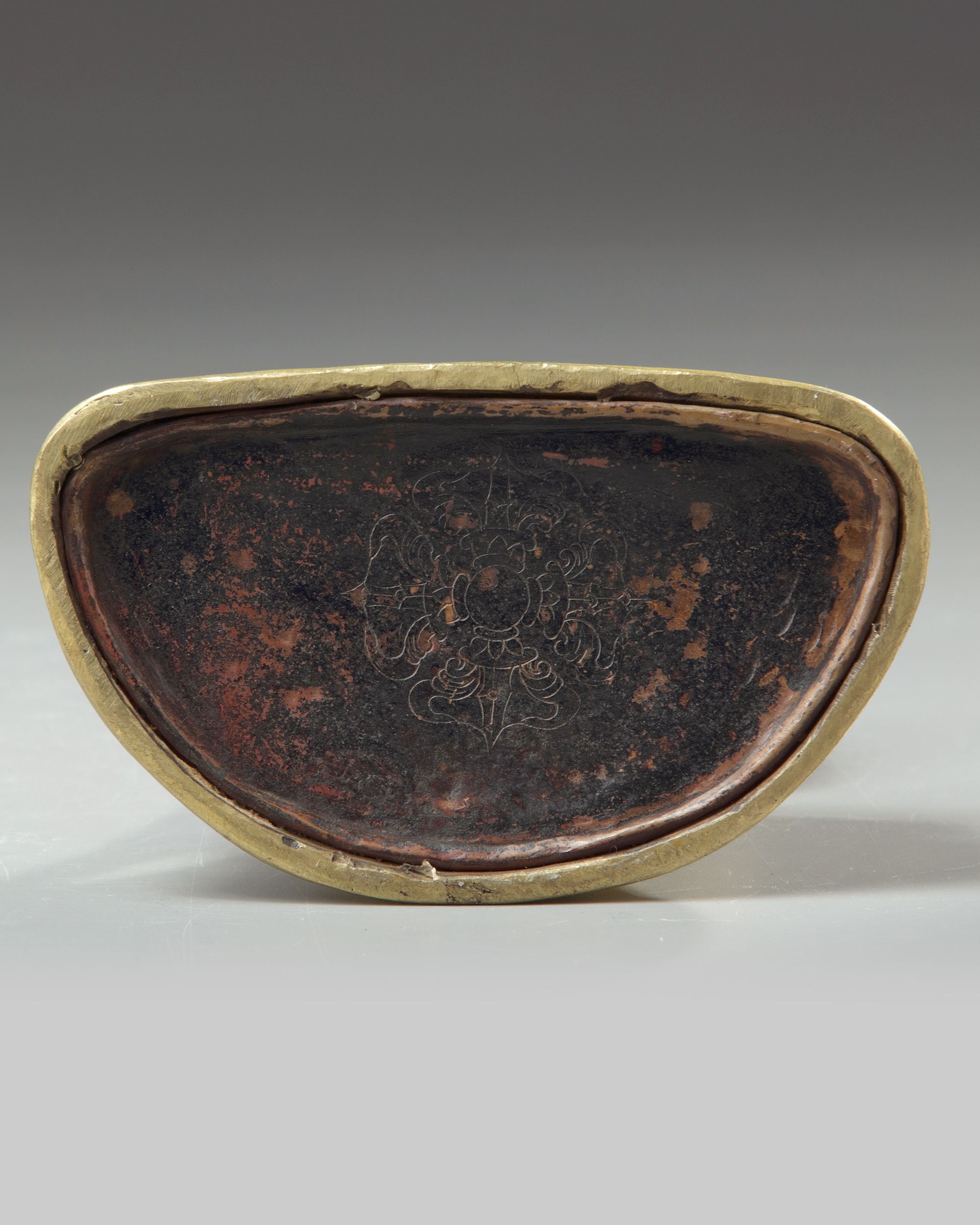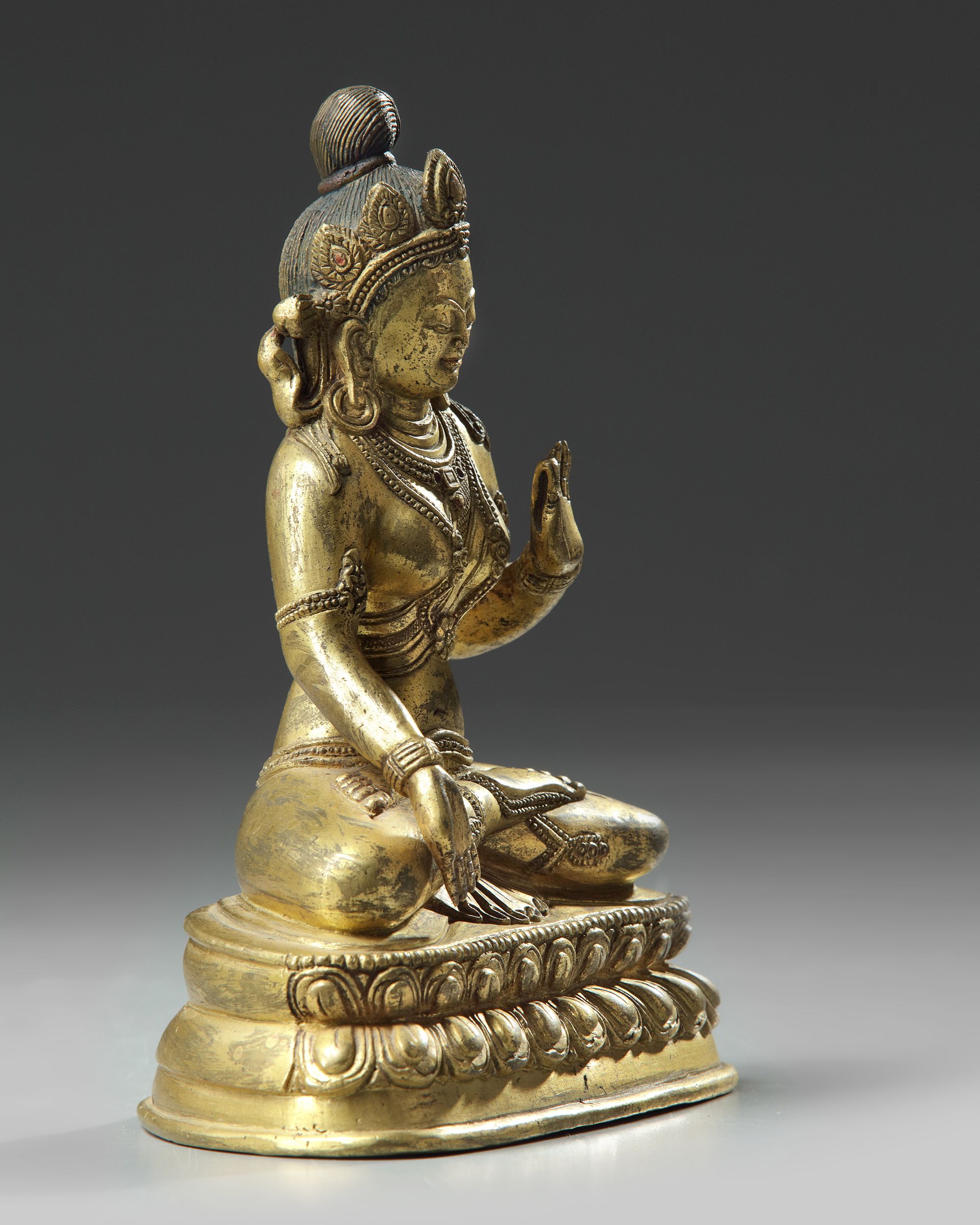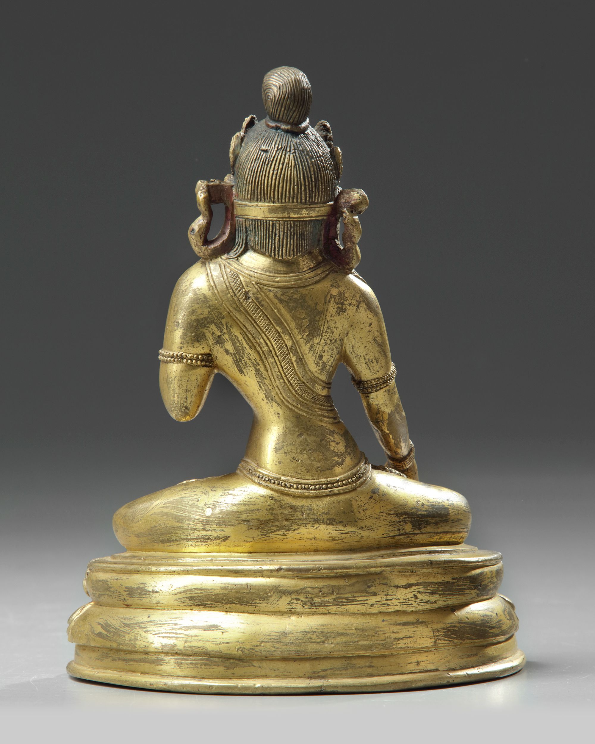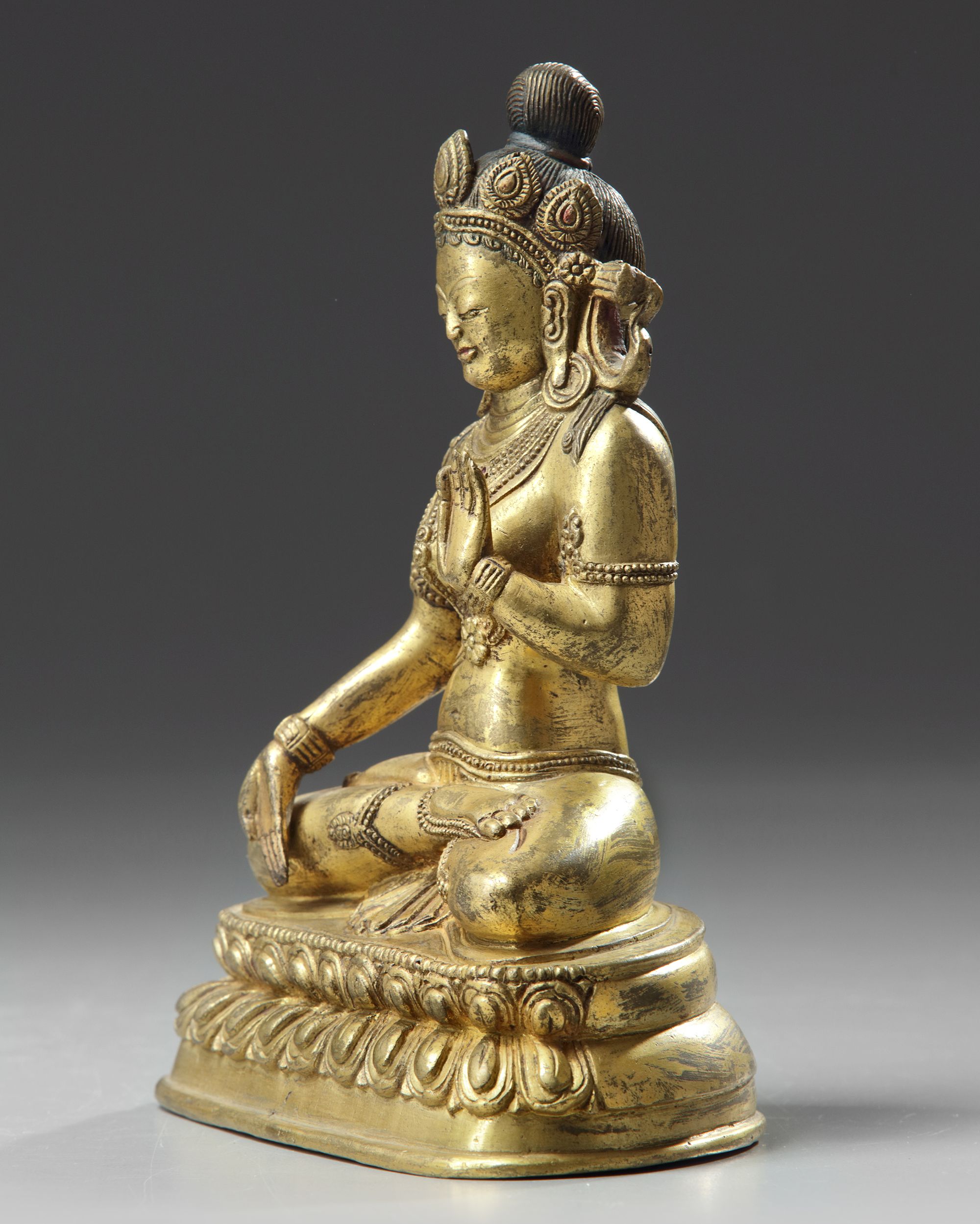 The figure is seated in dhyanasana on a double-lotus base. Her right hand is in varada mudra and her left raised in vitarka mudra. Her hair is fashioned into a high chignon behind a foliate tiara. The base is sealed and incised with a double-vajra.