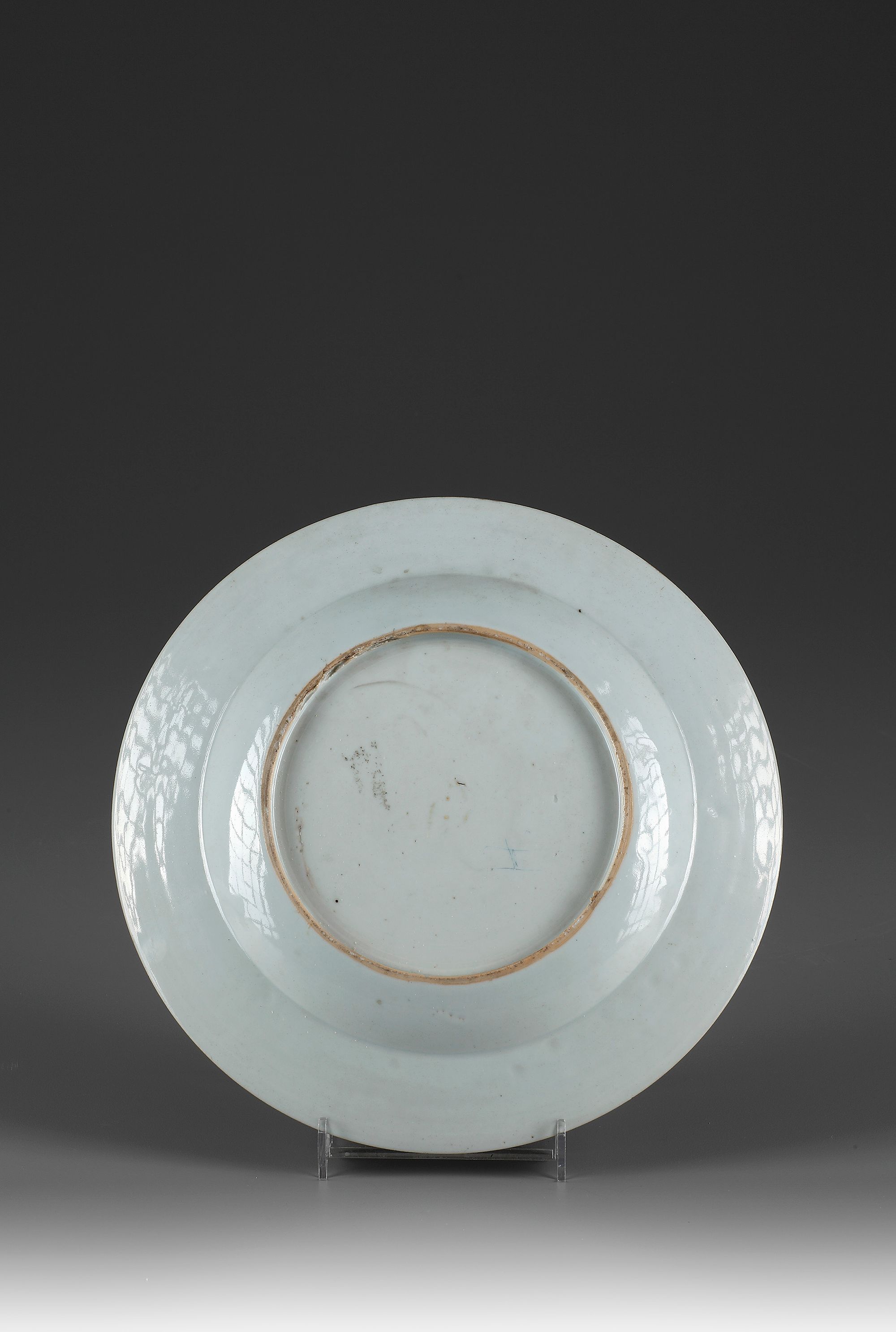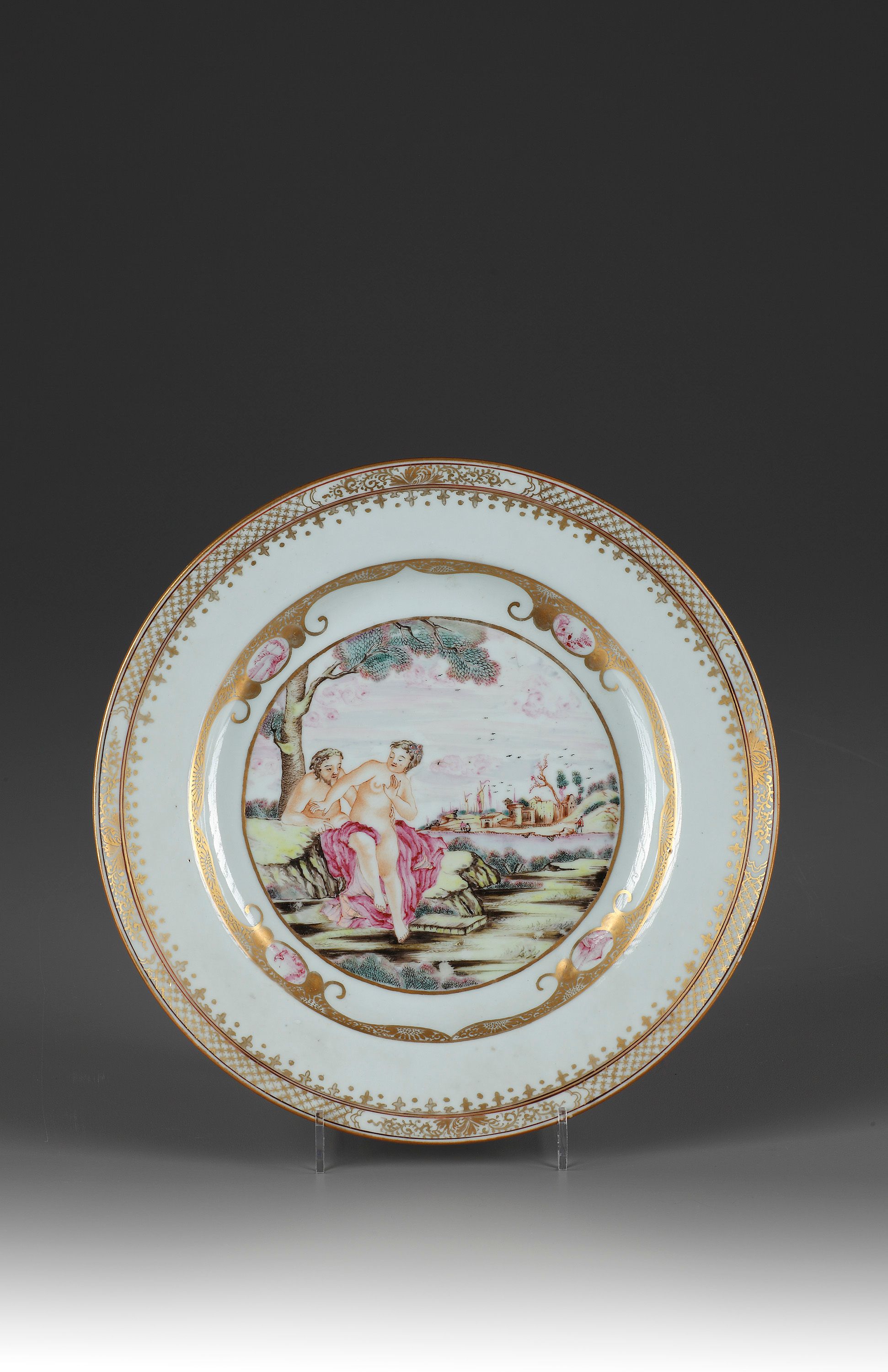 On foot ring with a flat rim, decorated with a pair of scantly-clad lovers seated below a tree.