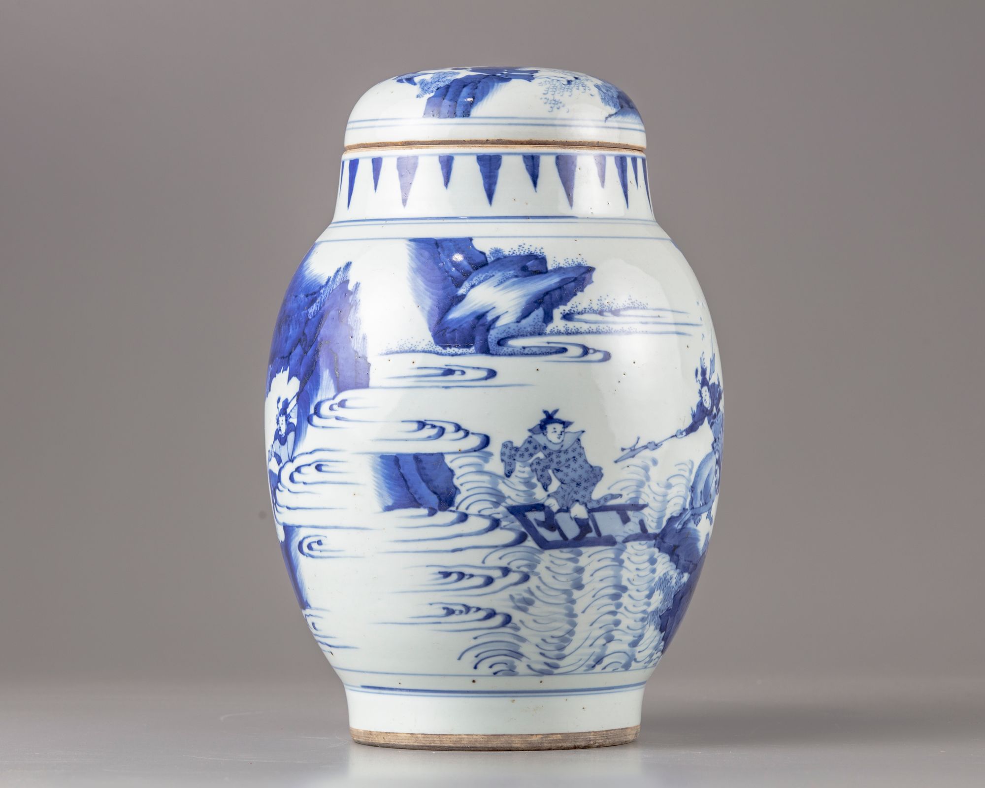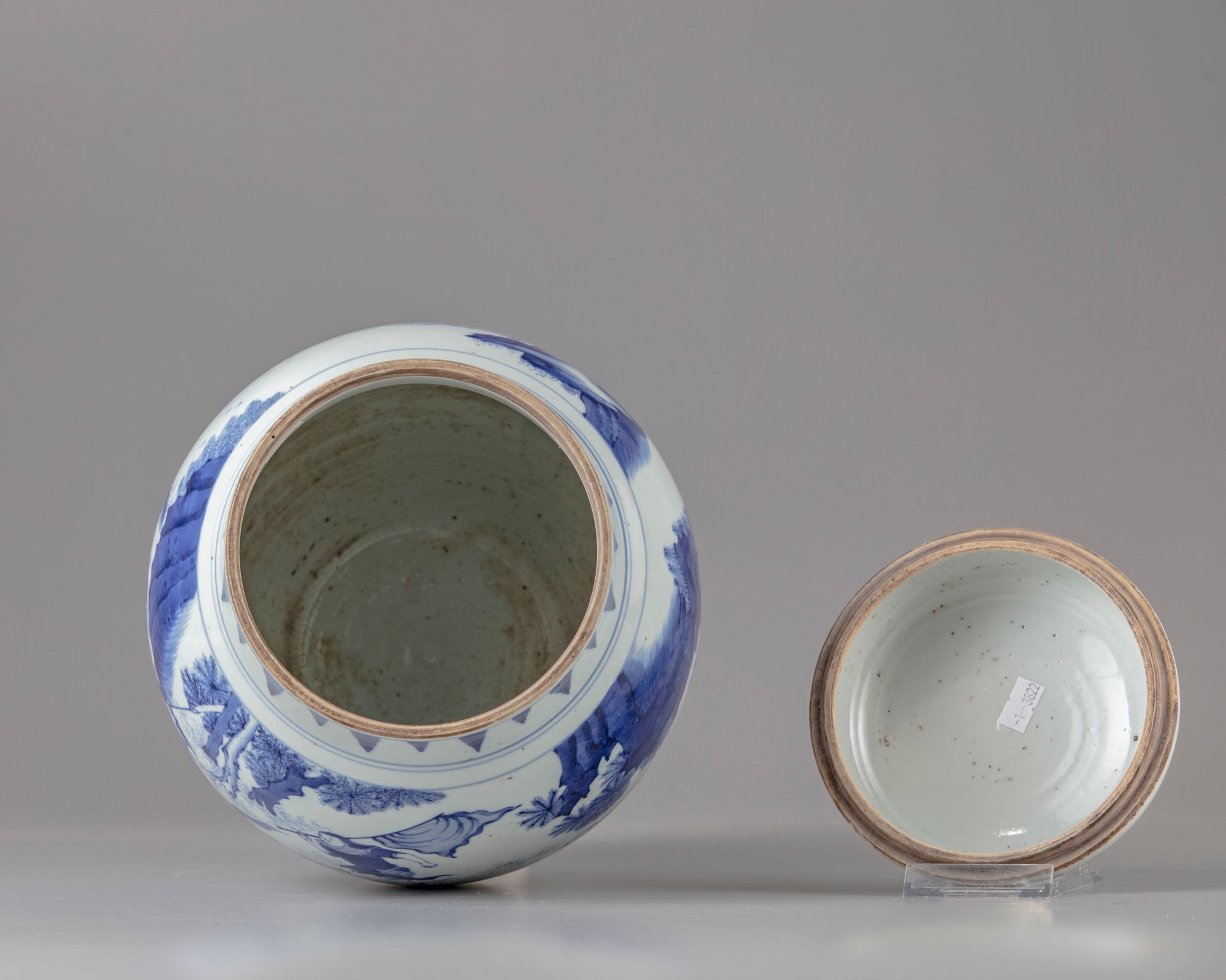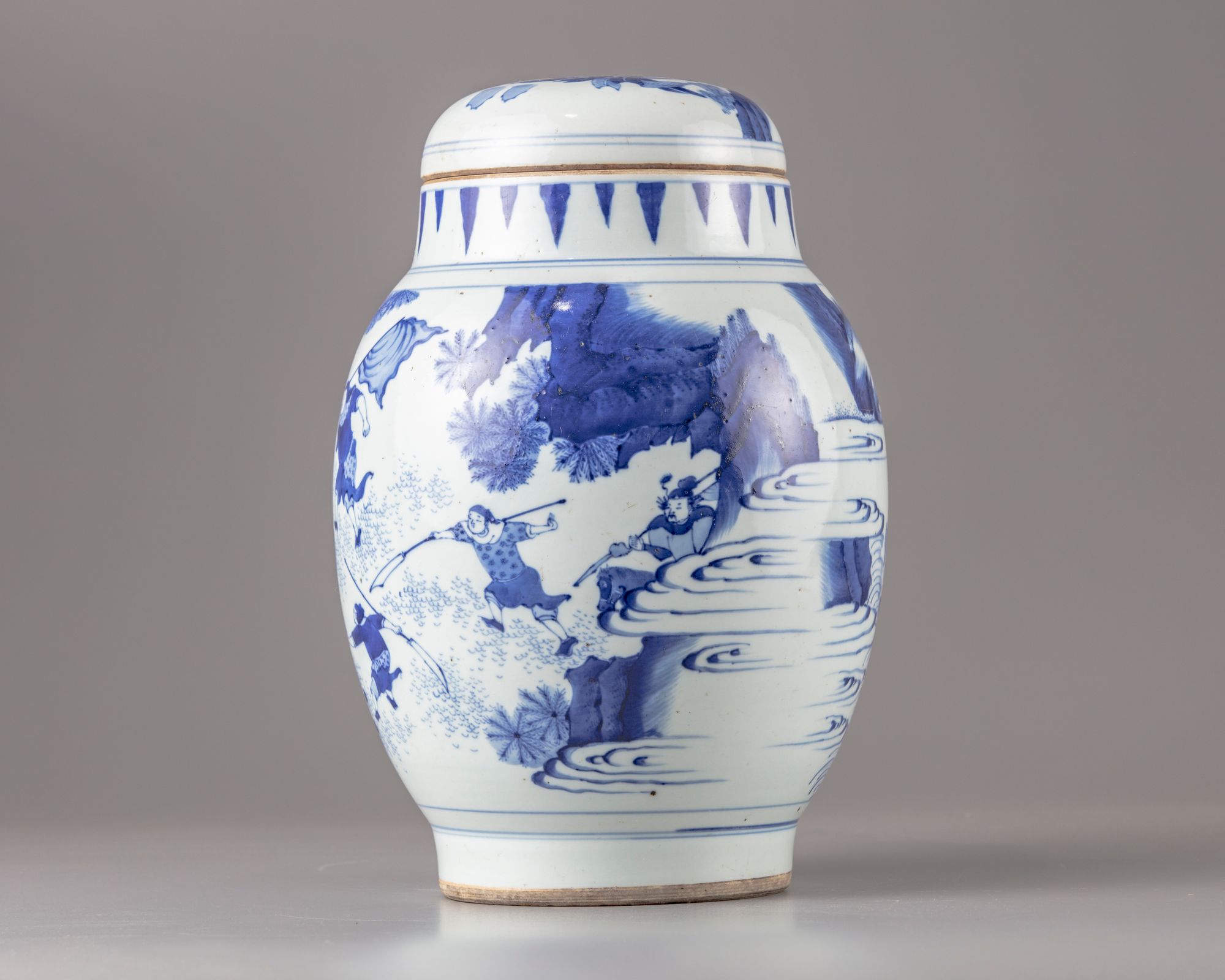 The pot is decorated to the body with a continuous scene of warriors on horses. The cover is decorated with a scholar and his attendant in a fenced garden.