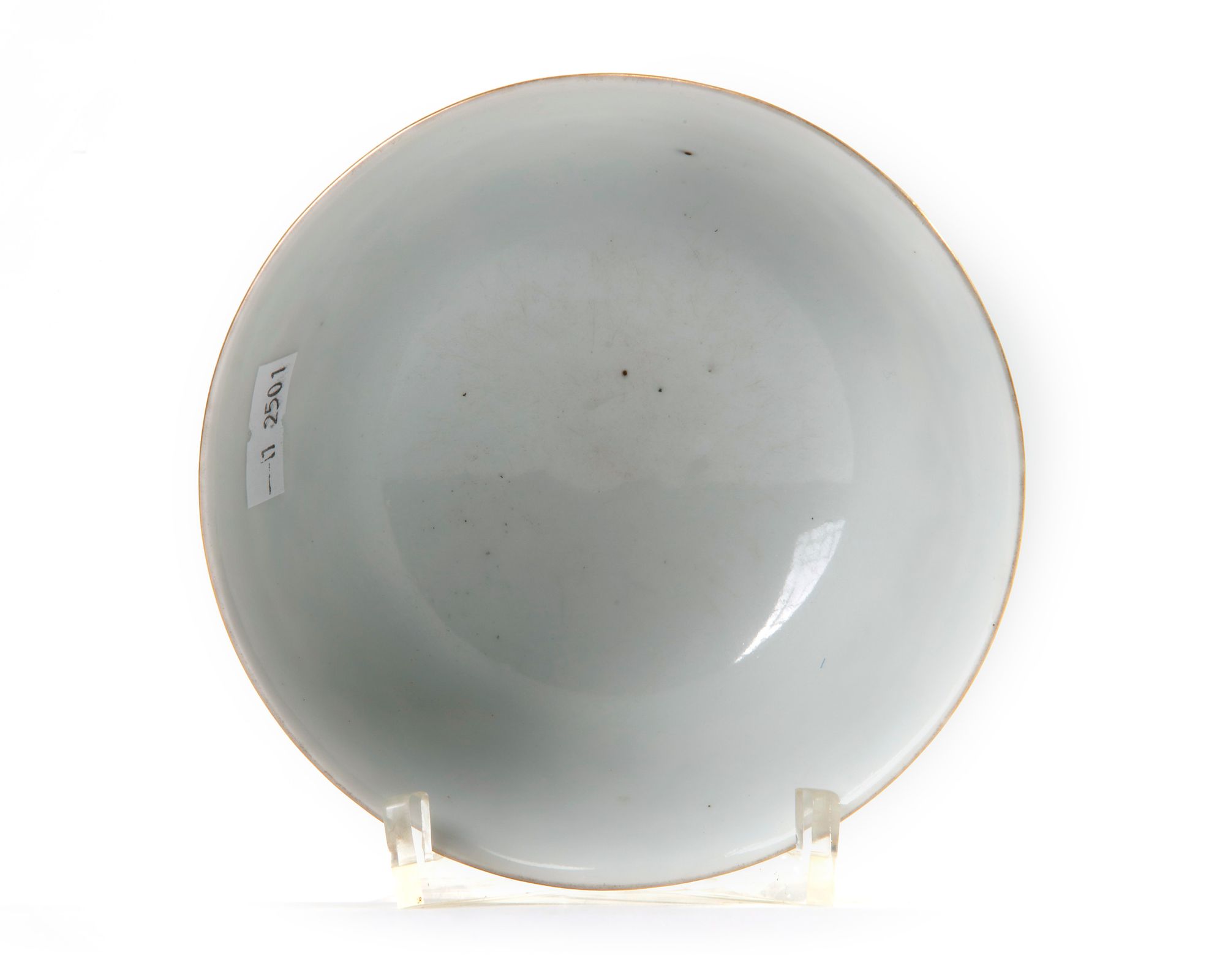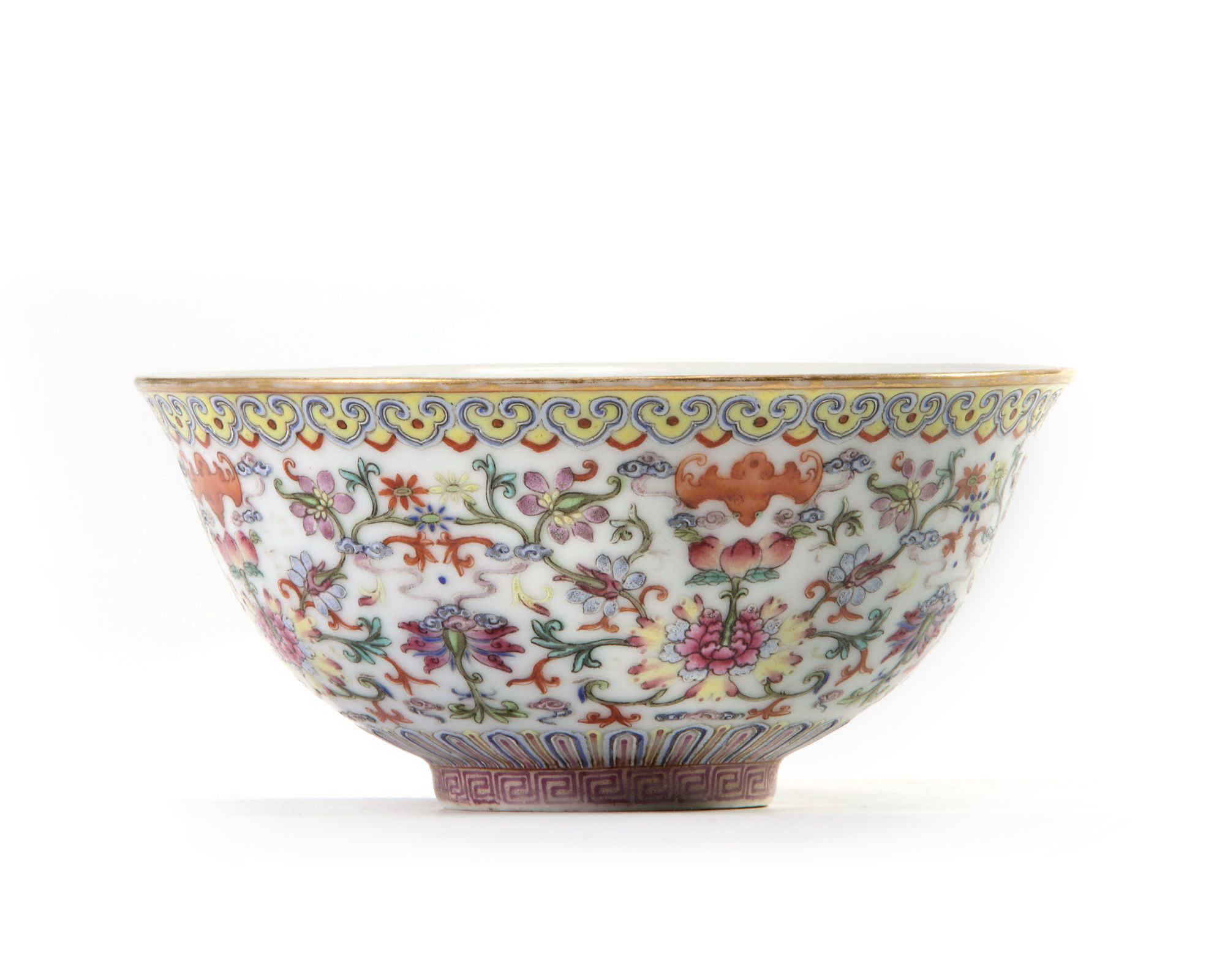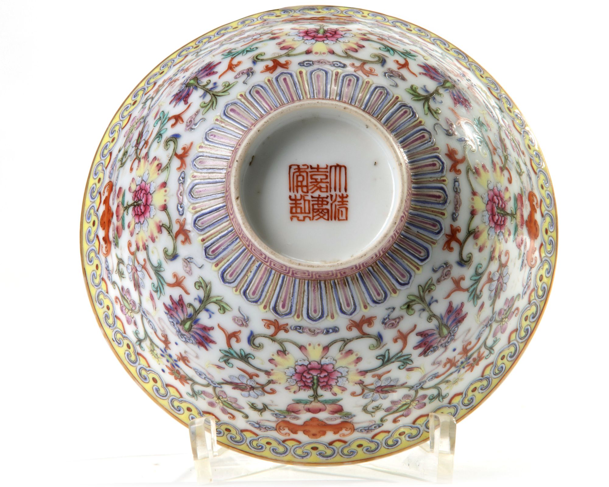 The bowl is finely decorated on the exterior with bats between foliate scrolls of lotus, all set between and a ruyi head border on the rim and a lappet border with a key fret band to the foot. The base with an apocryphal Jiaqing seal mark