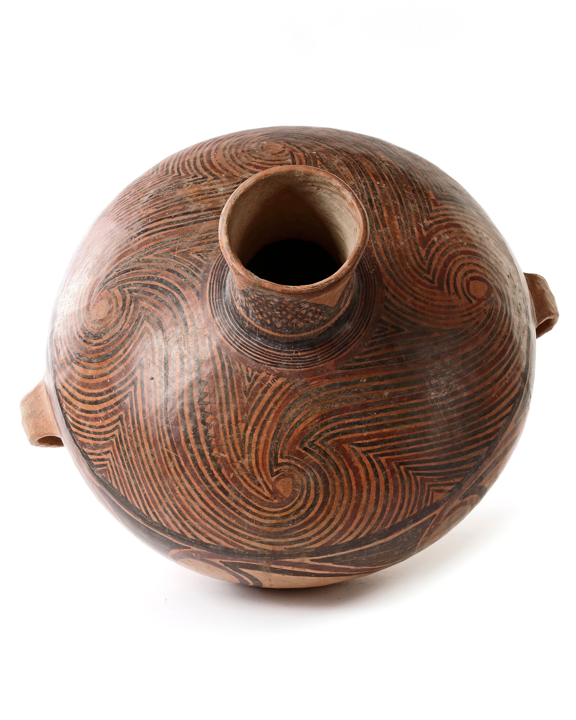 A neolithic jar made of orange-brown clay and pear-shaped body with an elongated neck terminated in a slightly curved mouth rim. Standing on a flat base and equipped with a pair of broad lugs placed mid-way. The lower part is deprived of any painted decoration. The design at the upper half consists of relative simple but charming black and brownish patterns, mainly executed in thin or broad sweeping strokes creating powerful impressions. The design of the jar is divided over two broad bands. The lower segment, encompassing both looped rings for attachment, is painted with a few long black and brown scrolling lines against an uncolored fond. The shoulder section is in strong contrast decorated with four roundels consisting each of a pattern of many fine brown and black concentric and swirling lines.