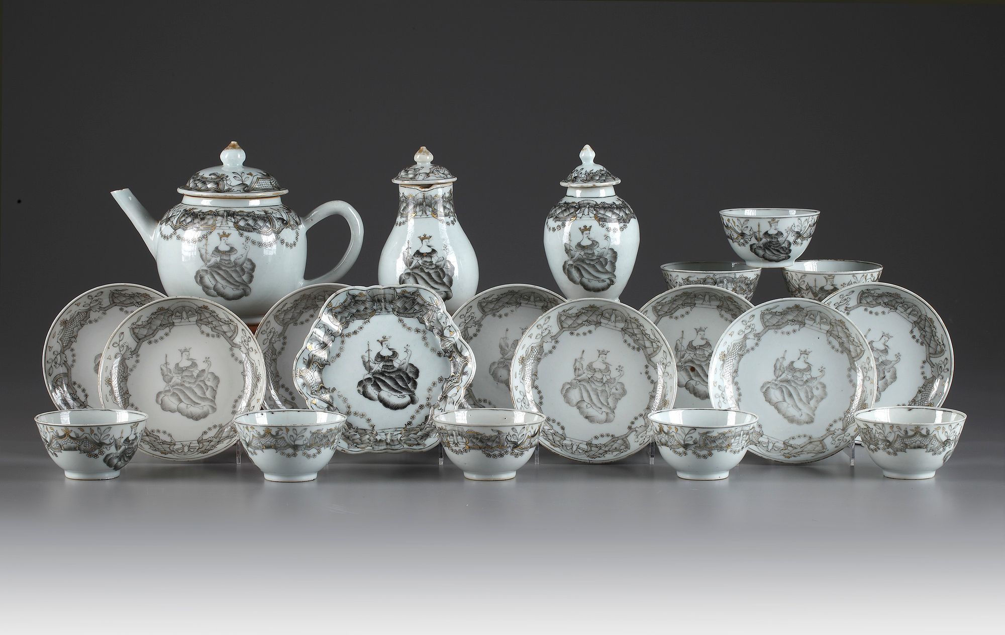Each piece is decorated and gilt in en grisaille with Juno, the goddess holding a wreath seated on a cloud accompanied by her peacock, all below an elaborate border. The group comprises: a teapot and cover; a milk-jug and cover; a small vase and cover; a foliate spoon-tray; and eight teabowls and saucers.