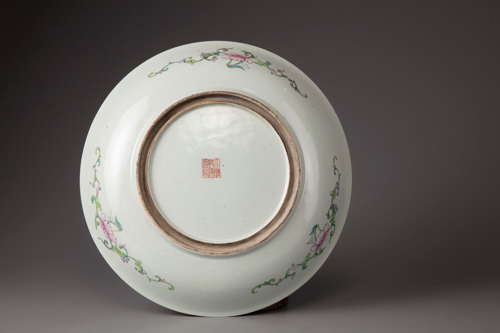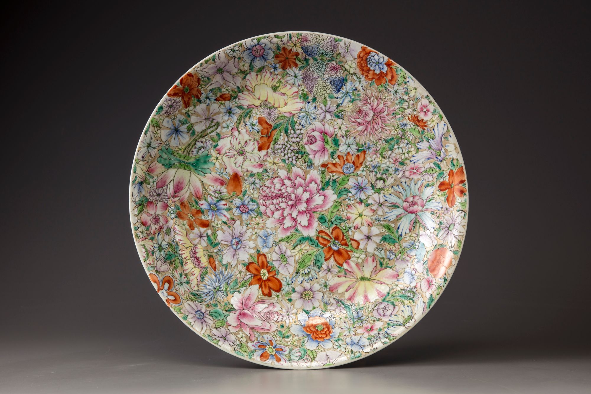 The plate is decorated with a multitude of flowers, including peonies, roses, chrysanthemum, hydrangeas, poppies, and asters, all on a gild ground. The reverse is decorated with three flower sprays. The base with an apocryphal Qianlong mark.