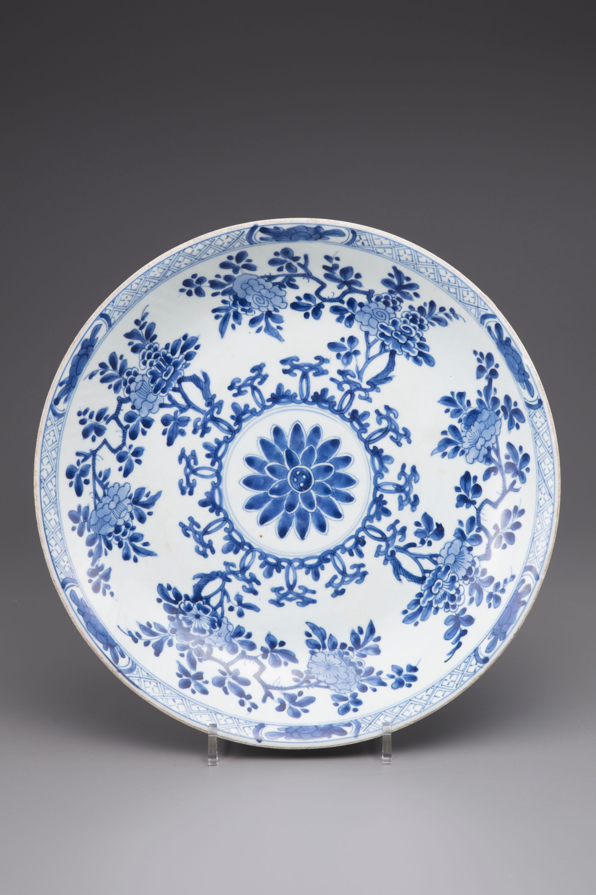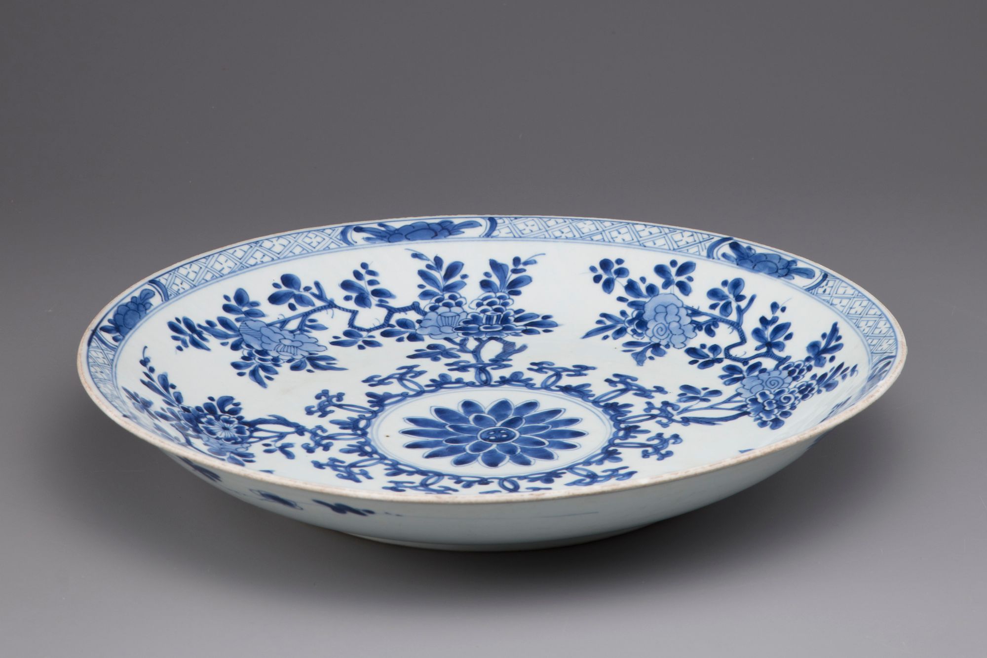 Decorated in underglaze blue with lotus and peony.