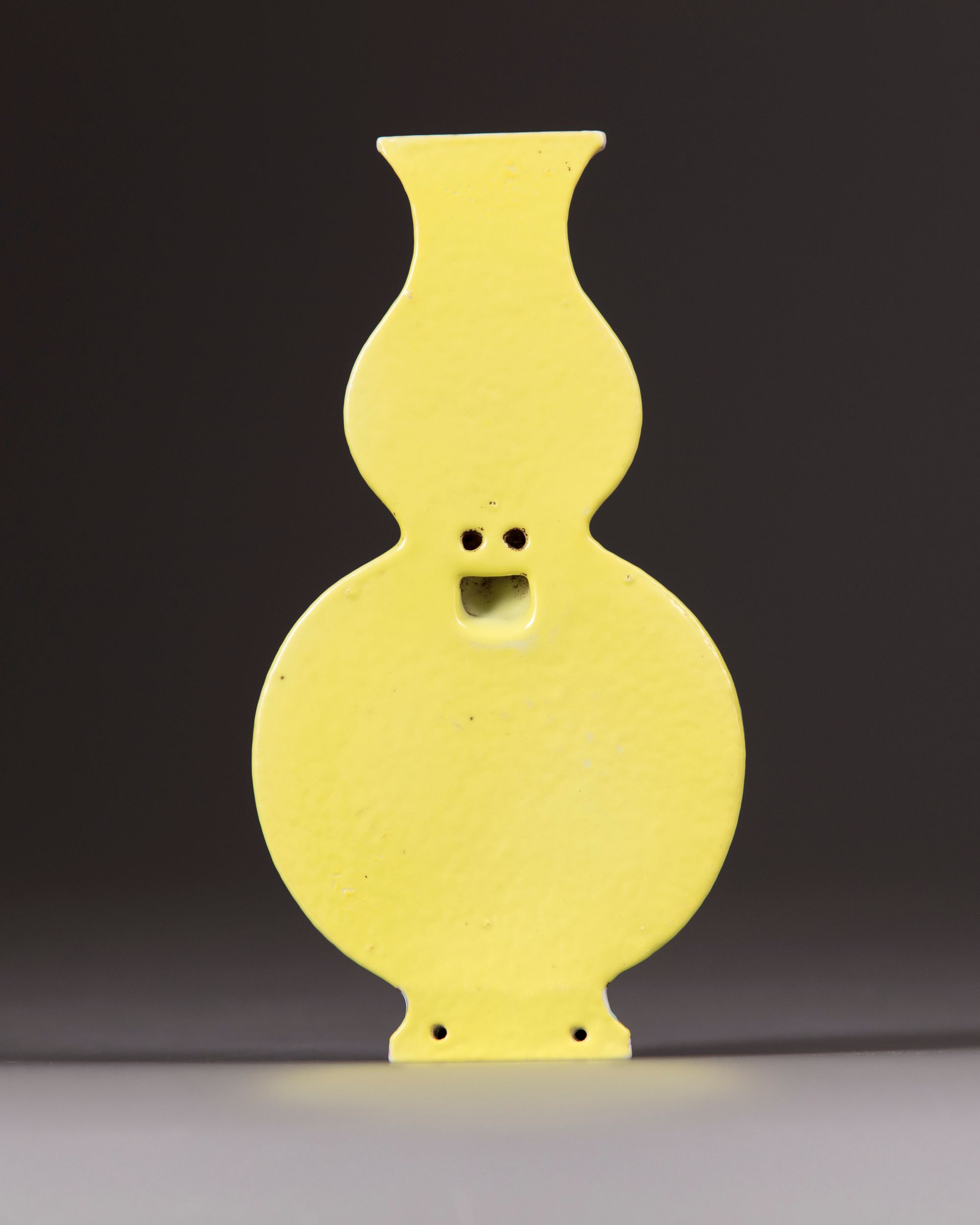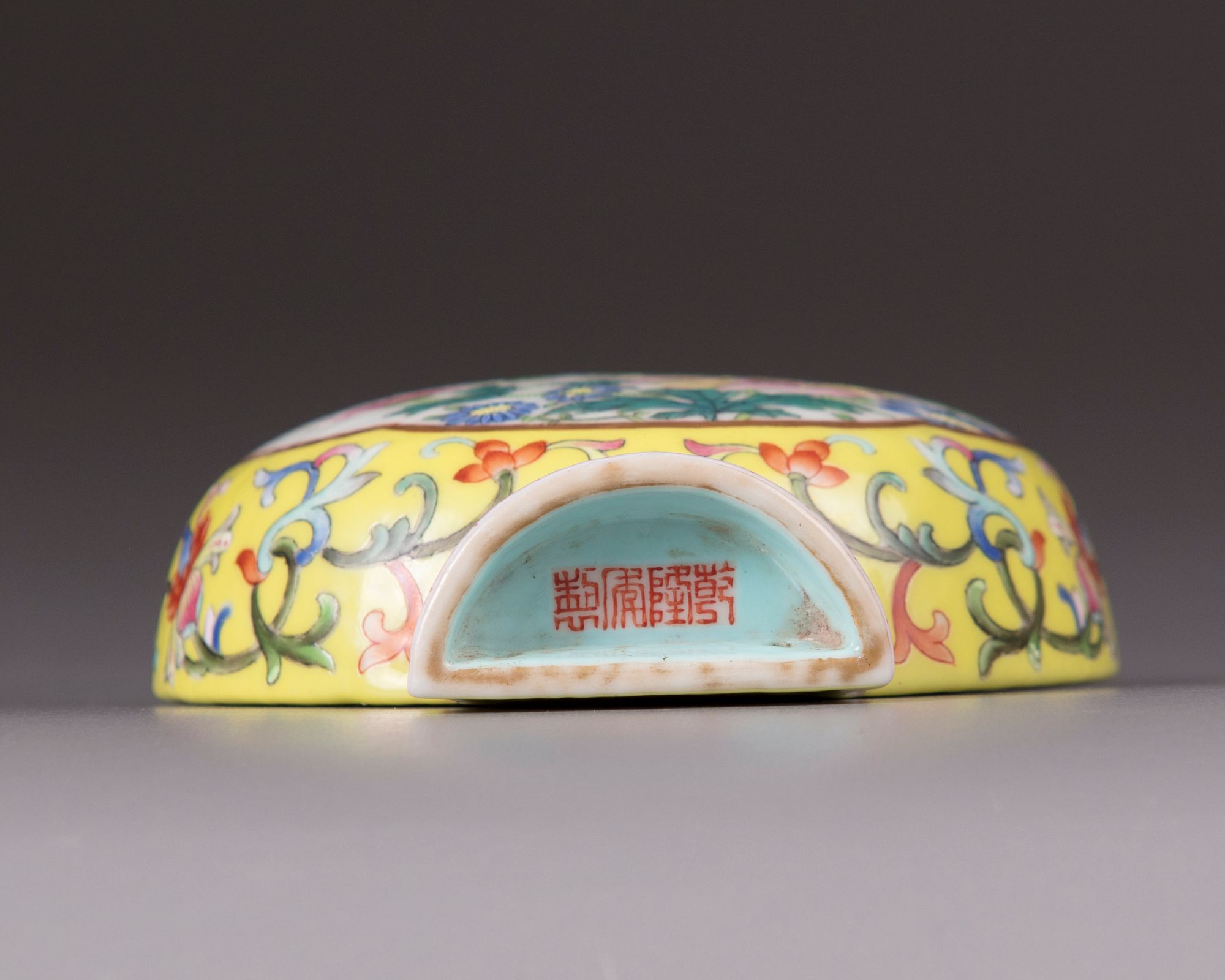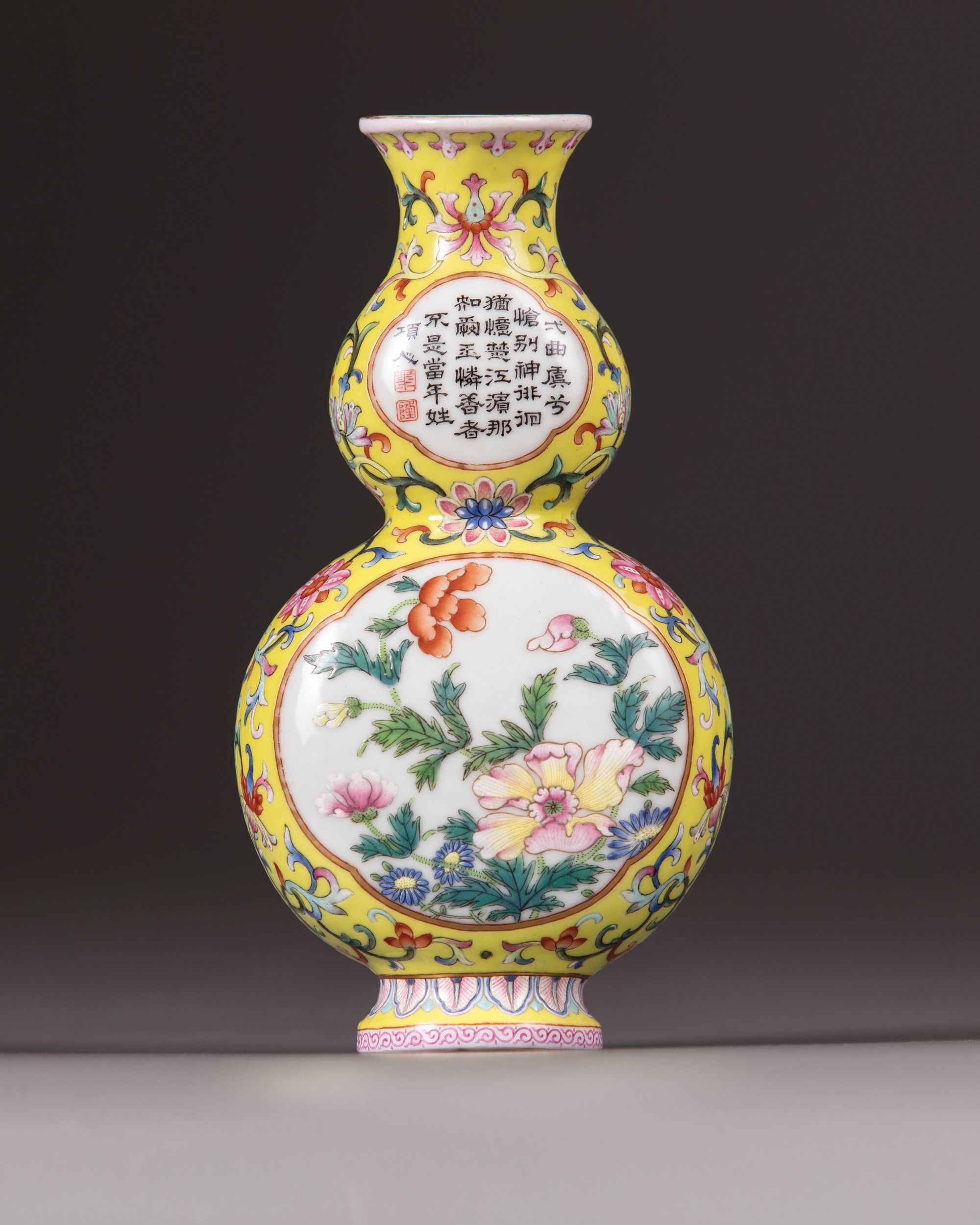 The vase is decorated with two roundels containing various flowers and a poetic inscription followed by two seals 'Qian' and 'long', all on a yellow ground, surrounded by lotus sprays with a lappet band to the foot. The base with an apocryphal Qianlong four character mark on a turquoise ground.
