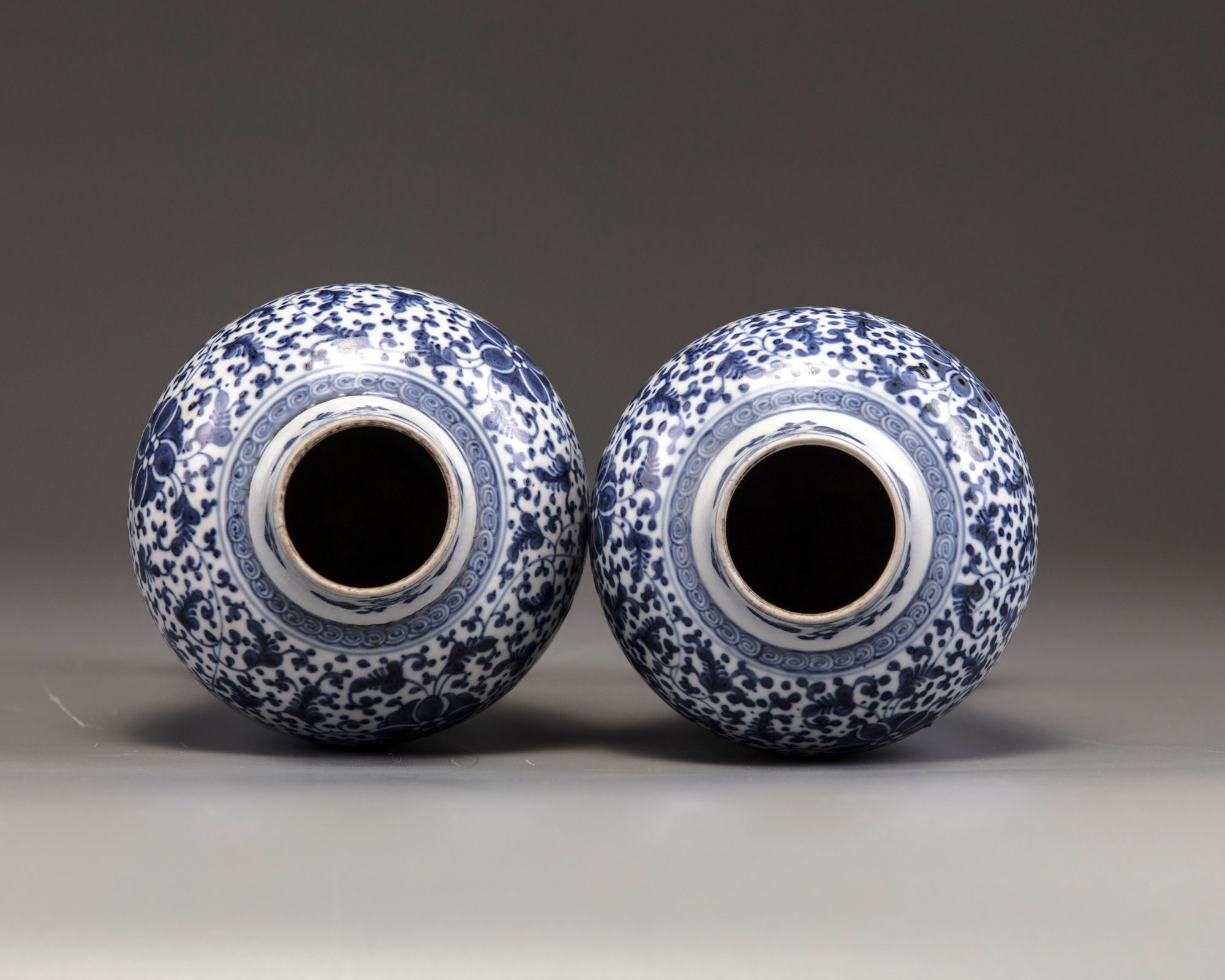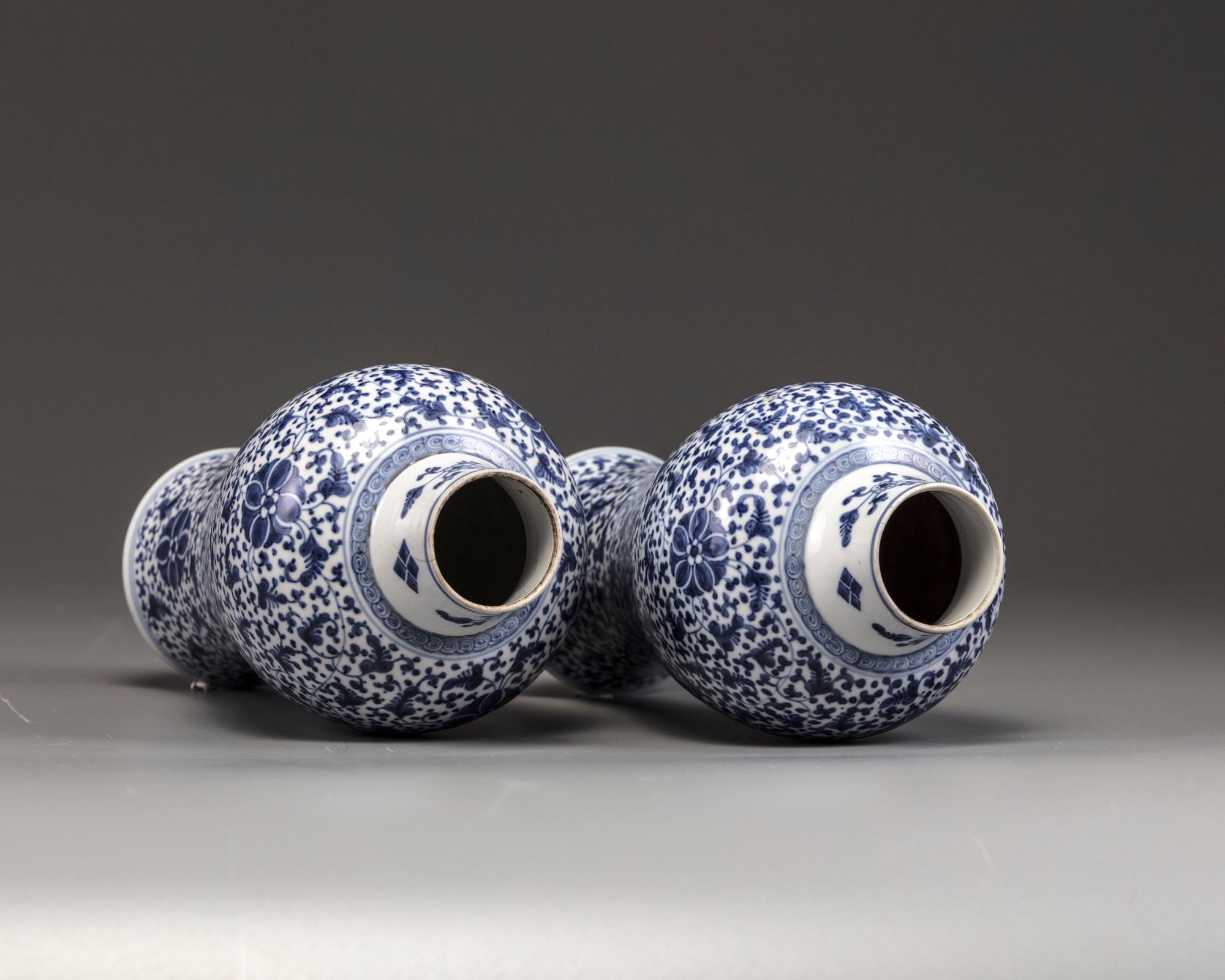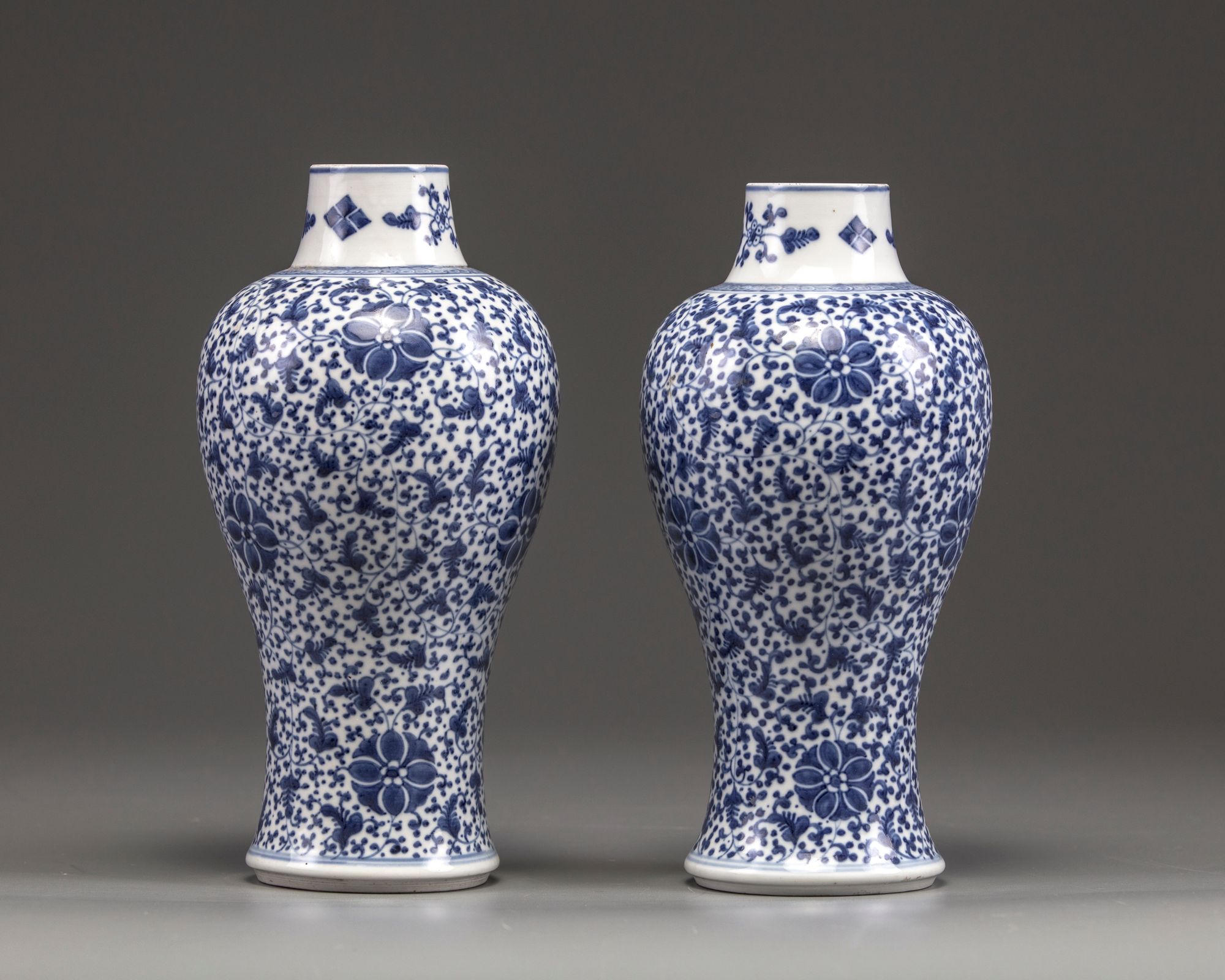 Each slender vase is decorated to the body with densely scrolling flowers, all below alternating flower sprays and diamond decoration to the neck.