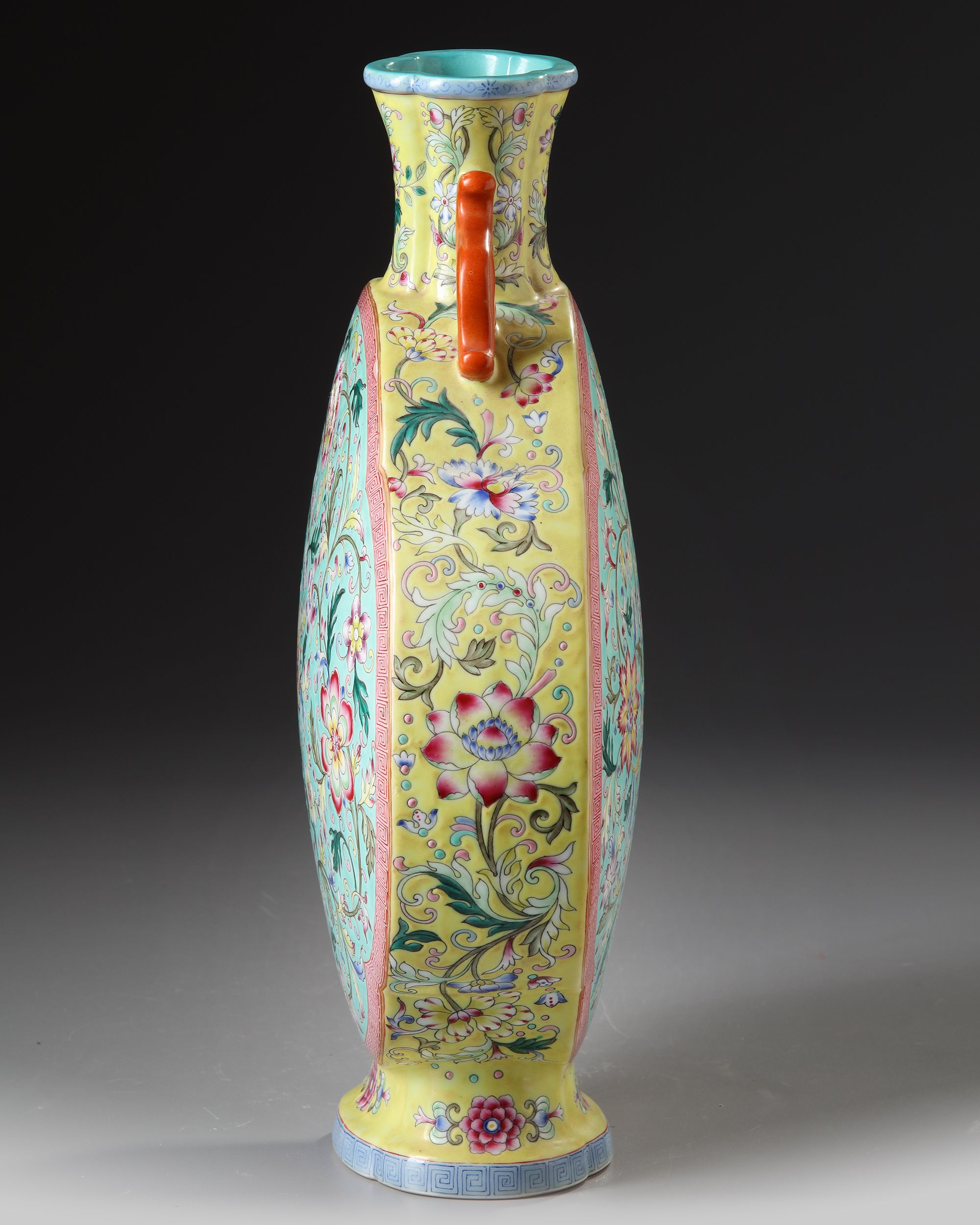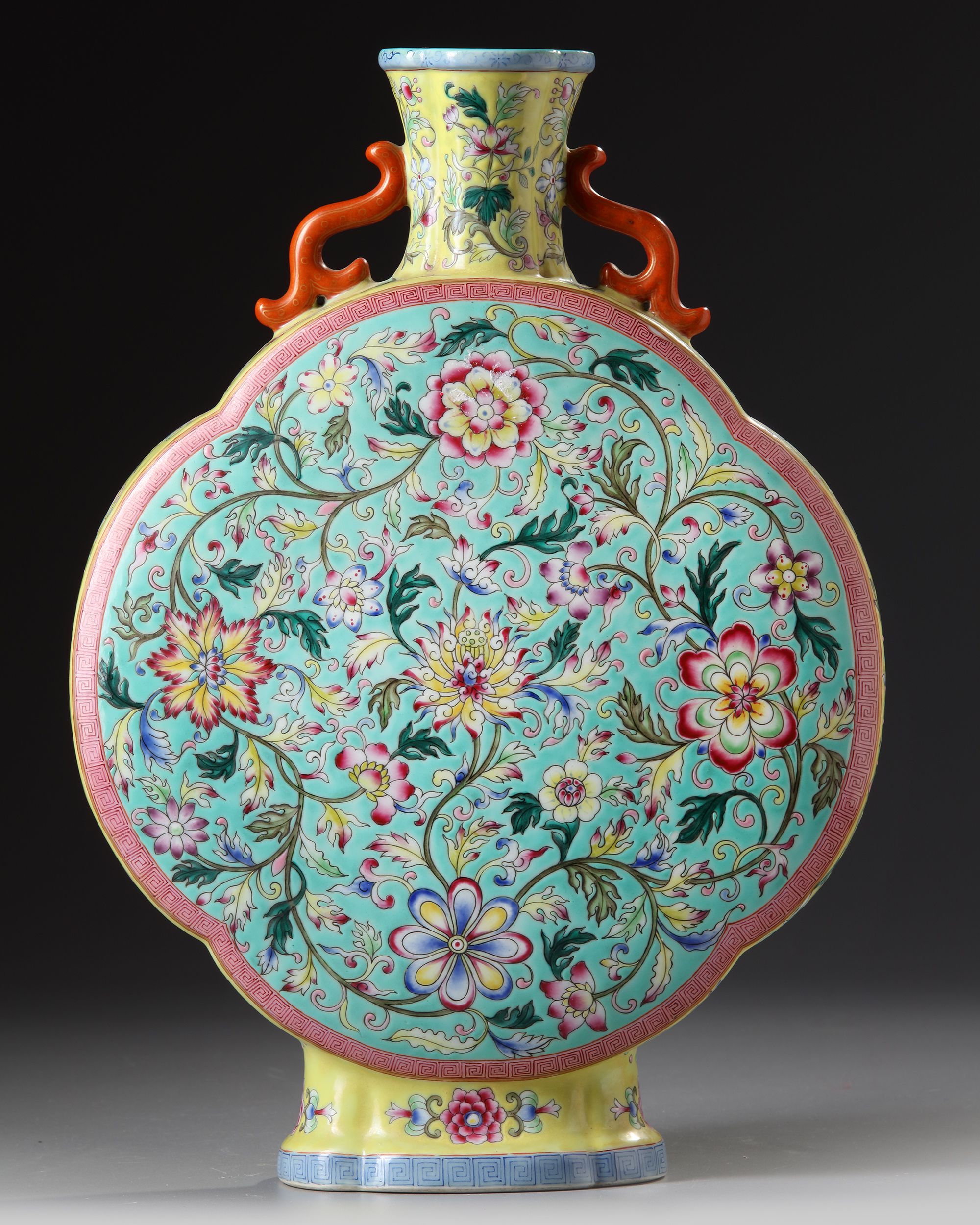 A Chinese porcelain moon flask decorated to the sides with a dense design of lotus heads, peonies and morning lilies amongst foliage. Stylized with two coral red handles, the interior and the bottom are turquoise glazed with a Chinese Jiajing seal mark. 36 cm.