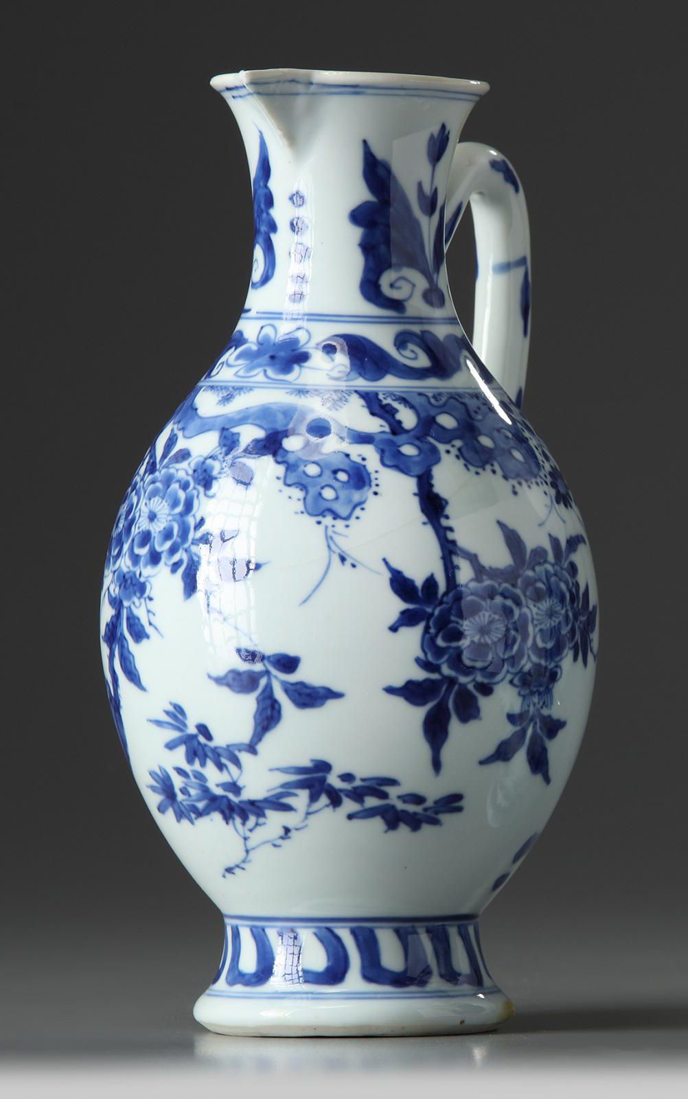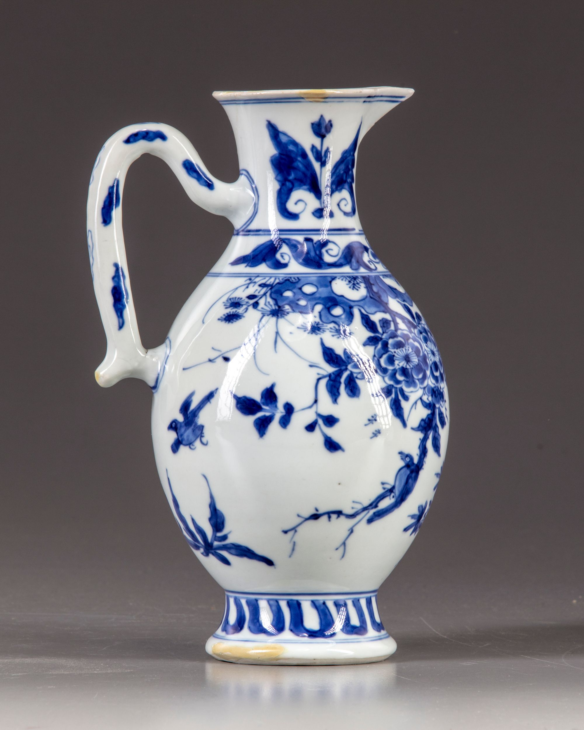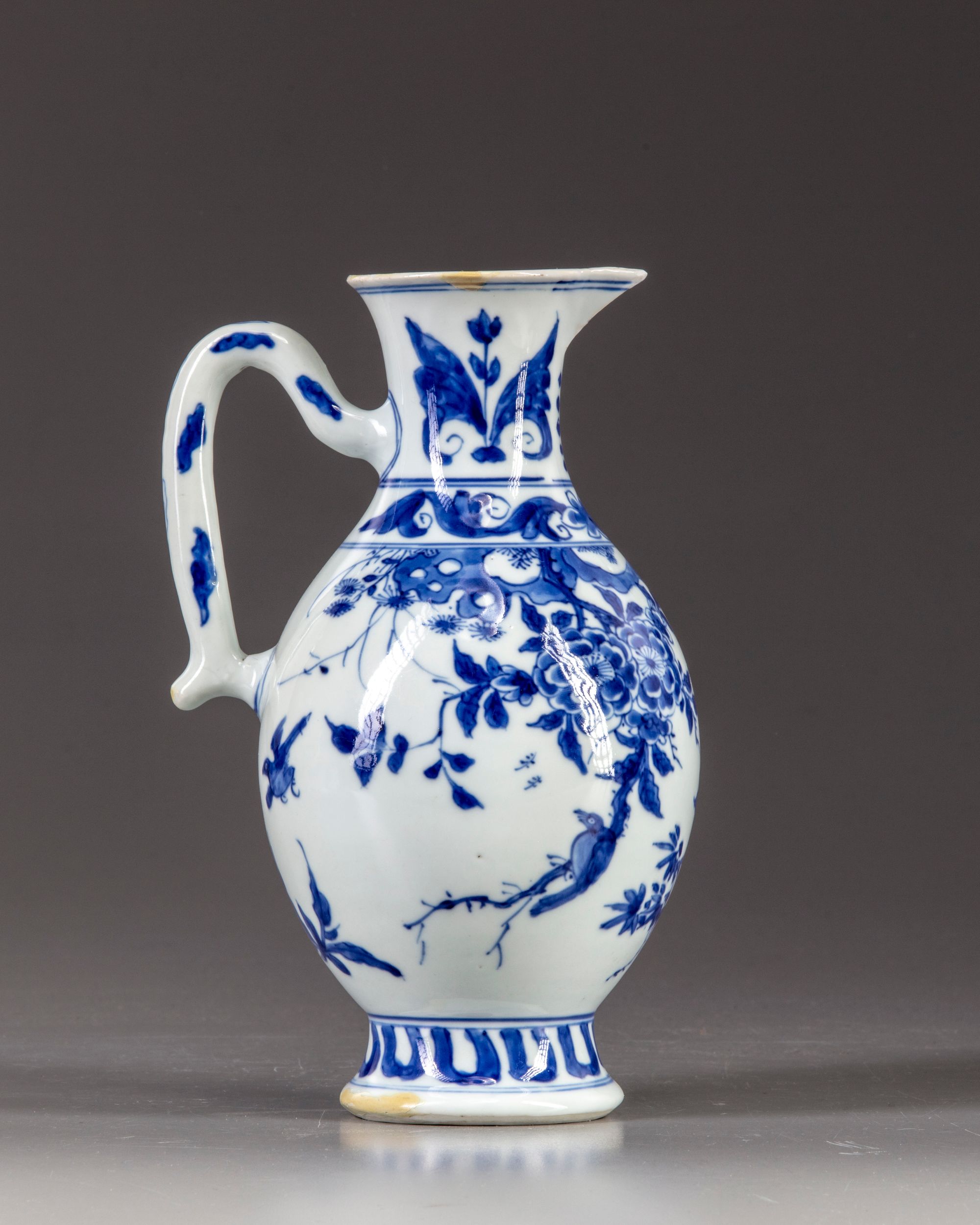 The ewer is decorated with birds amongst prunus below European-style flower scrolls, the handle decorated with clouds, and the base with an artemisia leaf mark in underglaze blue