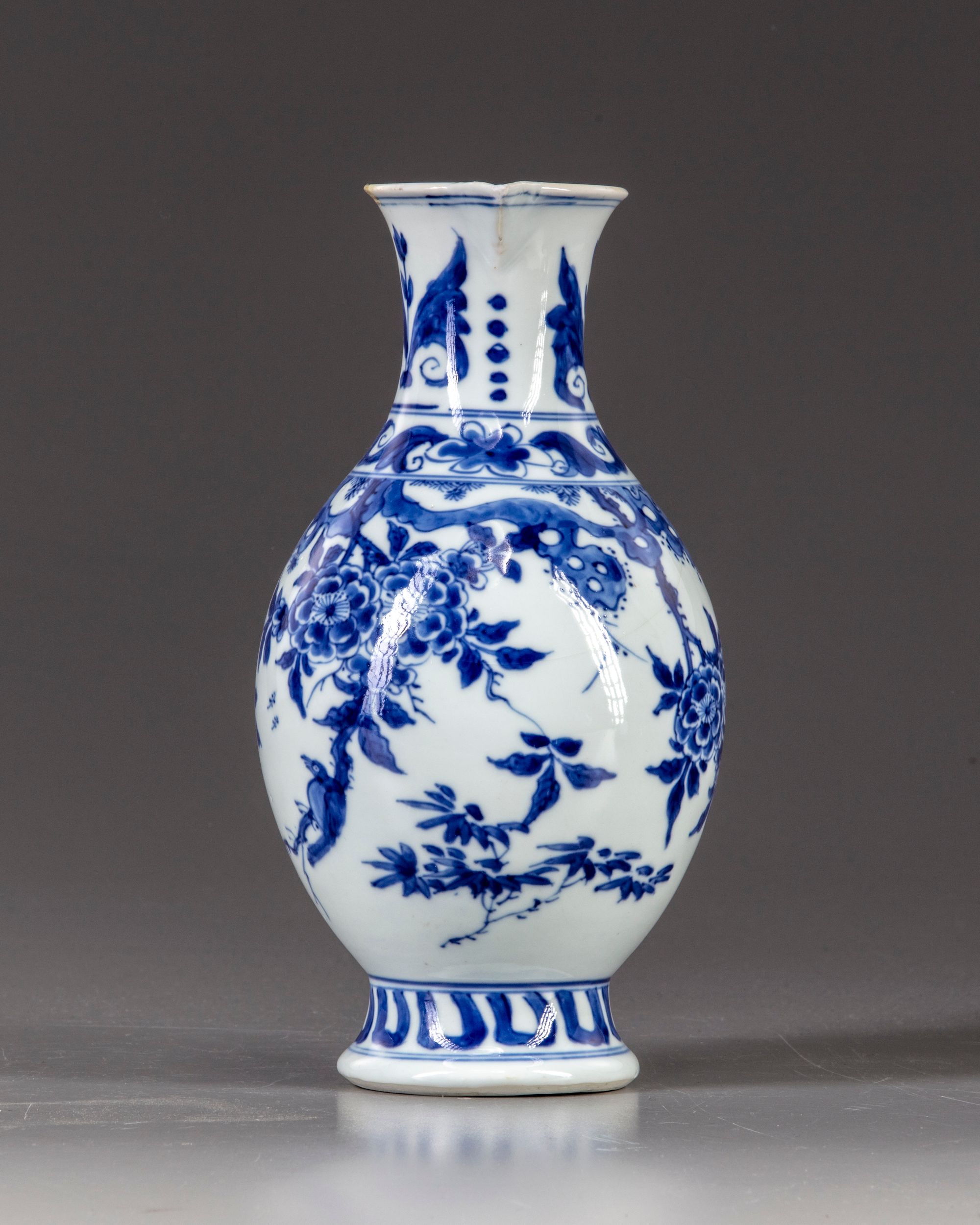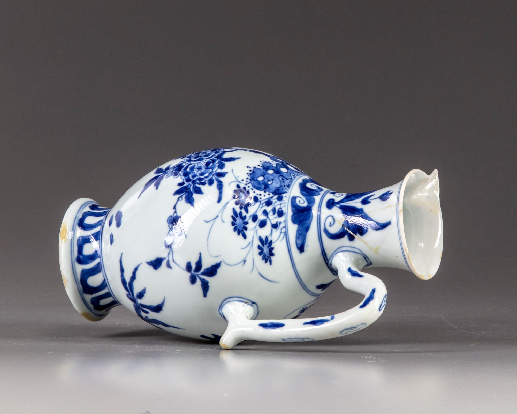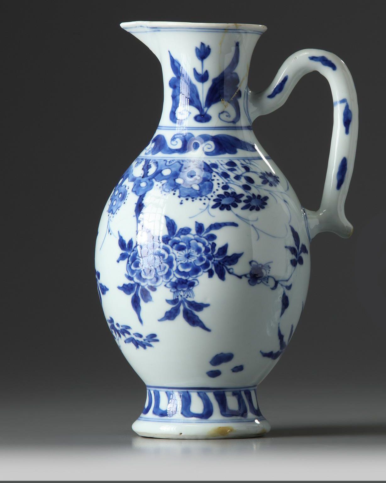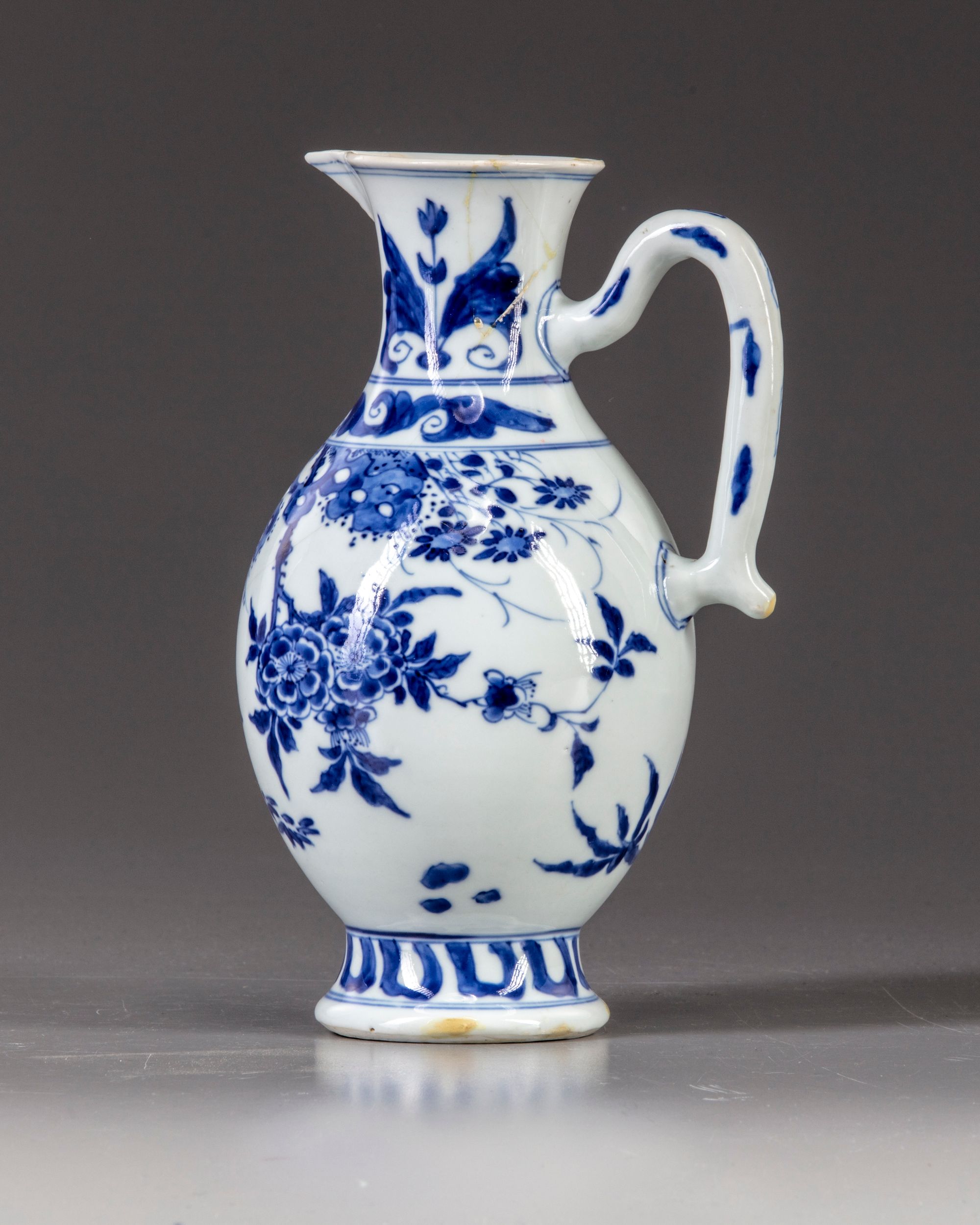 The ewer is decorated with birds amongst prunus below European-style flower scrolls, the handle decorated with clouds, and the base with an artemisia leaf mark in underglaze blue