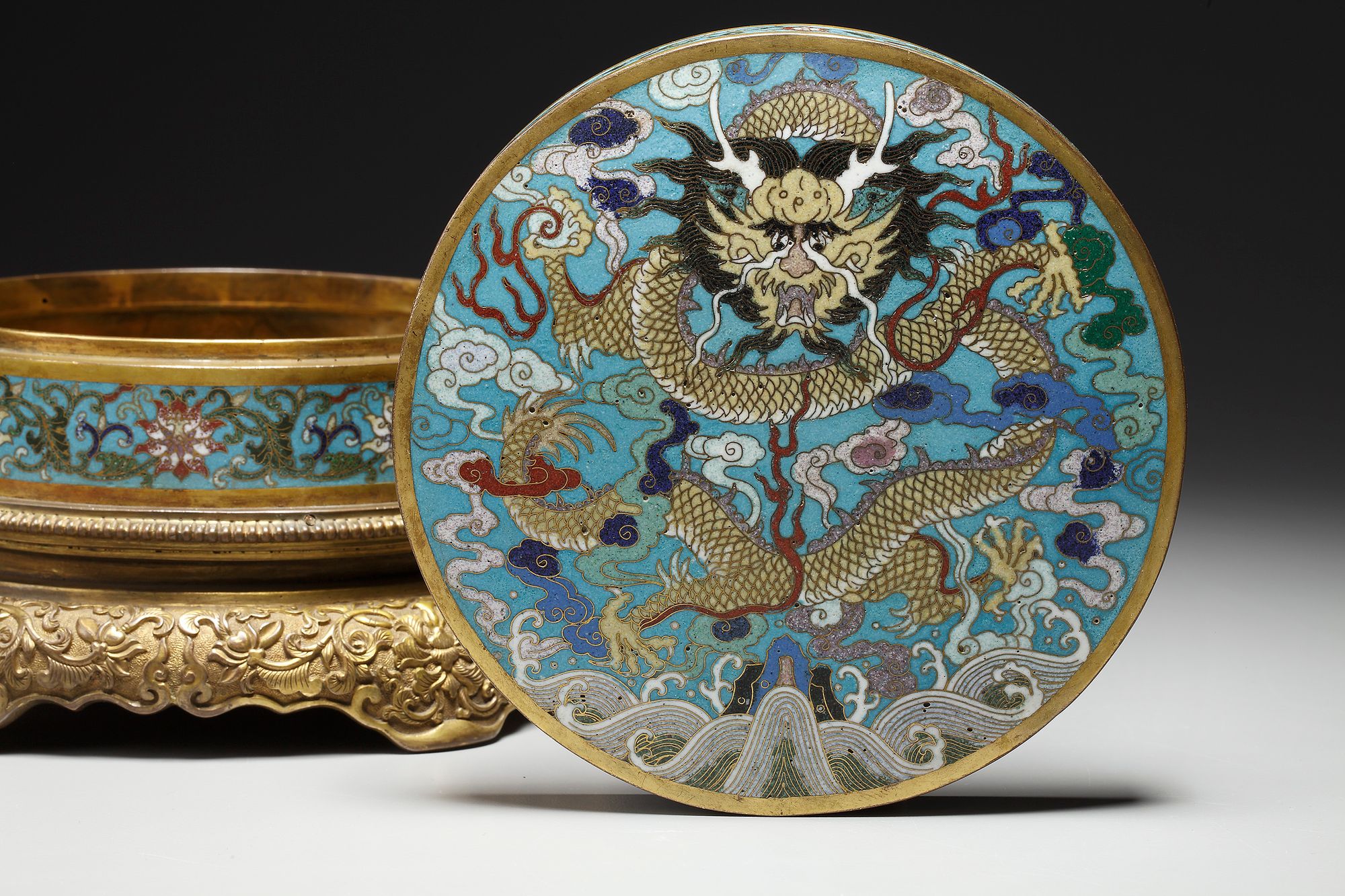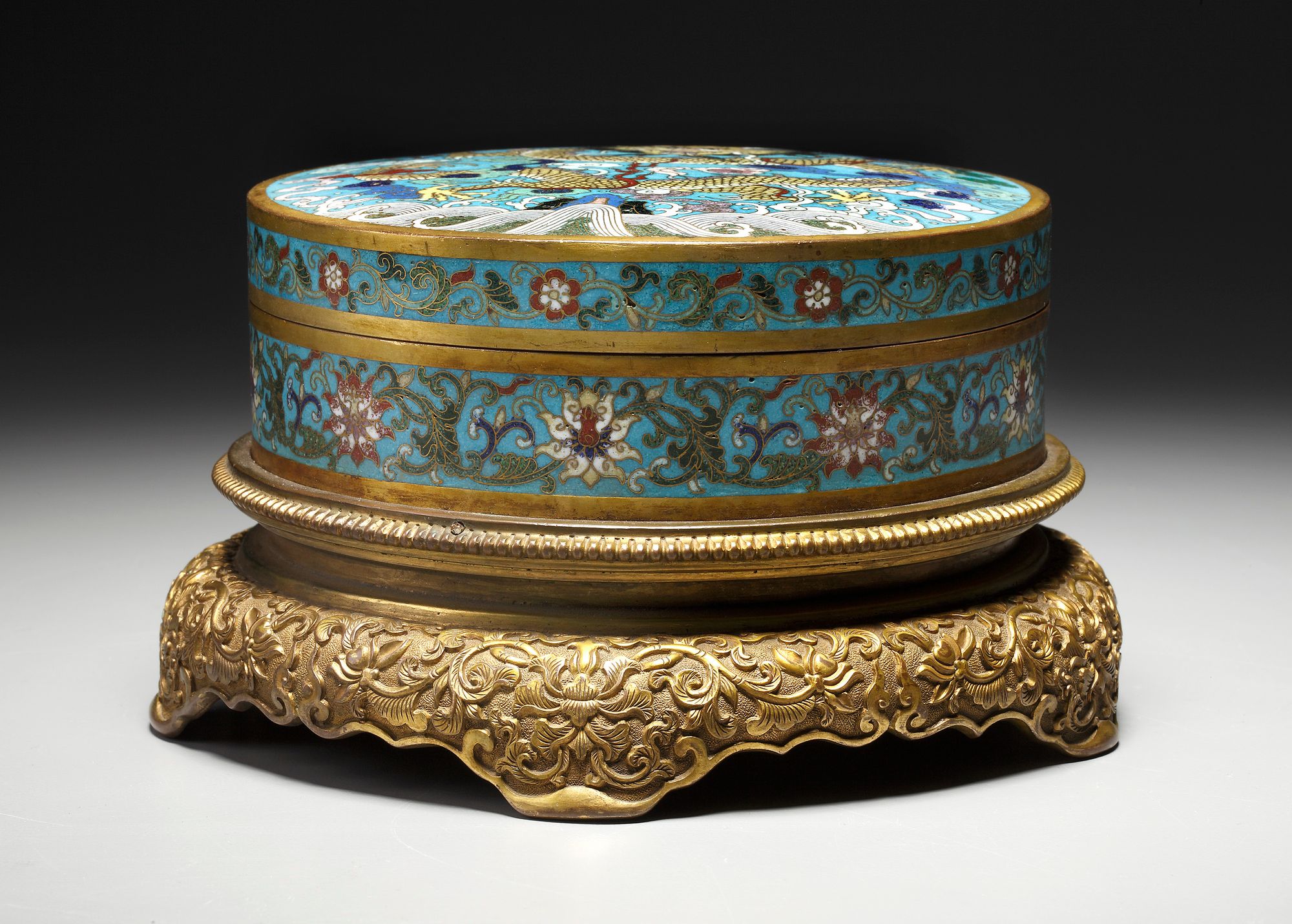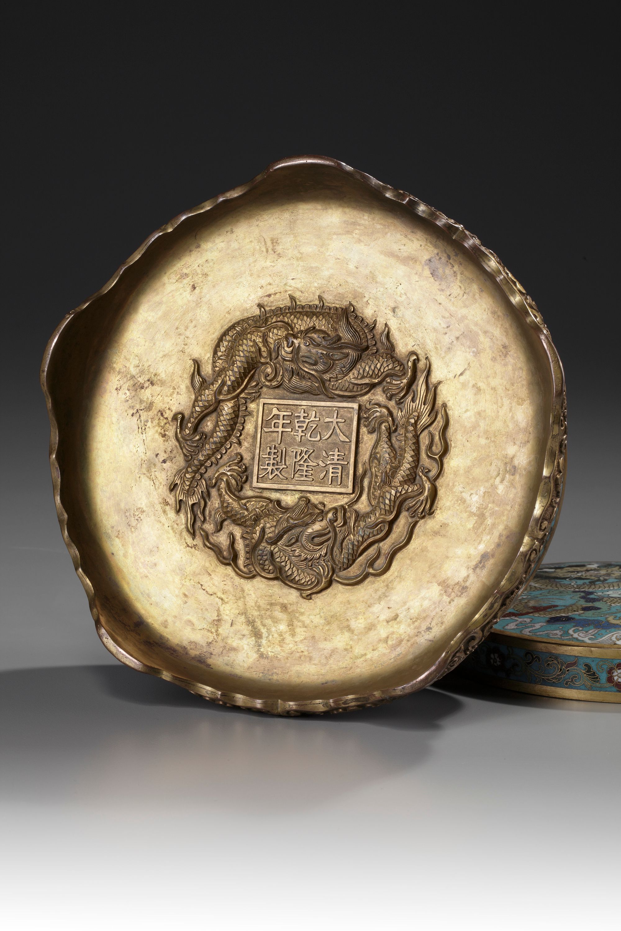 The box is finely enamelled in bold tones of iron-red, white, blue and yellow against a turquoise ground. The upper surface depicts a single large dragon above ocean waves surrounded by various clouds, the side of the box is decorated with a band of lotus flowers borne on an undulating vine. The box is mounted to a heavily cast gilt-bronze base, decorated with stylized lotus flowers and cast Qianlong six character mark enclosed by dragons.