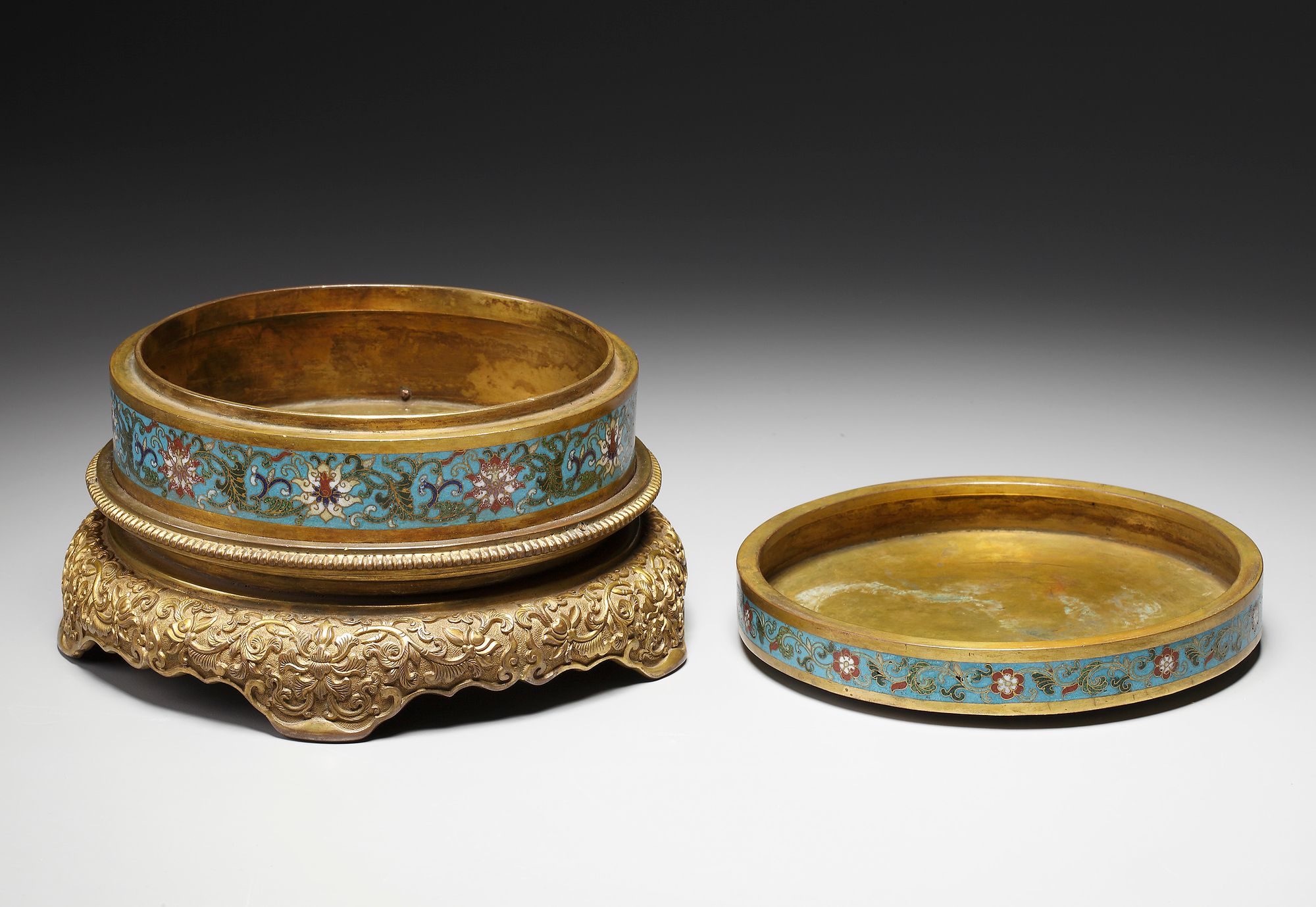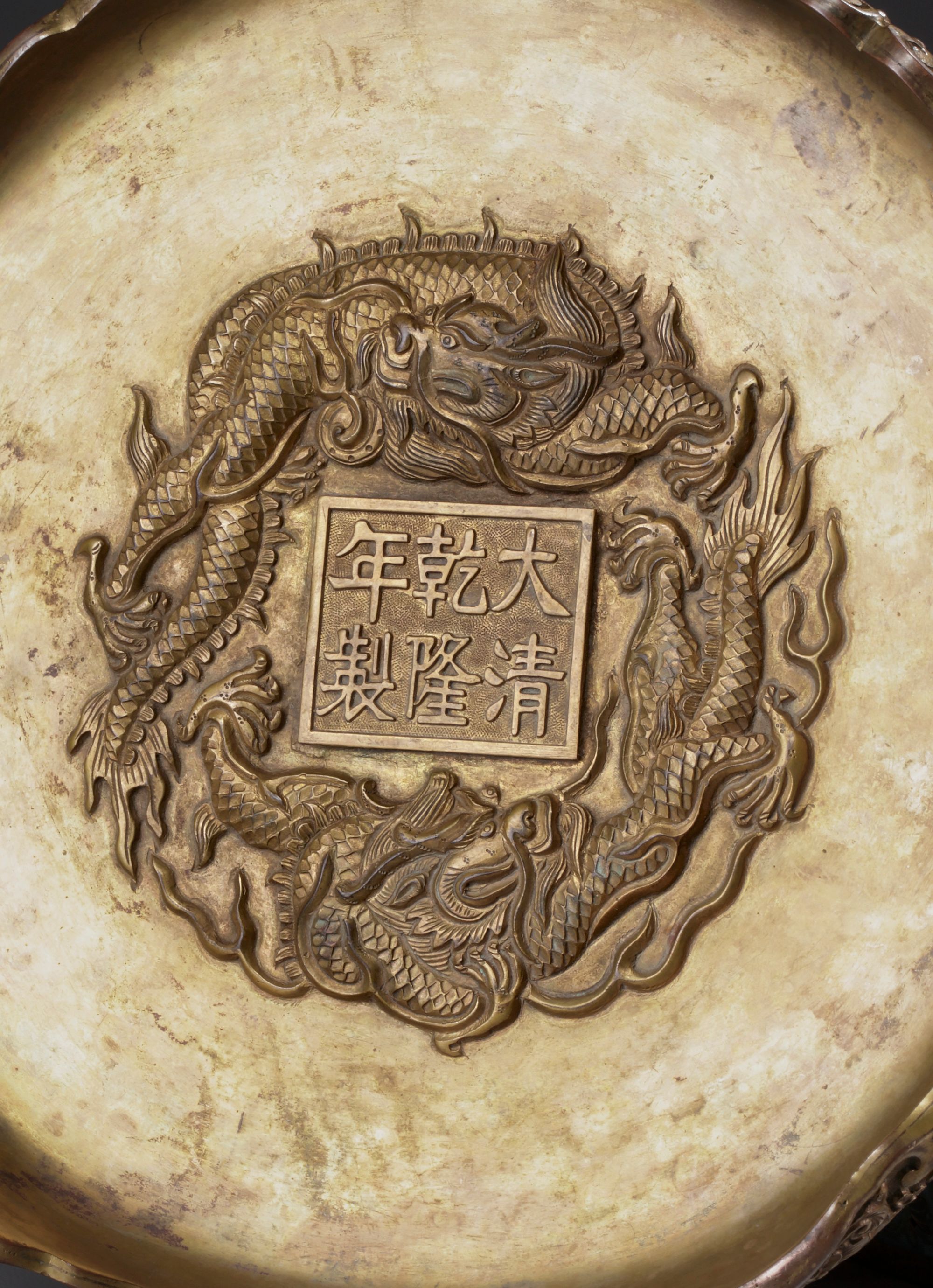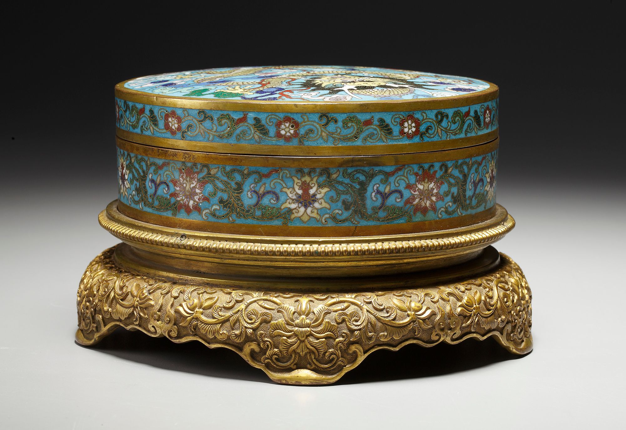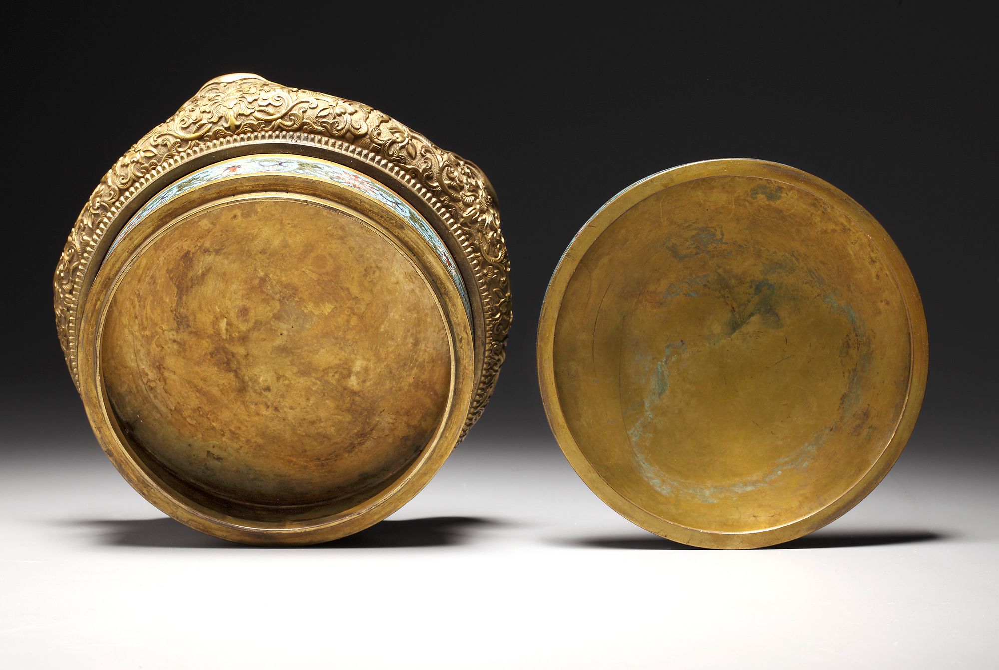 The box is finely enamelled in bold tones of iron-red, white, blue and yellow against a turquoise ground. The upper surface depicts a single large dragon above ocean waves surrounded by various clouds, the side of the box is decorated with a band of lotus flowers borne on an undulating vine. The box is mounted to a heavily cast gilt-bronze base, decorated with stylized lotus flowers and cast Qianlong six character mark enclosed by dragons.