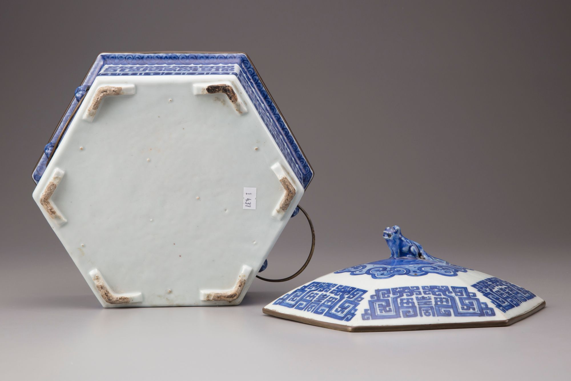Chinese porcelain naughty-box, decorated in underglaze blue, the lid with Fo dog finial, with nine erotic Chinese figures showing various Kamasutra positions.