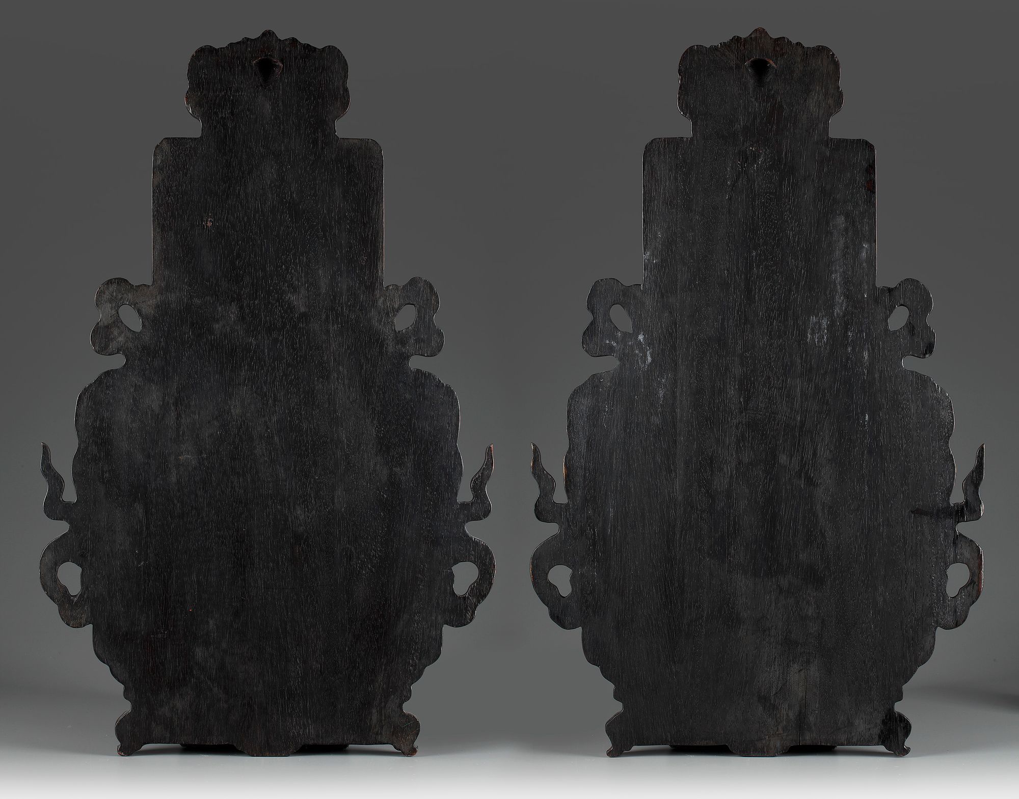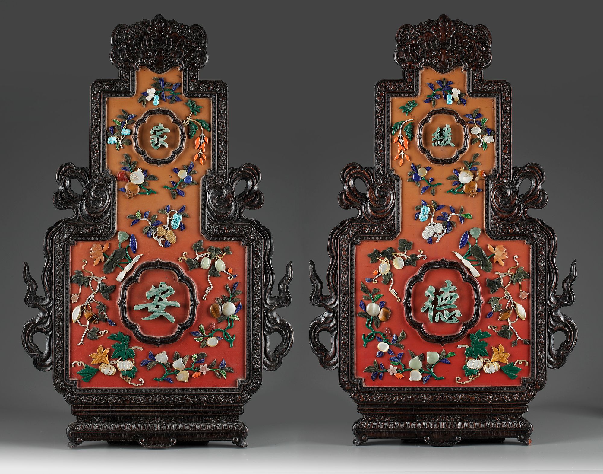 Each stylised double-gourd form panel is inlaid with jade, resin, mother of pearl and precious stones each with two characters reading 'huan de' and 'jia an' surrounded by auspicious fruits and flowers reserved on a red painted ground. Each fits into a veneered zitan frame of conforming shape, finely carved in low relief with lotus and double gourd scrolls and surrounded by a key fret border and a bat on the top of the frame.