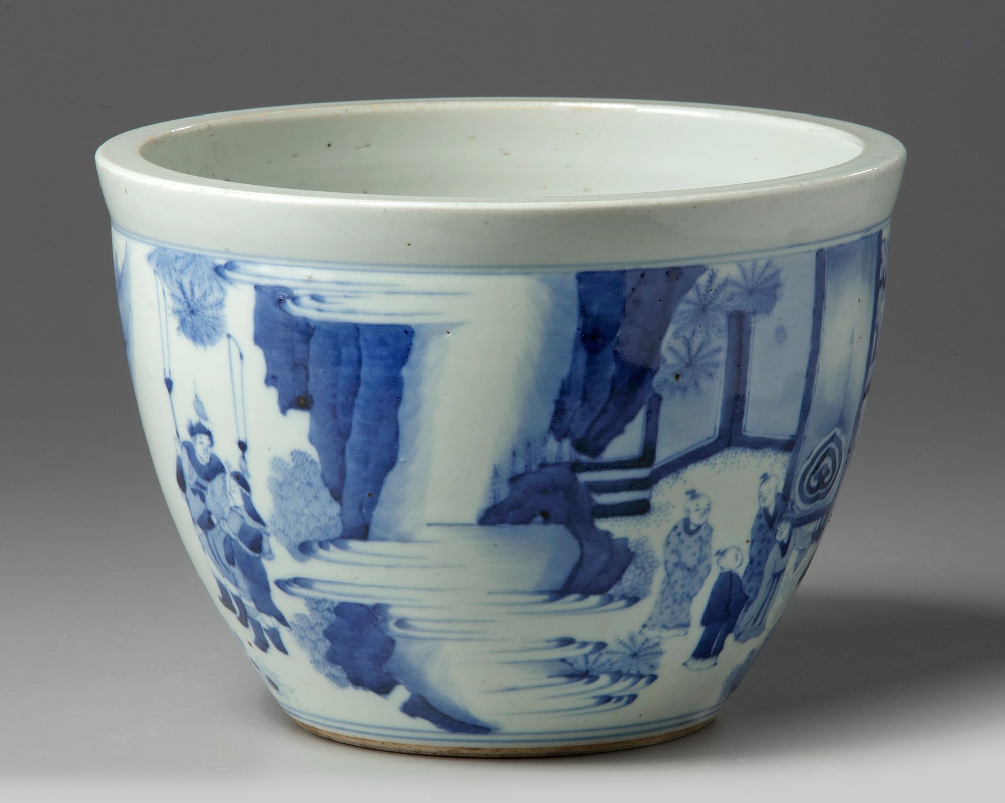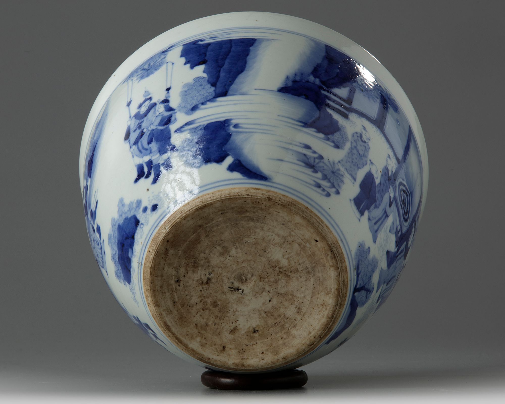 The exterior is decorated with a continuous scene of scholars, officials, soldiers, and attendants in a mountainous landscape.