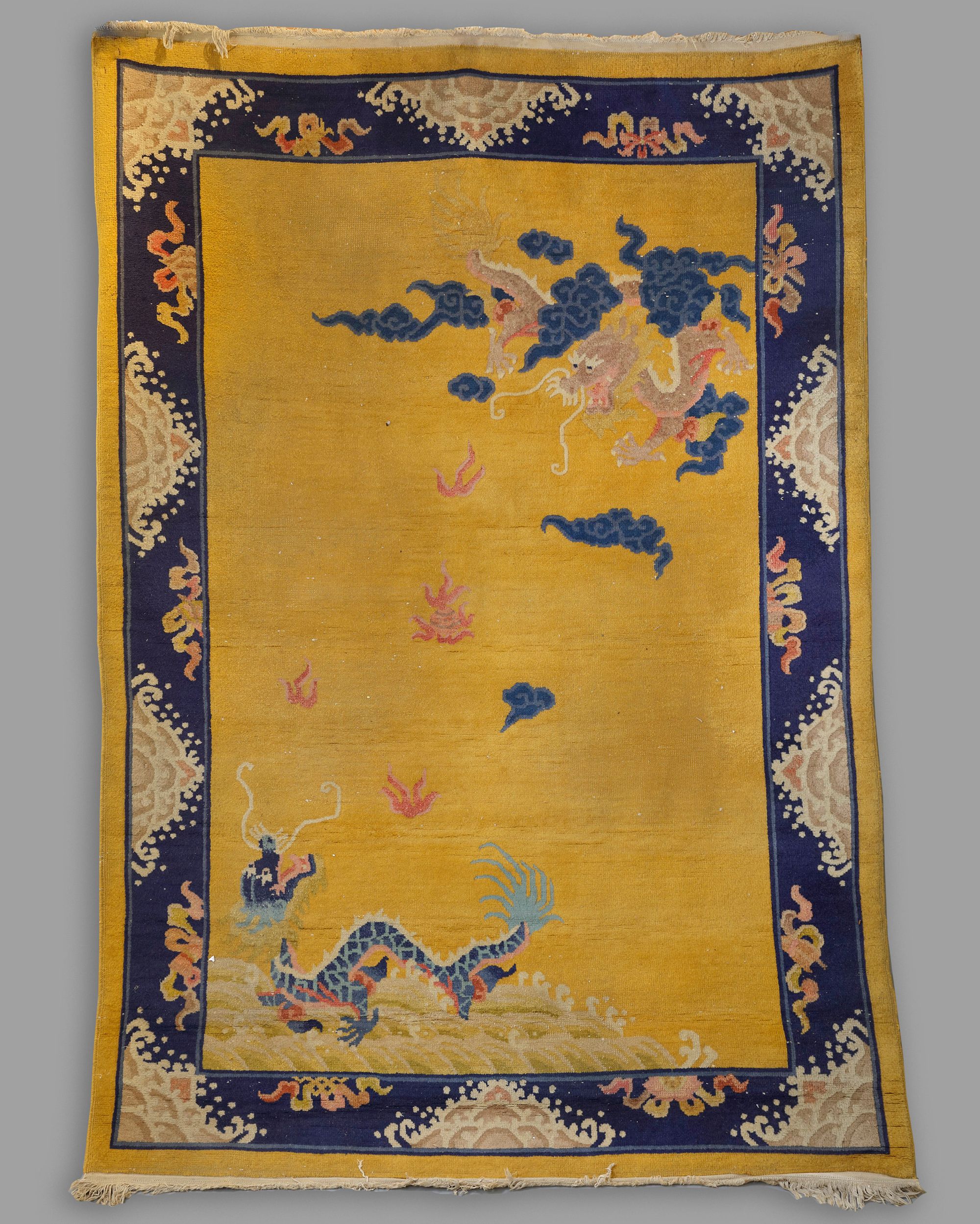 The carpet is woven with a dragon amongst clouds to one corner and a dragon amongst waves to the other, with a flaming pearl between them, all surrounded by a band of loose crashing waves and the Eight Buddhist Emblems.