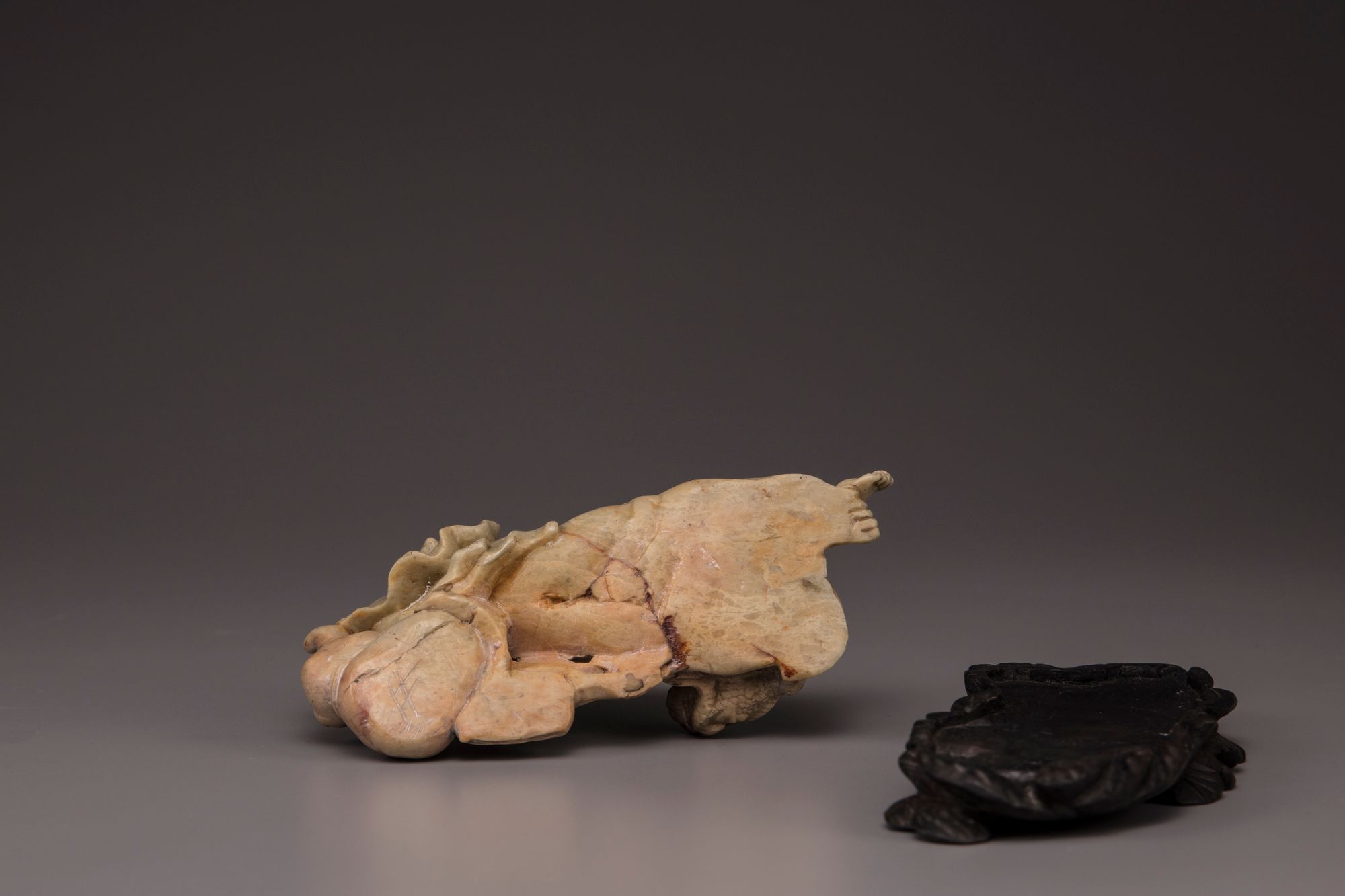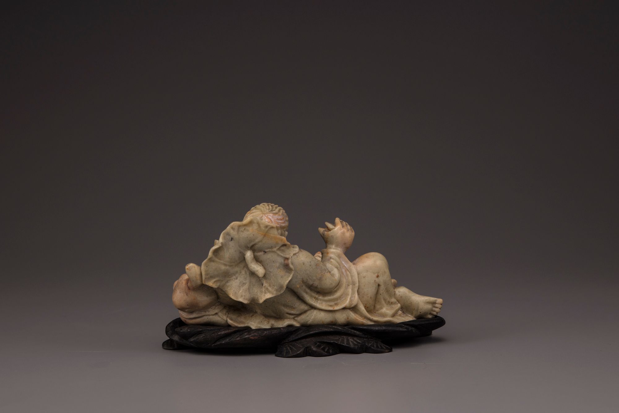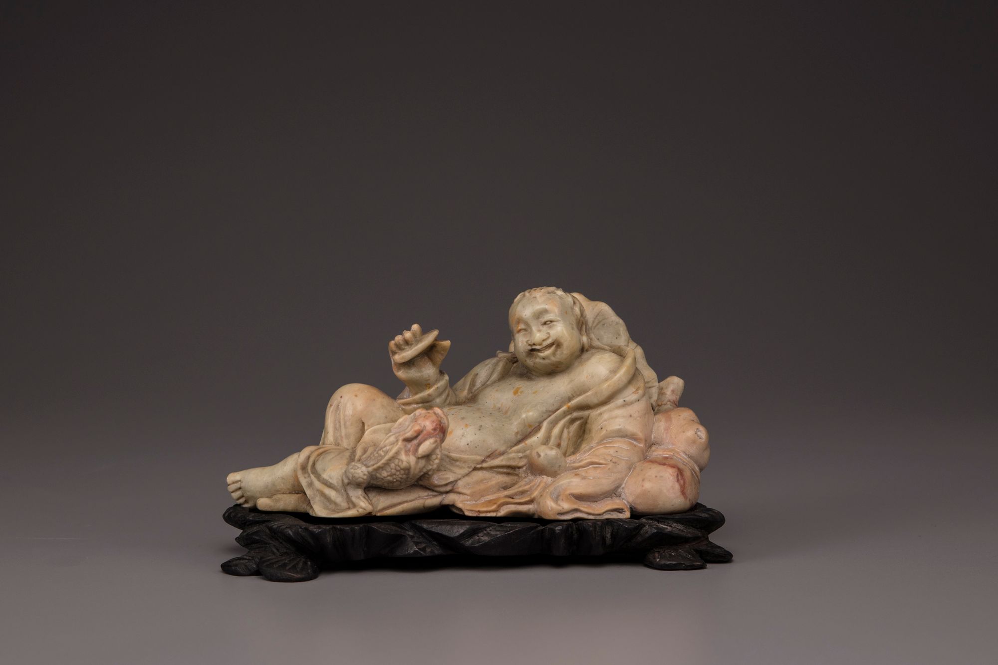 The laughing figure is finely carved with long robes holding a coin in his right hand, the three legged toad is carved clambering on his leg.
