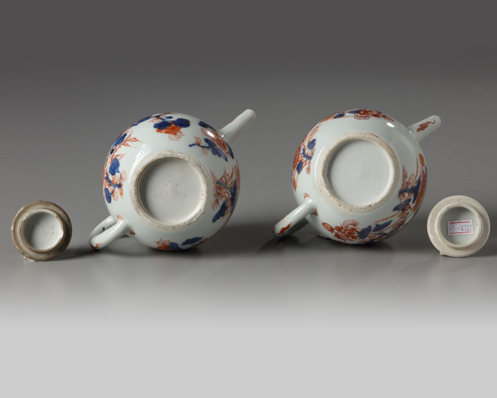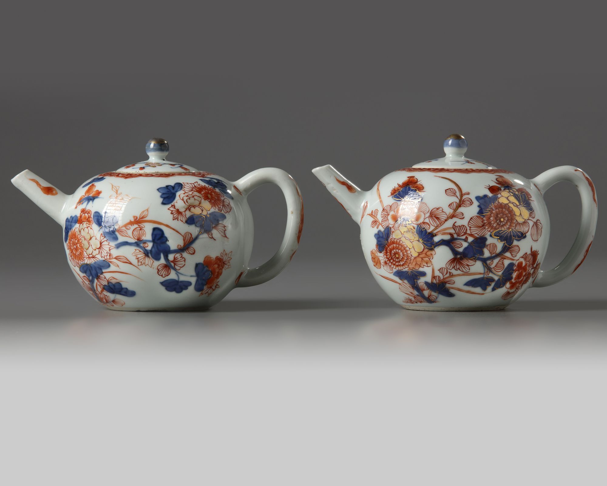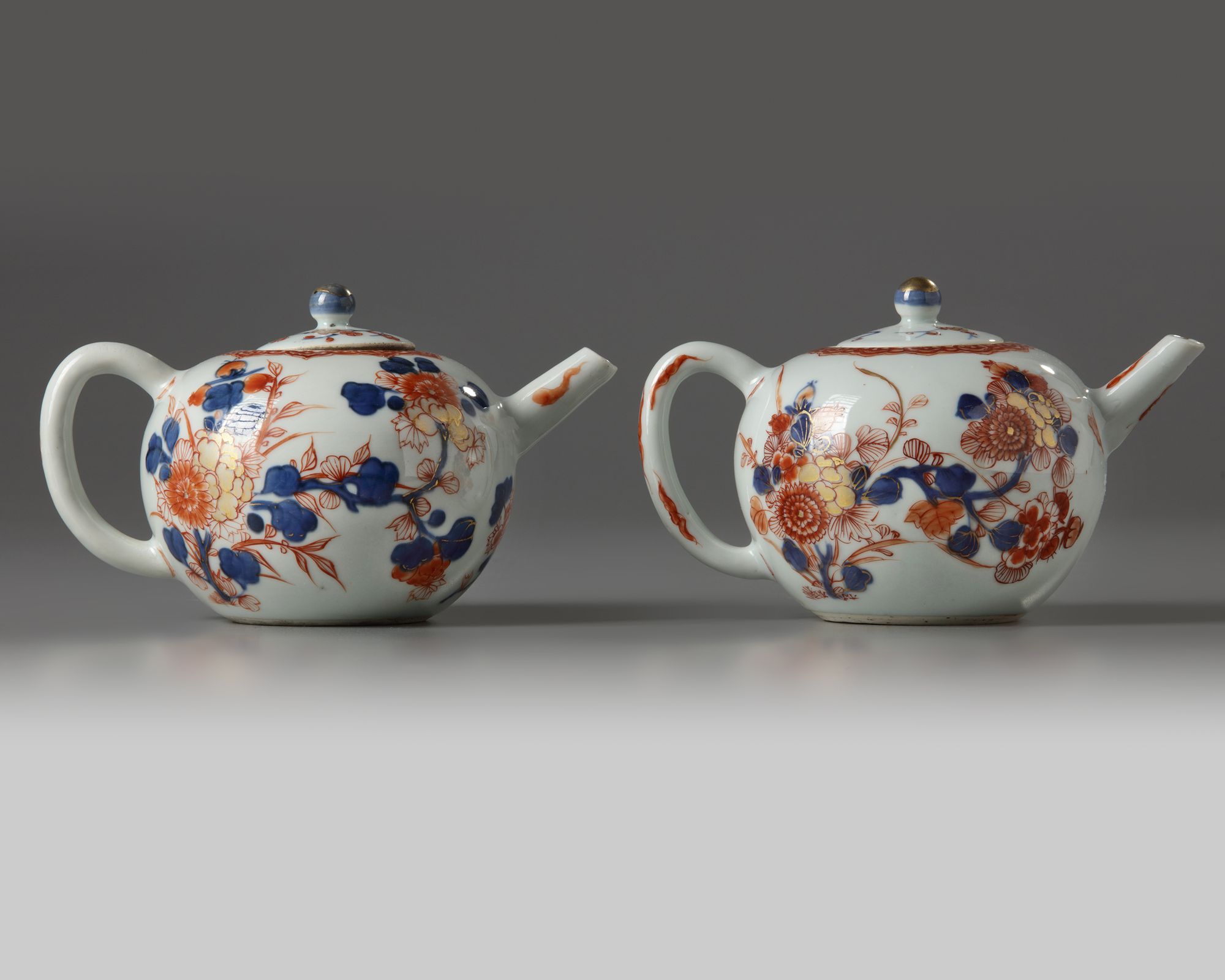 A PAIR OF CHINESE IMARI 'FLORAL' TEAPOTS AND COVERS, KANGXI PERIOD (1662-1722)