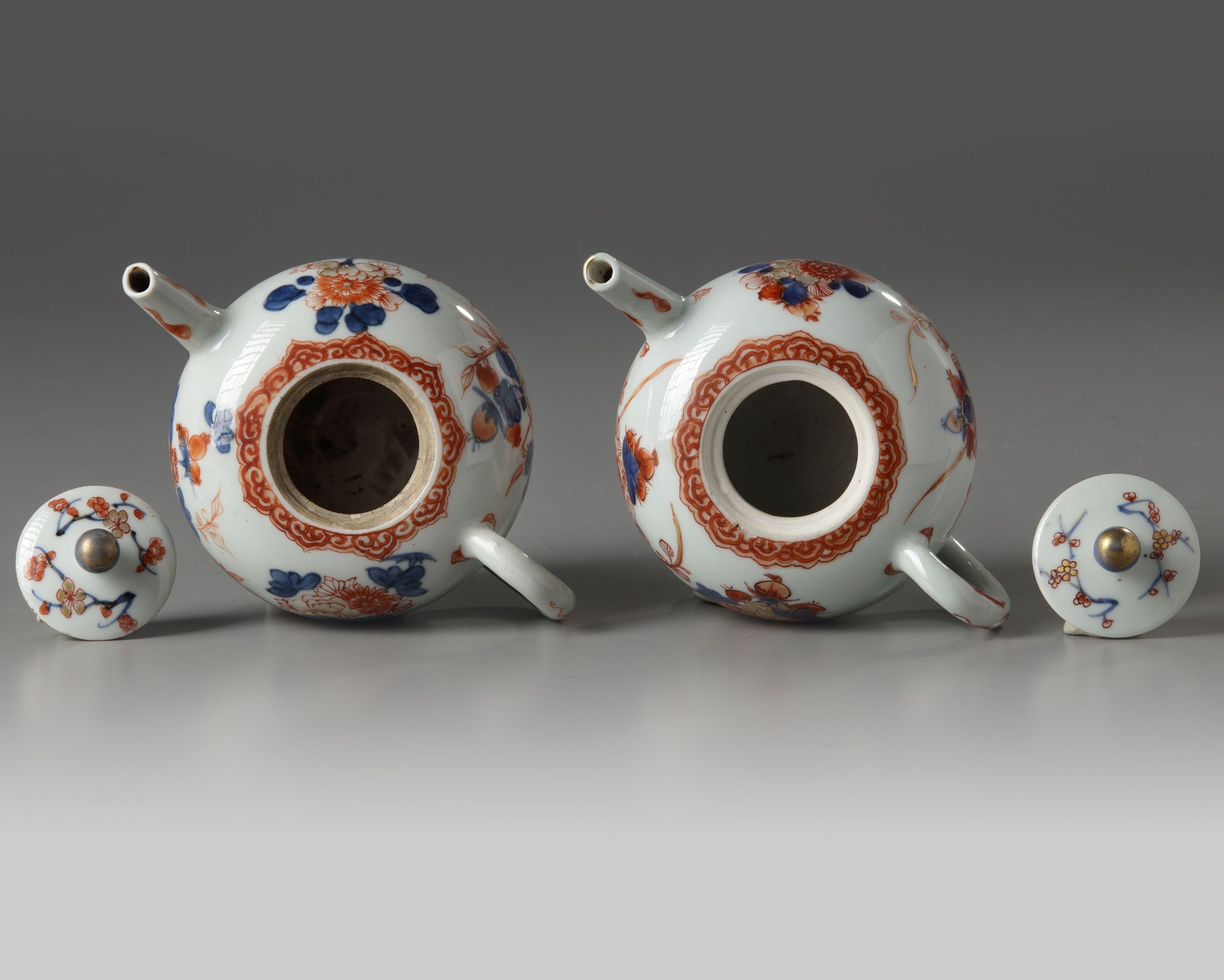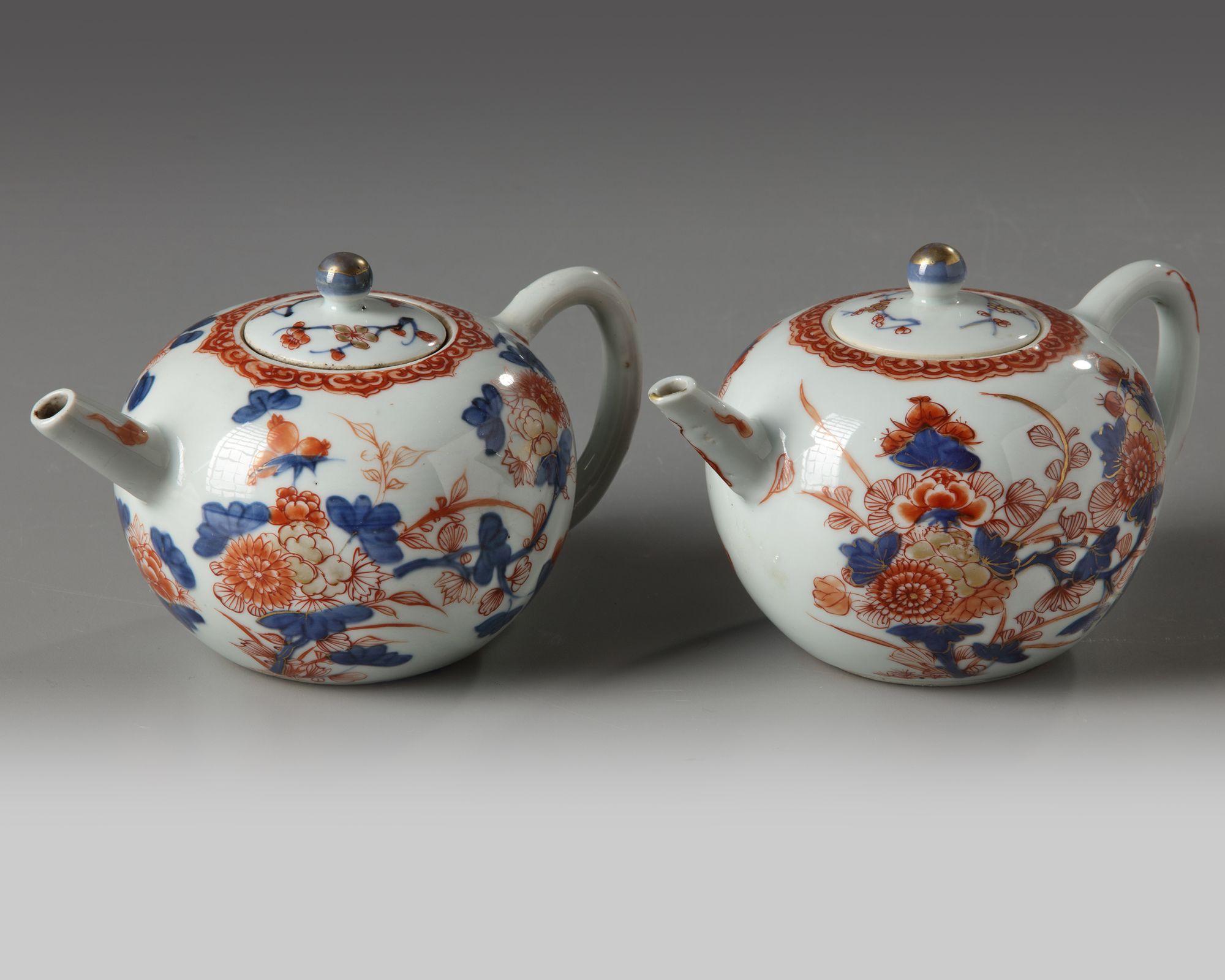 Each teapot is decorated and gilt with branch chrysanthemum and peonies to both sides, the rim is decorated with an iron-red ruyi-head band. The cover is decorated with prunus sprays and is surmounted by a ball finial.