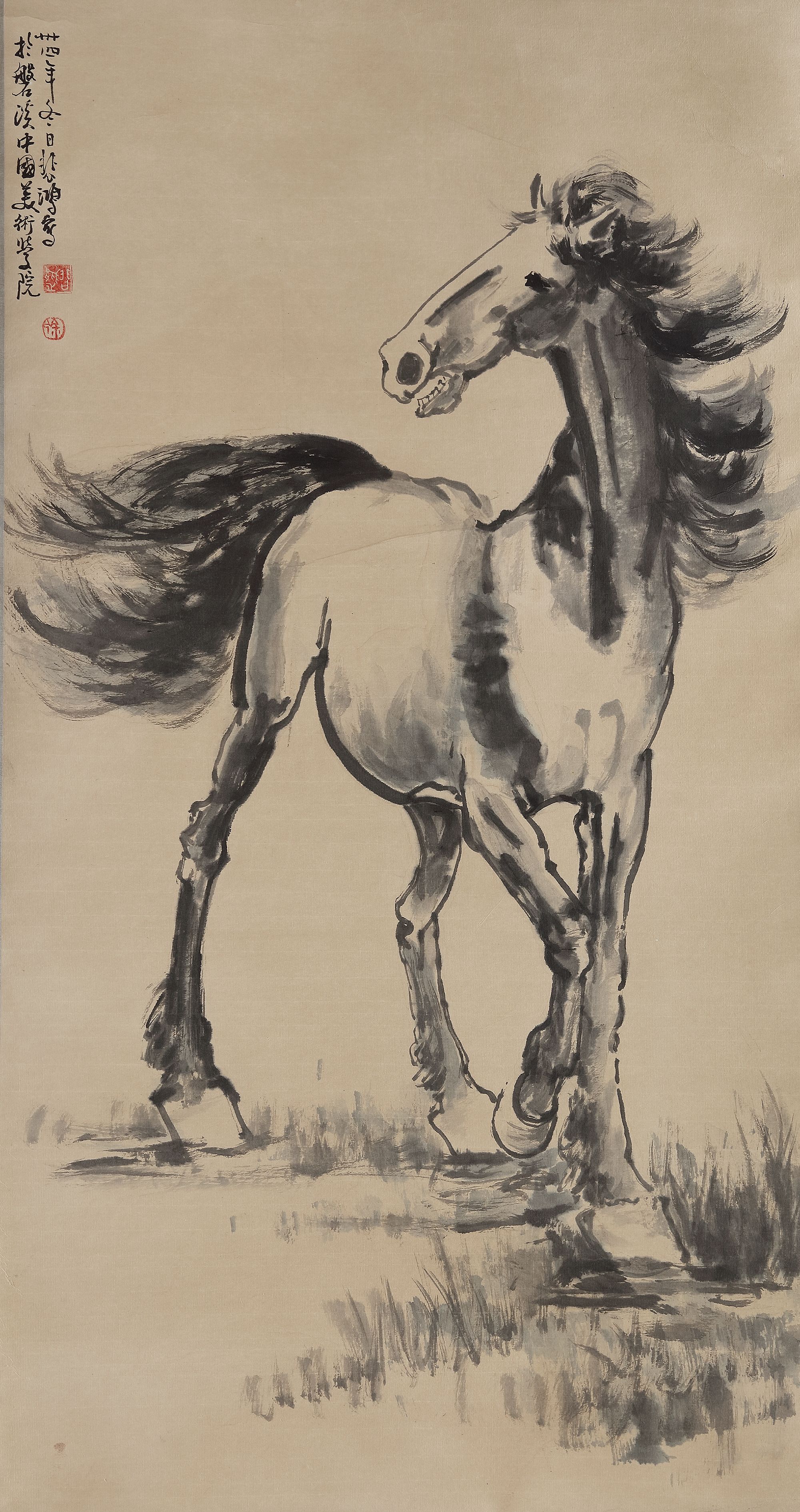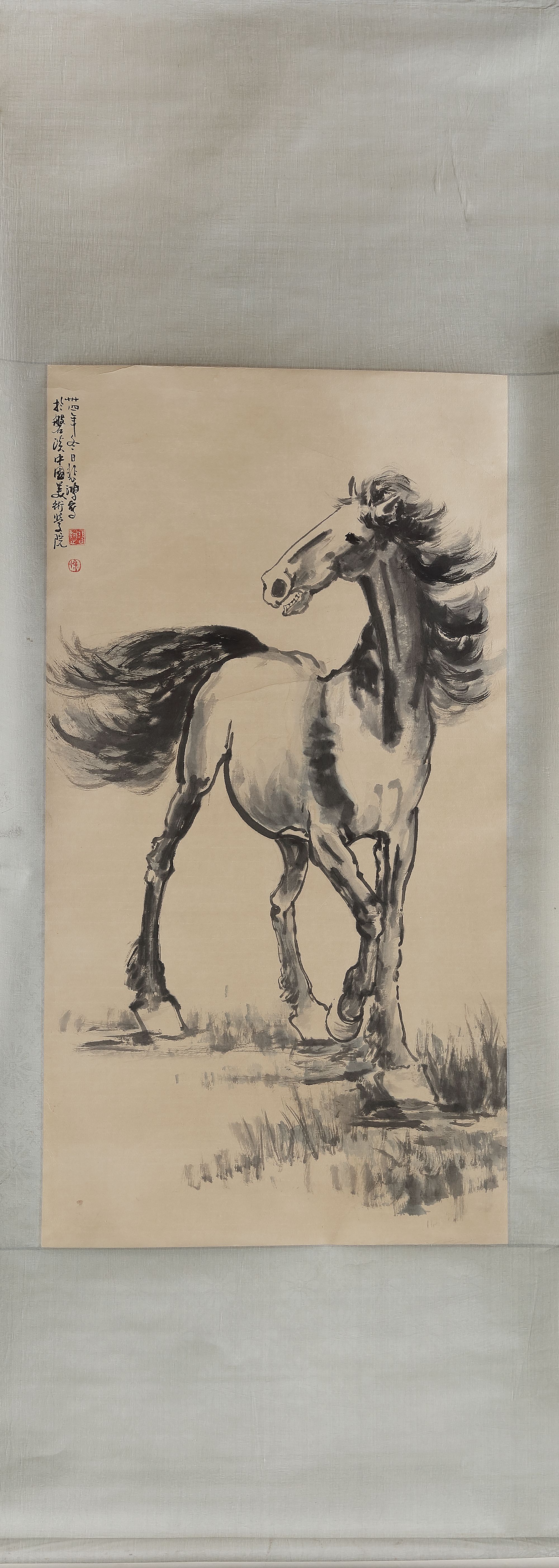 A scroll depicting a horse. Mounted, ink on the paper. With signature of Xu Beihong, dated 1934. Size of painting: 52 x 97 cm.