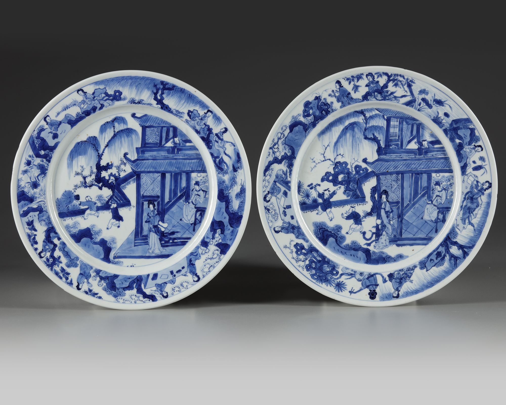 Each dish is decorated to the centre with a lady and a gentleman seated on an open terrace with two boys at play. Each rim is decorated with further ladies at leisure. Each reverse is decorated with flowers, and each base bears an elaborate floral mark.