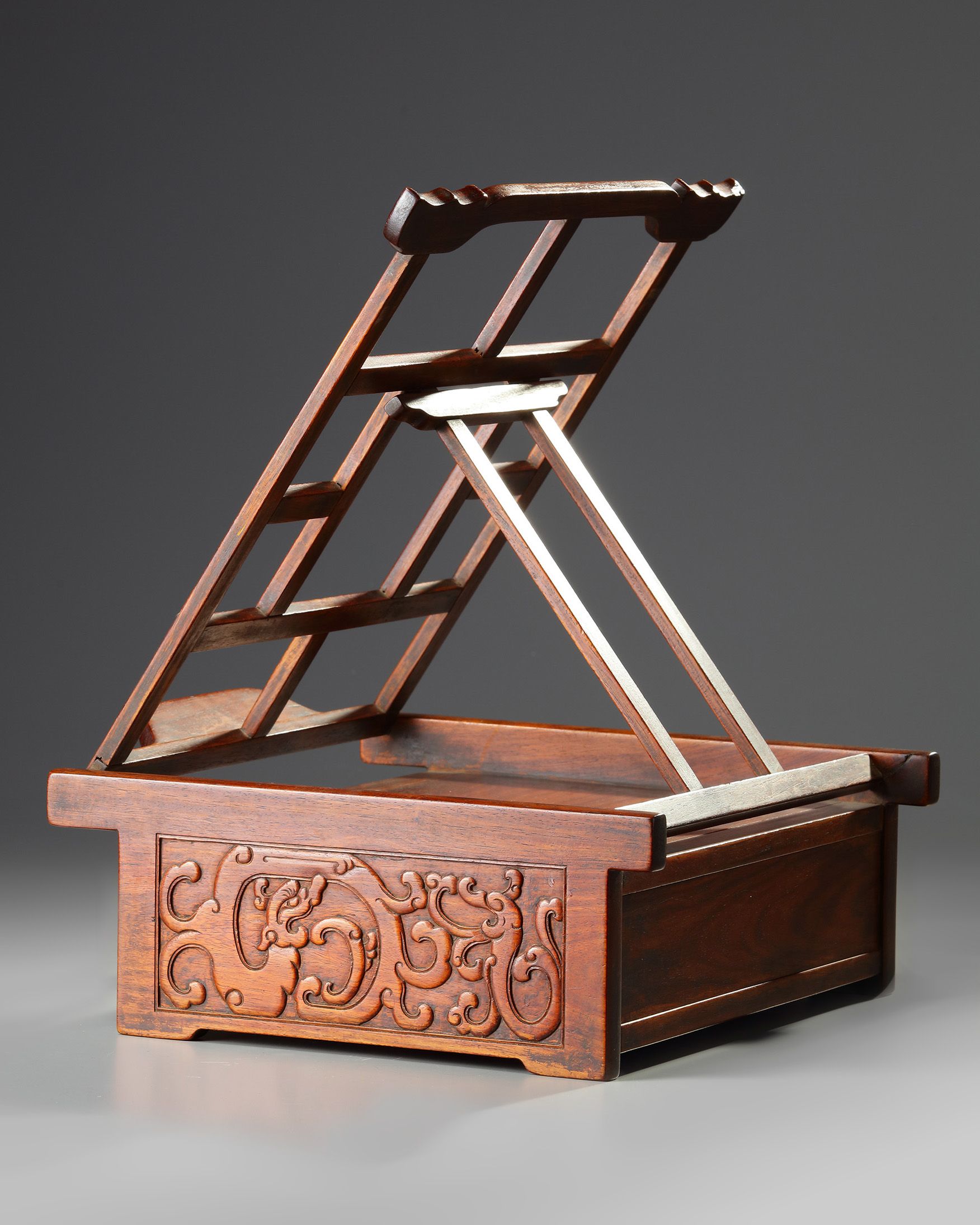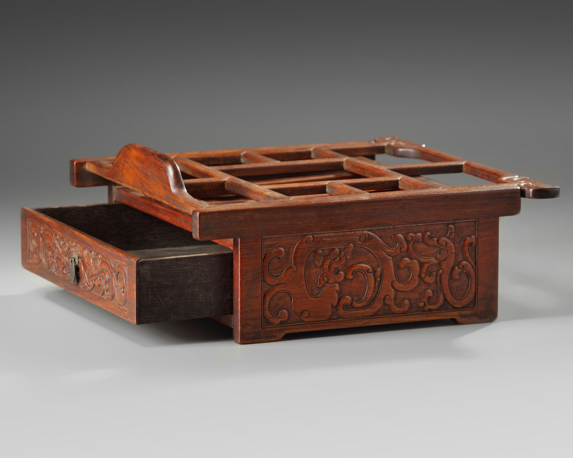 The geometric openwork stand is decorated with two ruyi-shaped ends, and can be folded in two parts. The base is fitted with a single drawer and the front and two sides are decorated in low relief with scrolling qilin.