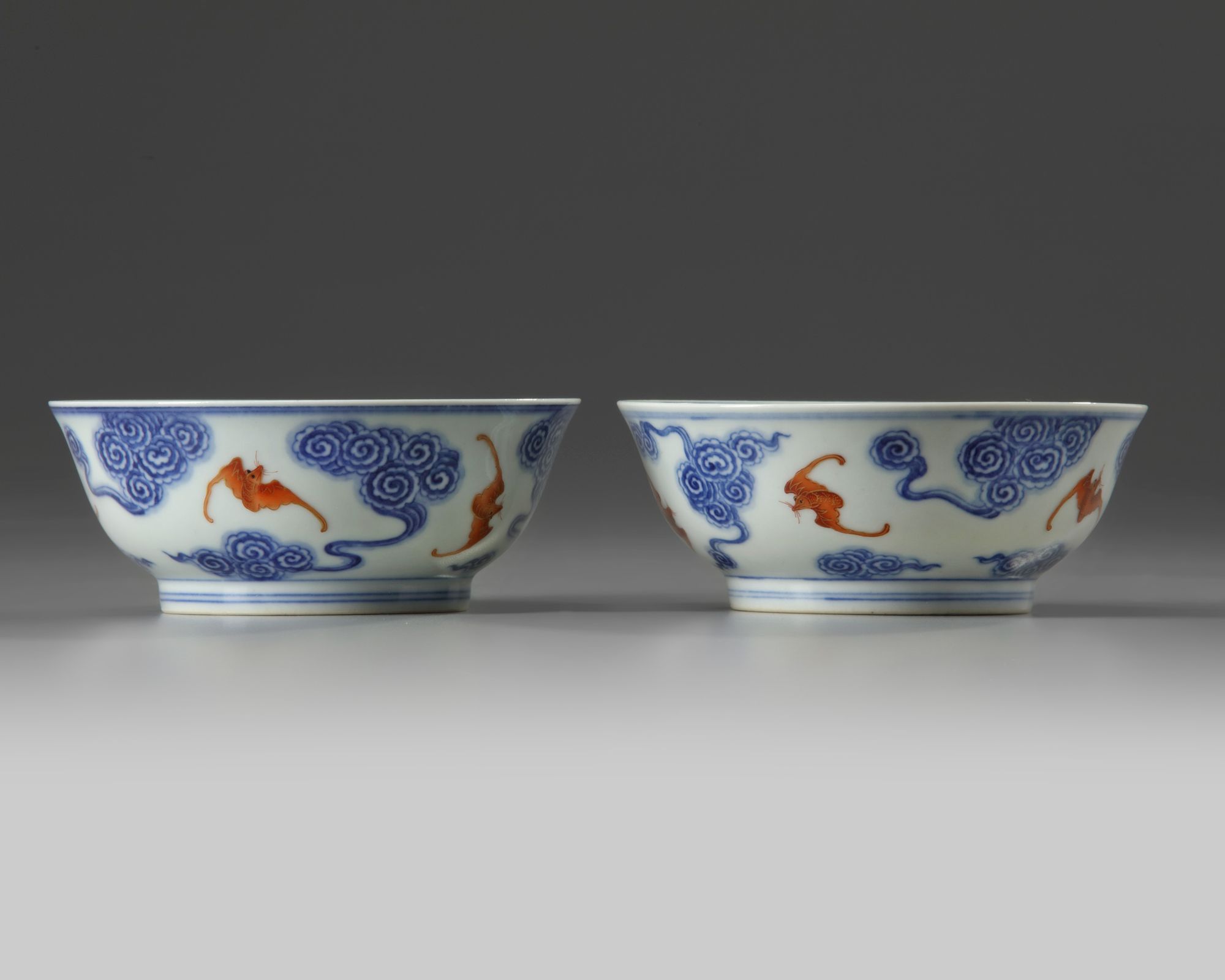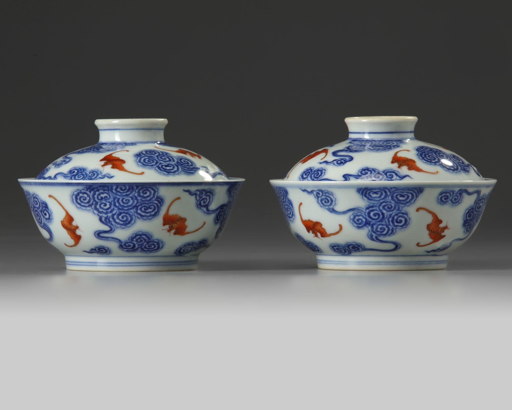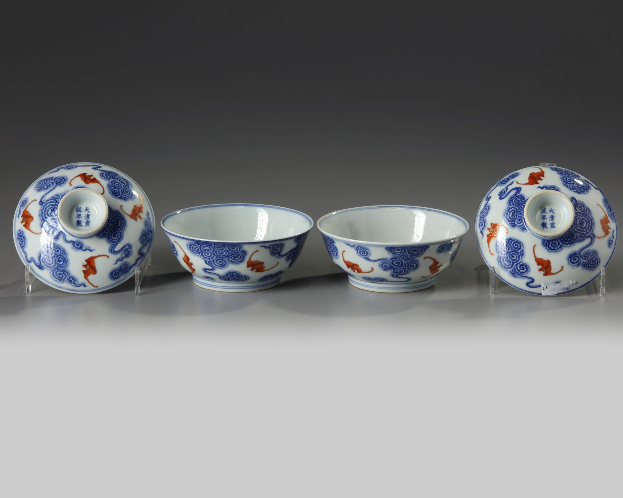 Each bowl is decorated to the interior with three bats in flight amongst scrolling clouds, and the exterior with five bats in flight amongst futher clouds. The cover is decorated with four bats. The bowls and covers are marked with a Tongzhi six-character mark in underglaze blue.