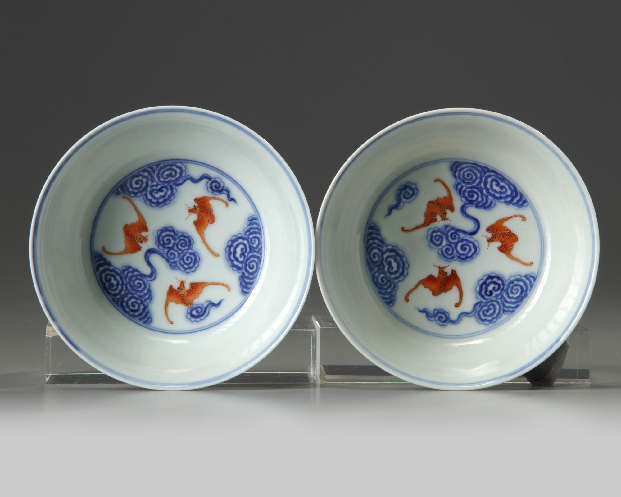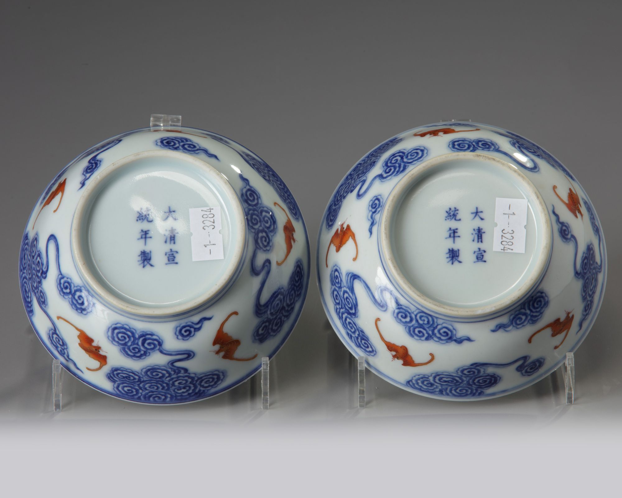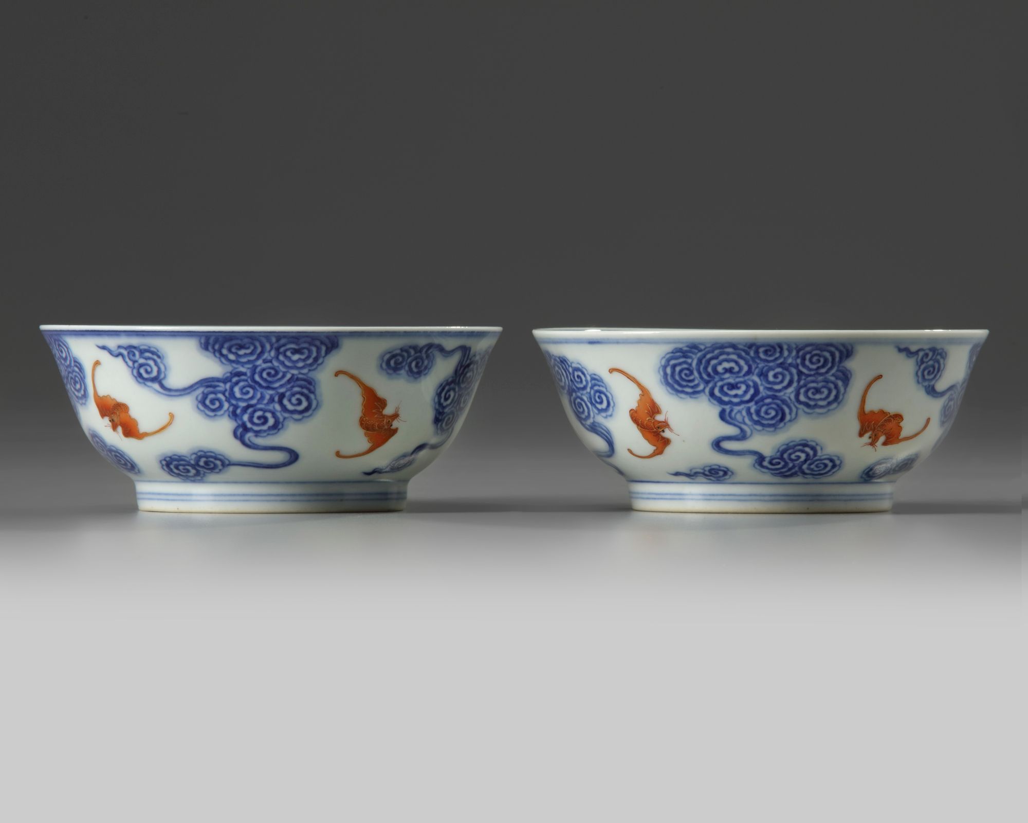 Each bowl is decorated to the interior with three bats in flight amongst scrolling clouds, and the exterior with five bats in flight amongst futher clouds. The cover is decorated with four bats. The bowls and covers are marked with a Tongzhi six-character mark in underglaze blue.