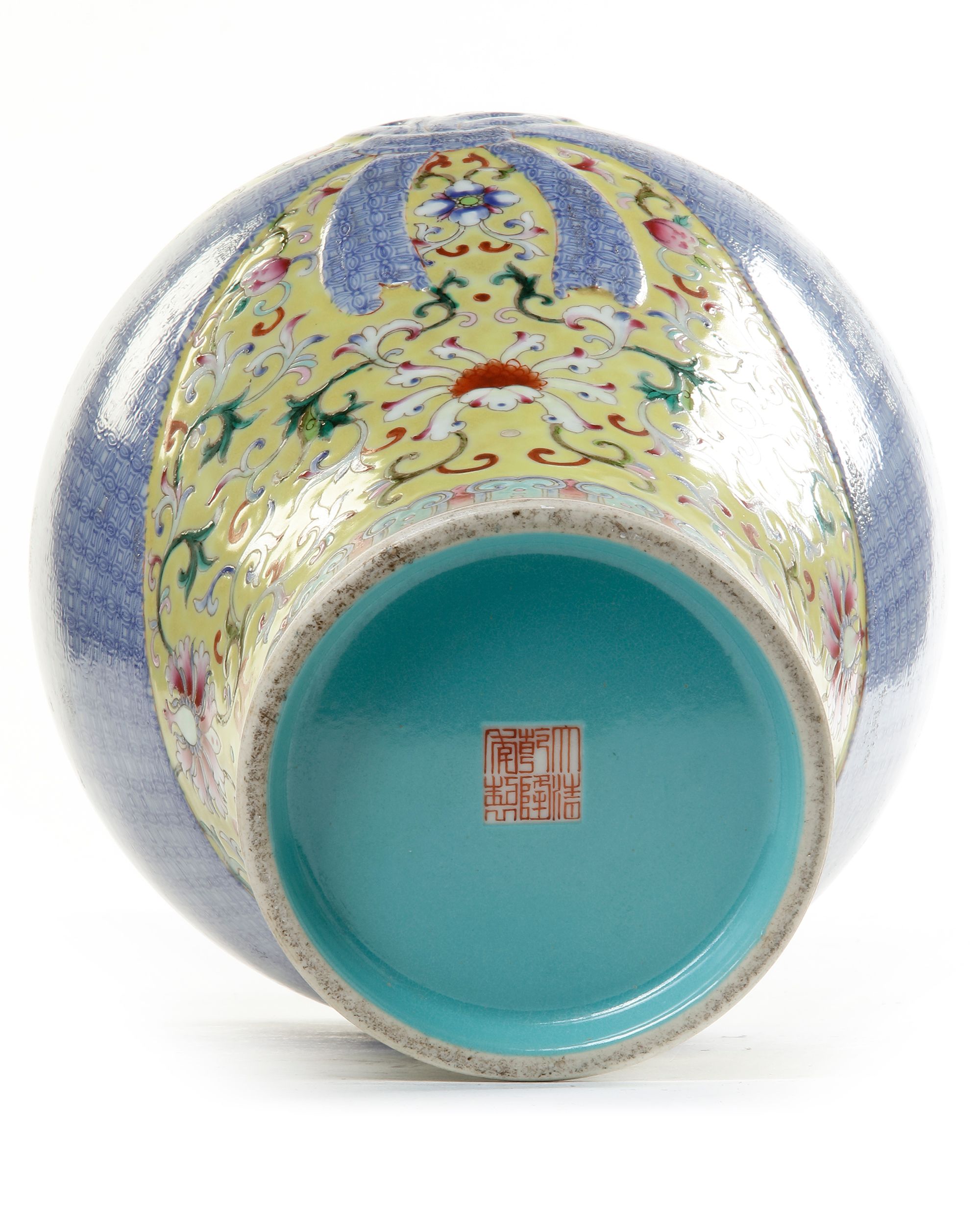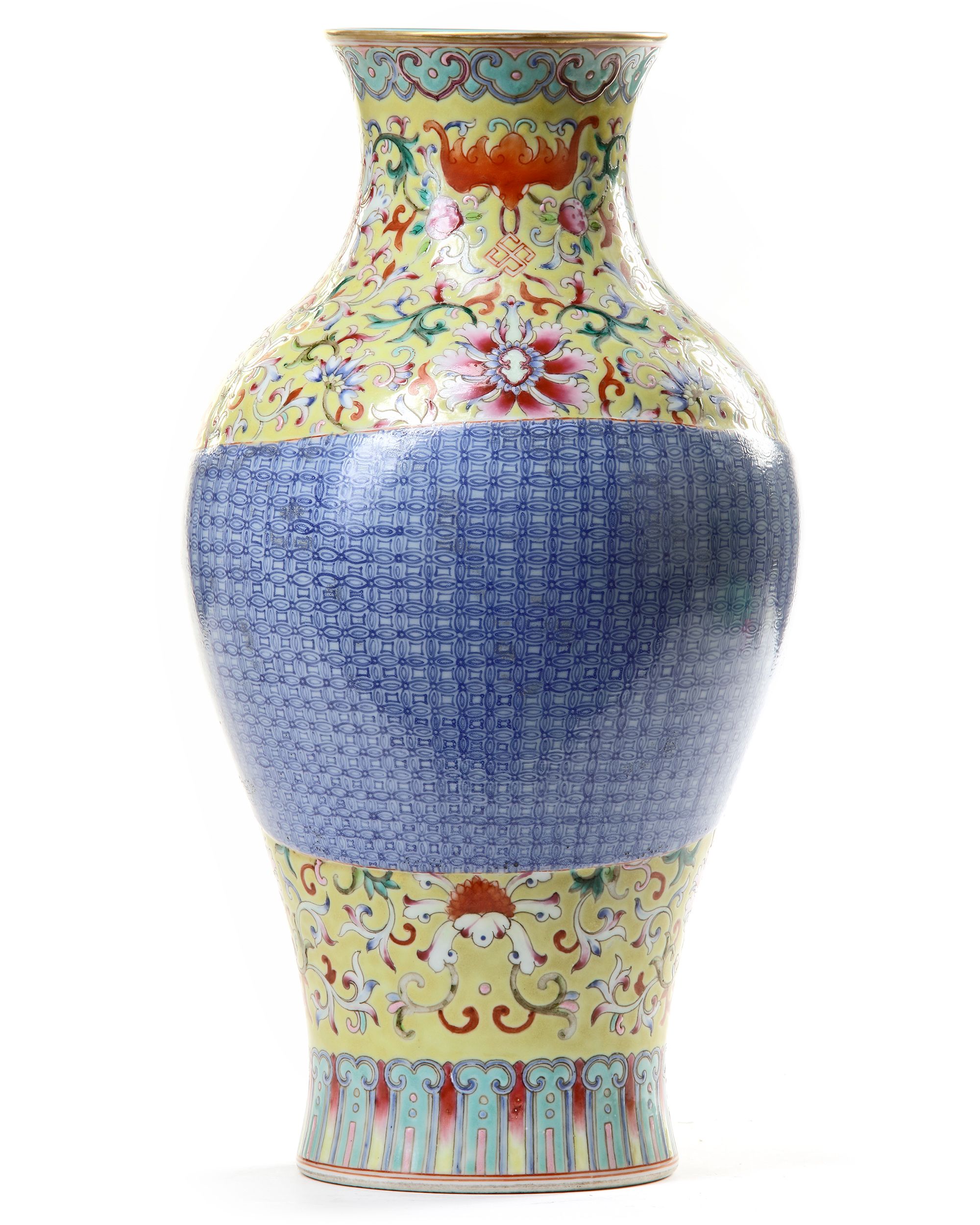 The vase is decorated with a moulded blue-enamelled ribbon tied around its body, all above bats and large leafy scrolling lotus reserved on a yellow ground below a ruyi-head to the rim and a lappet band to the foot. The interior and base are glazed turquoise, with an apocryphal Qianlong mark. 34.5 cm.