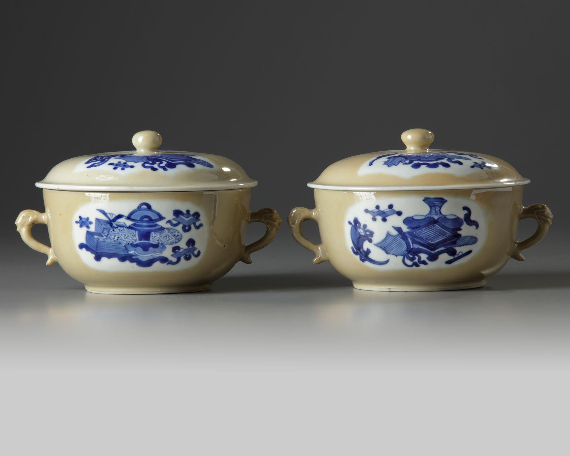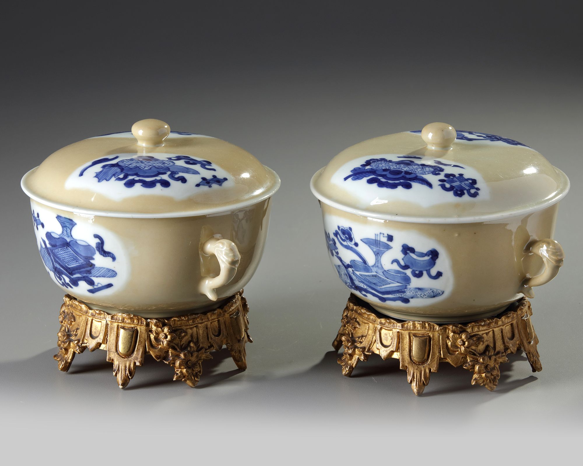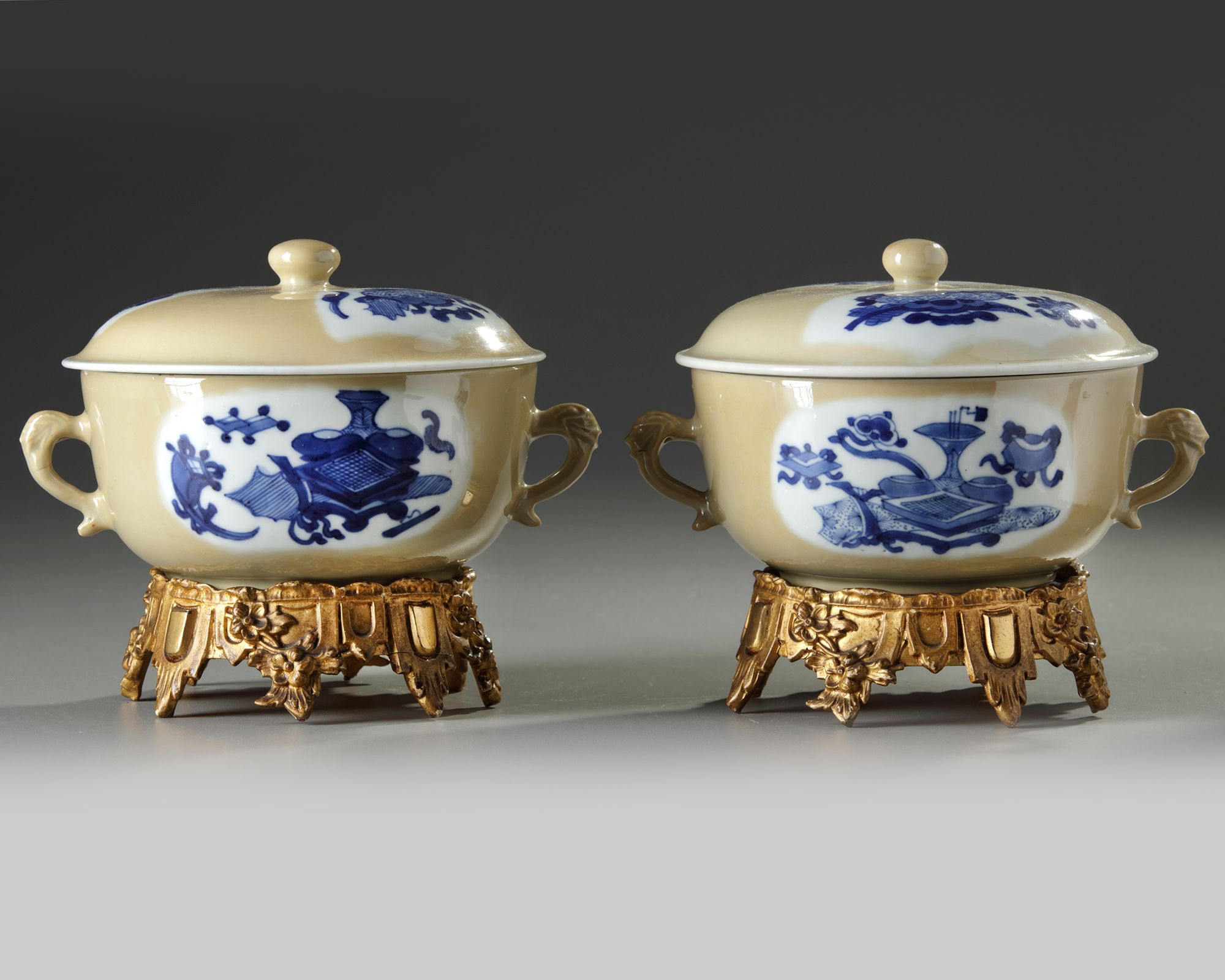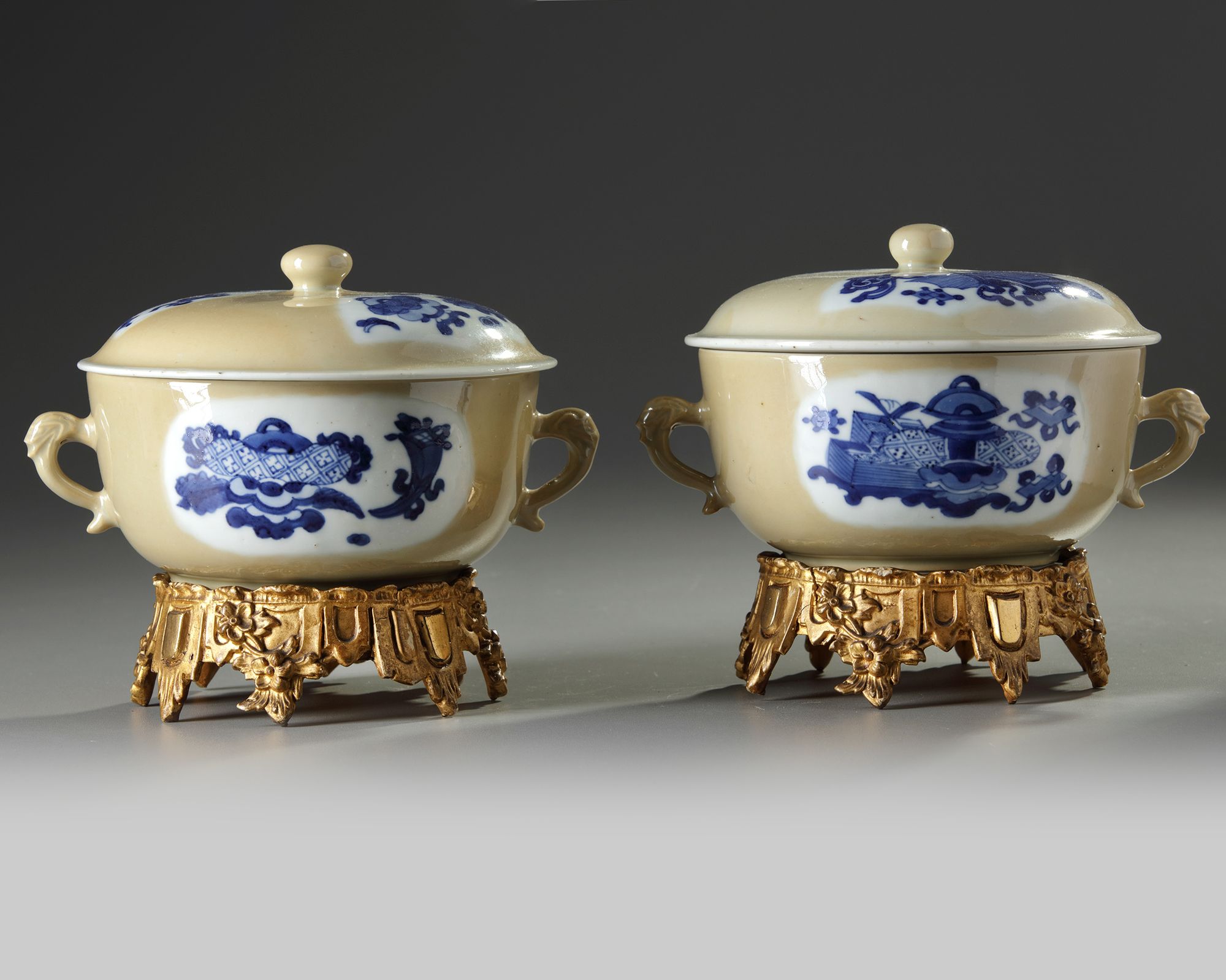 Each potiche is fashioned with two slender beast-head handles, each side is decorated with two shaped panels enclosing a multitude of precious objects. The slightly domed covers are similarly decorated and are surmounted by a ball finial.