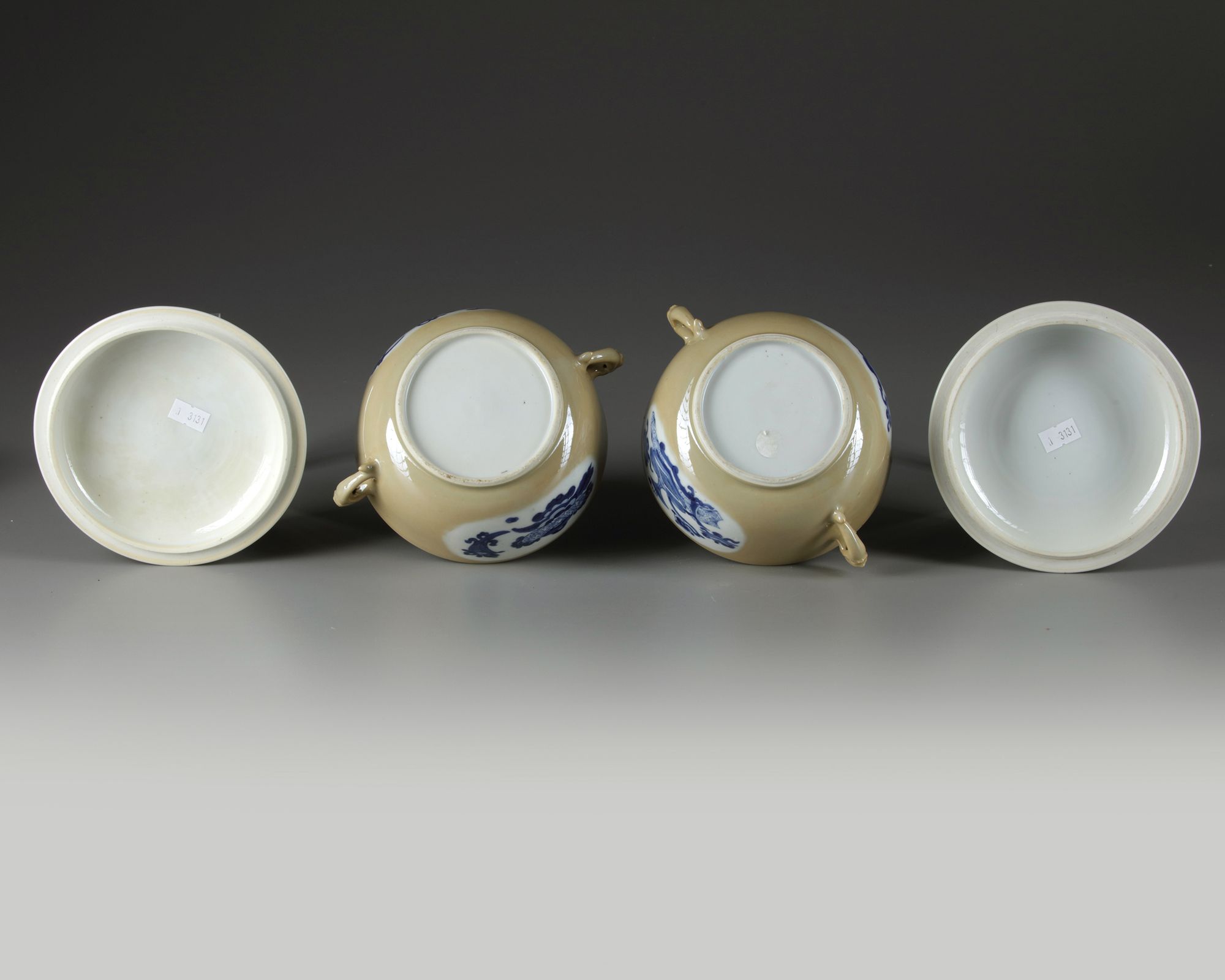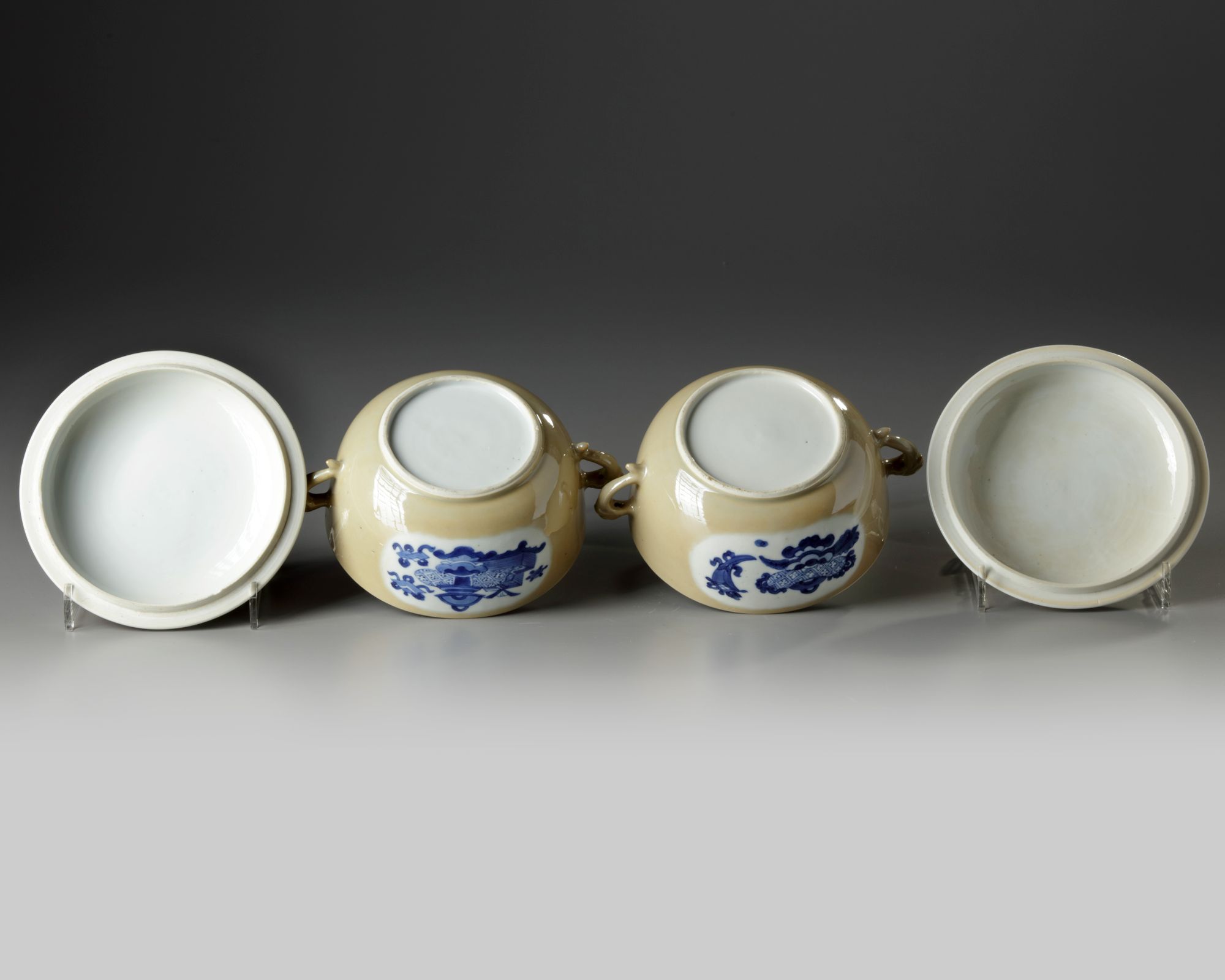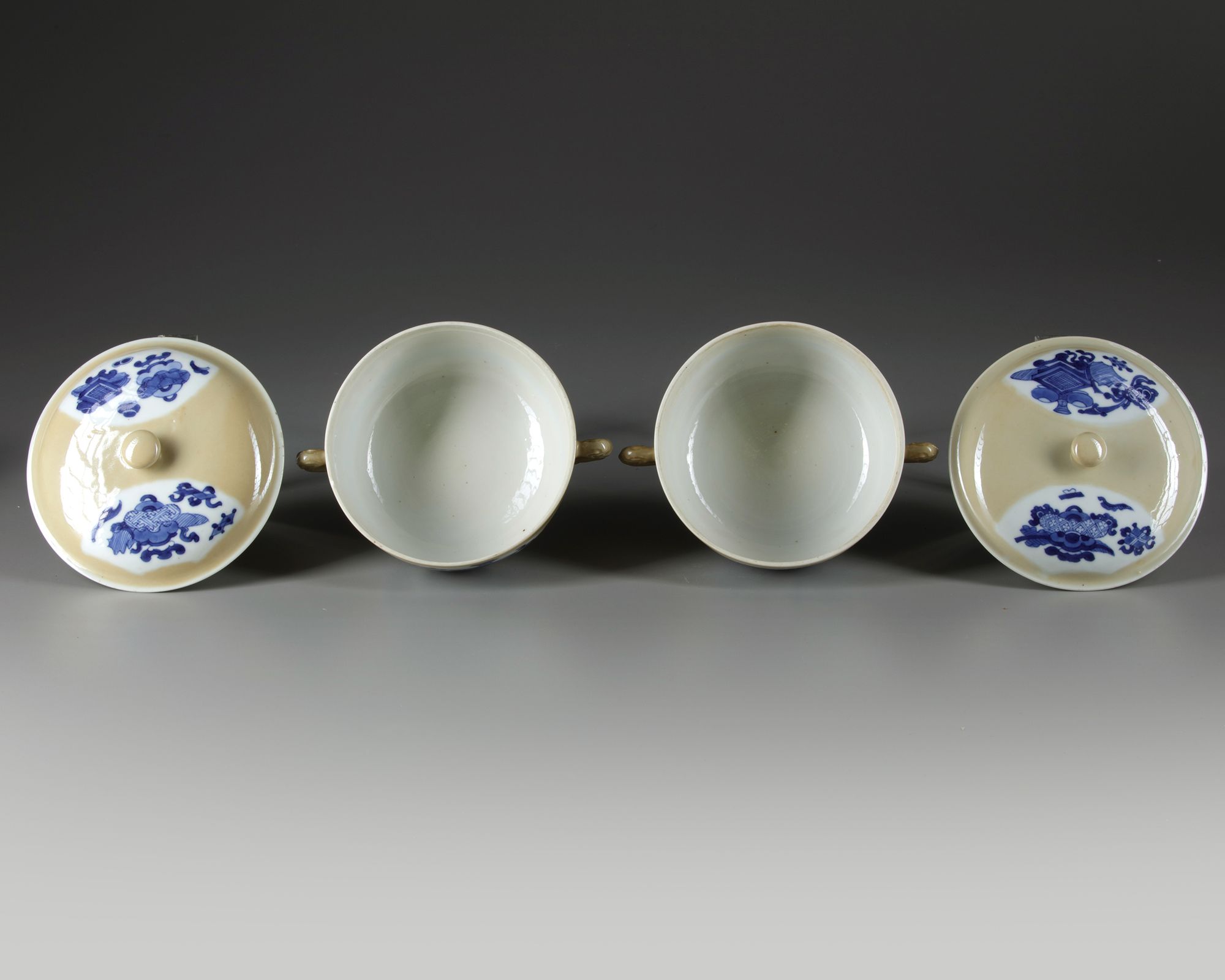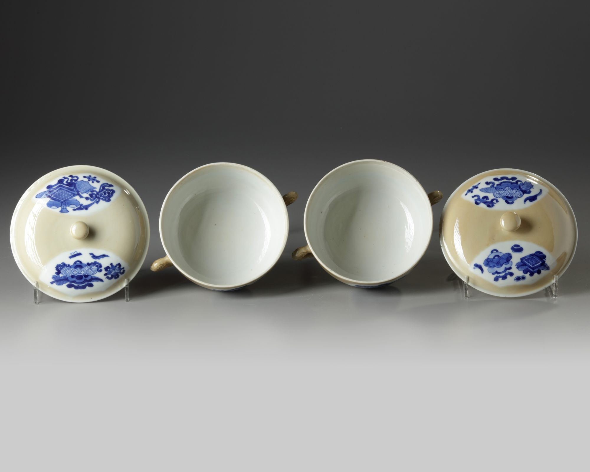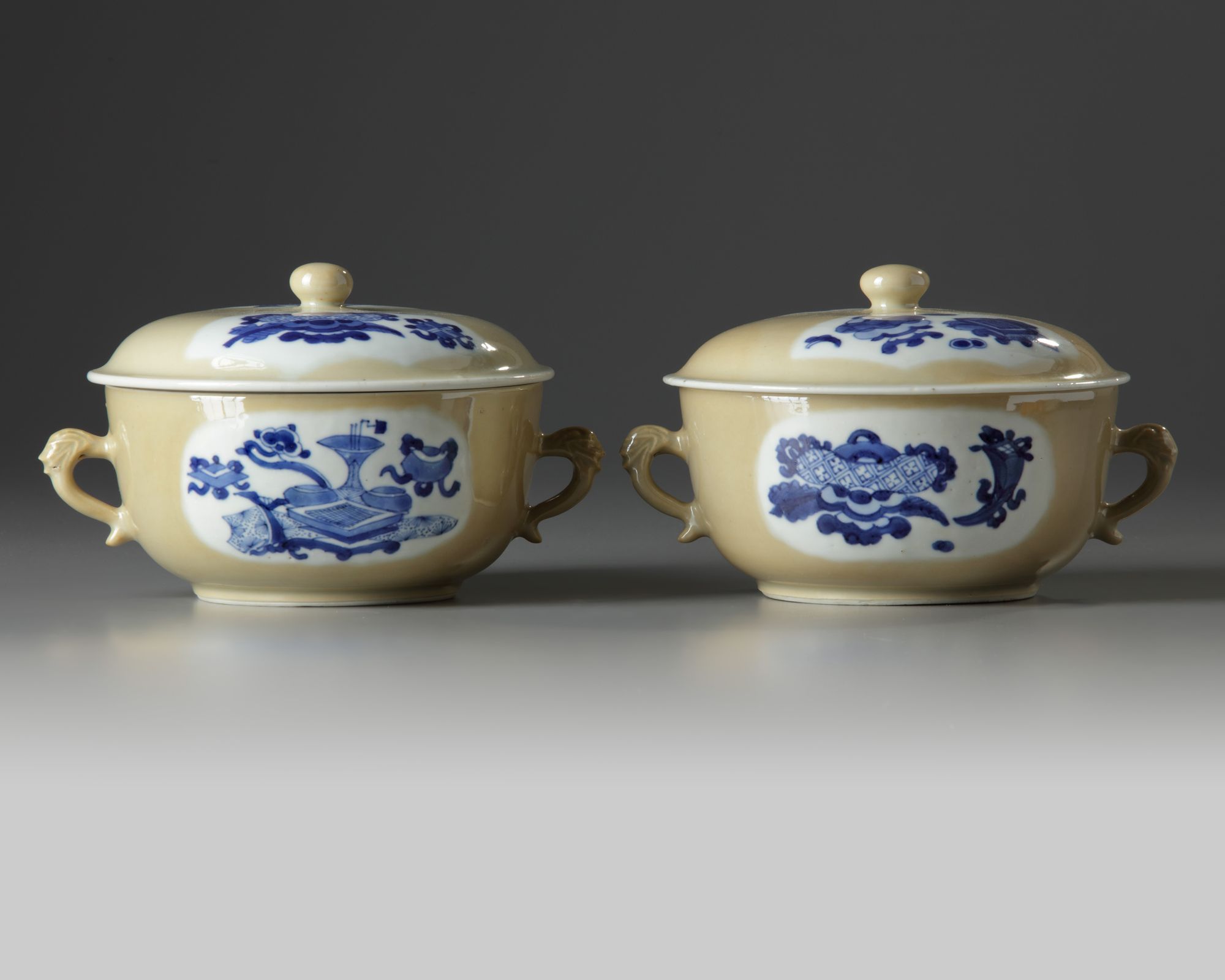 Each potiche is fashioned with two slender beast-head handles, each side is decorated with two shaped panels enclosing a multitude of precious objects. The slightly domed covers are similarly decorated and are surmounted by a ball finial.