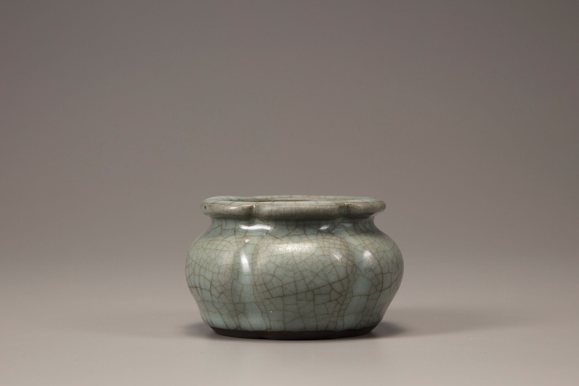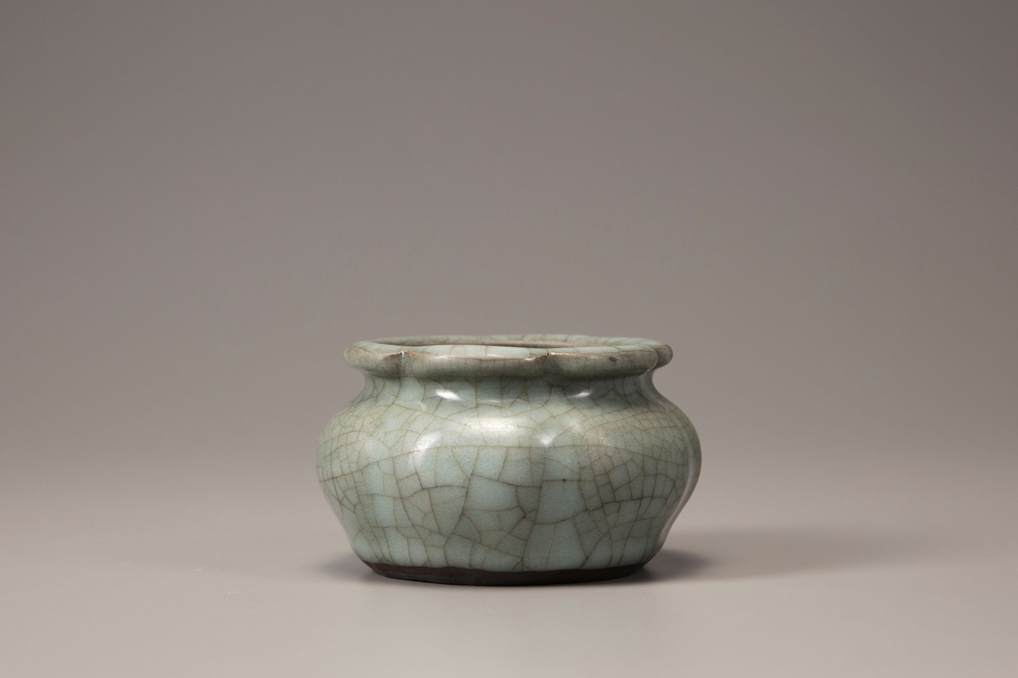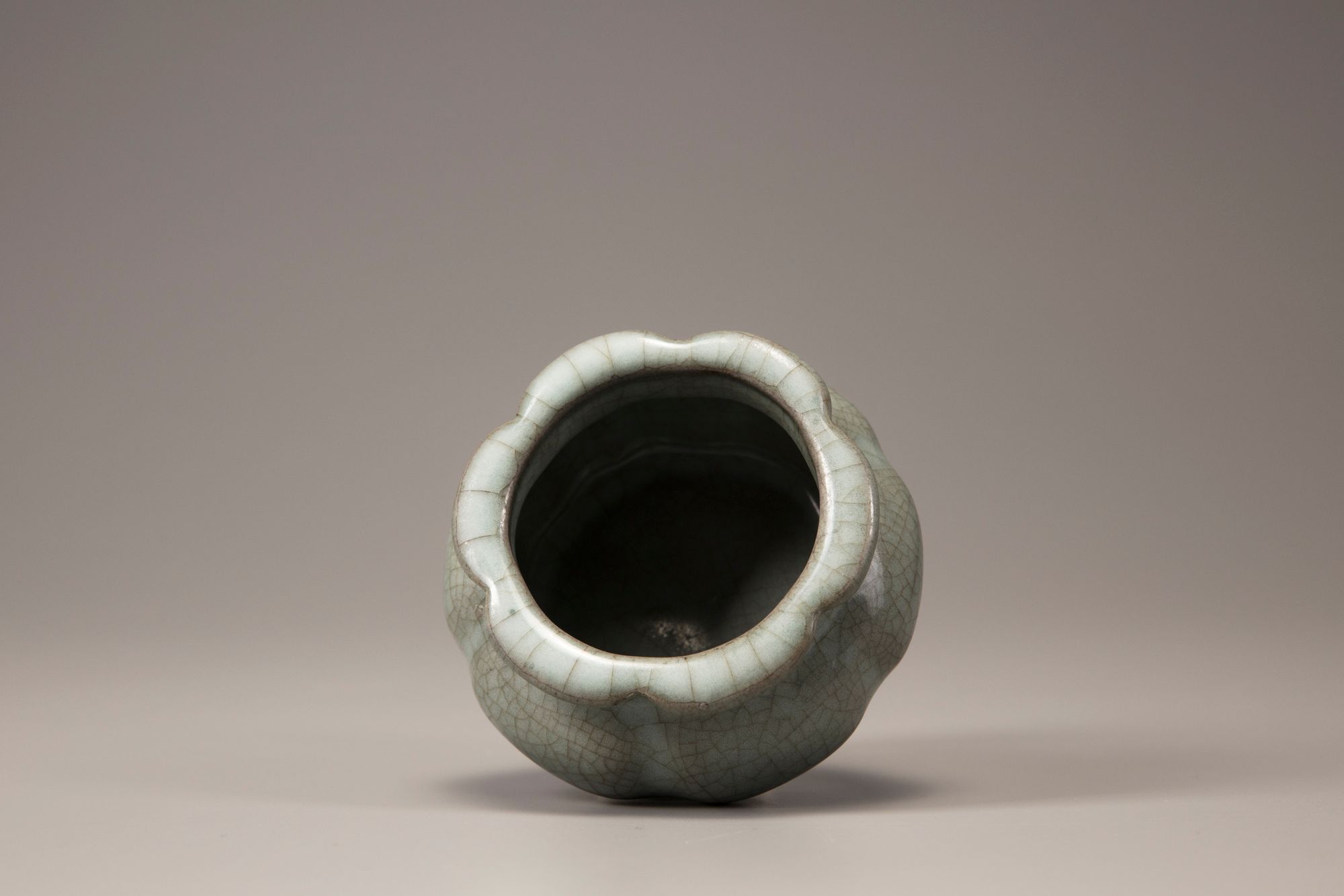 The squat, hexafoil vessel is modelled with an everted rim and is covered overall with an unctuous pale turquoise glaze infused with fine crackles stopping evenly just above the brown slip-glazed foot.