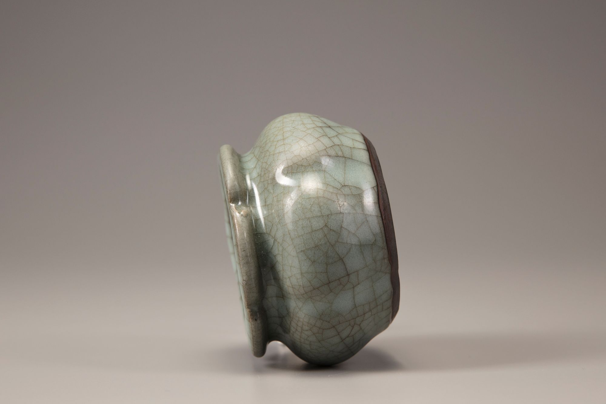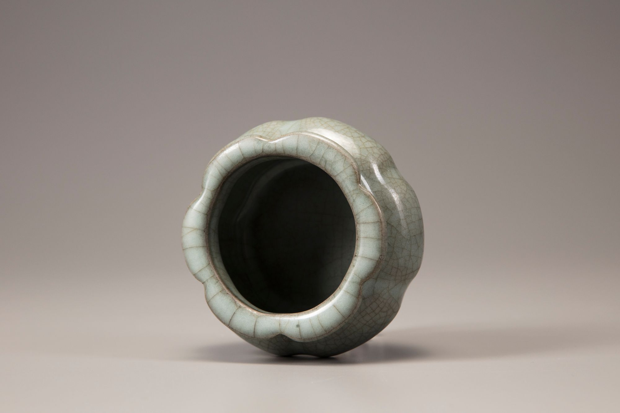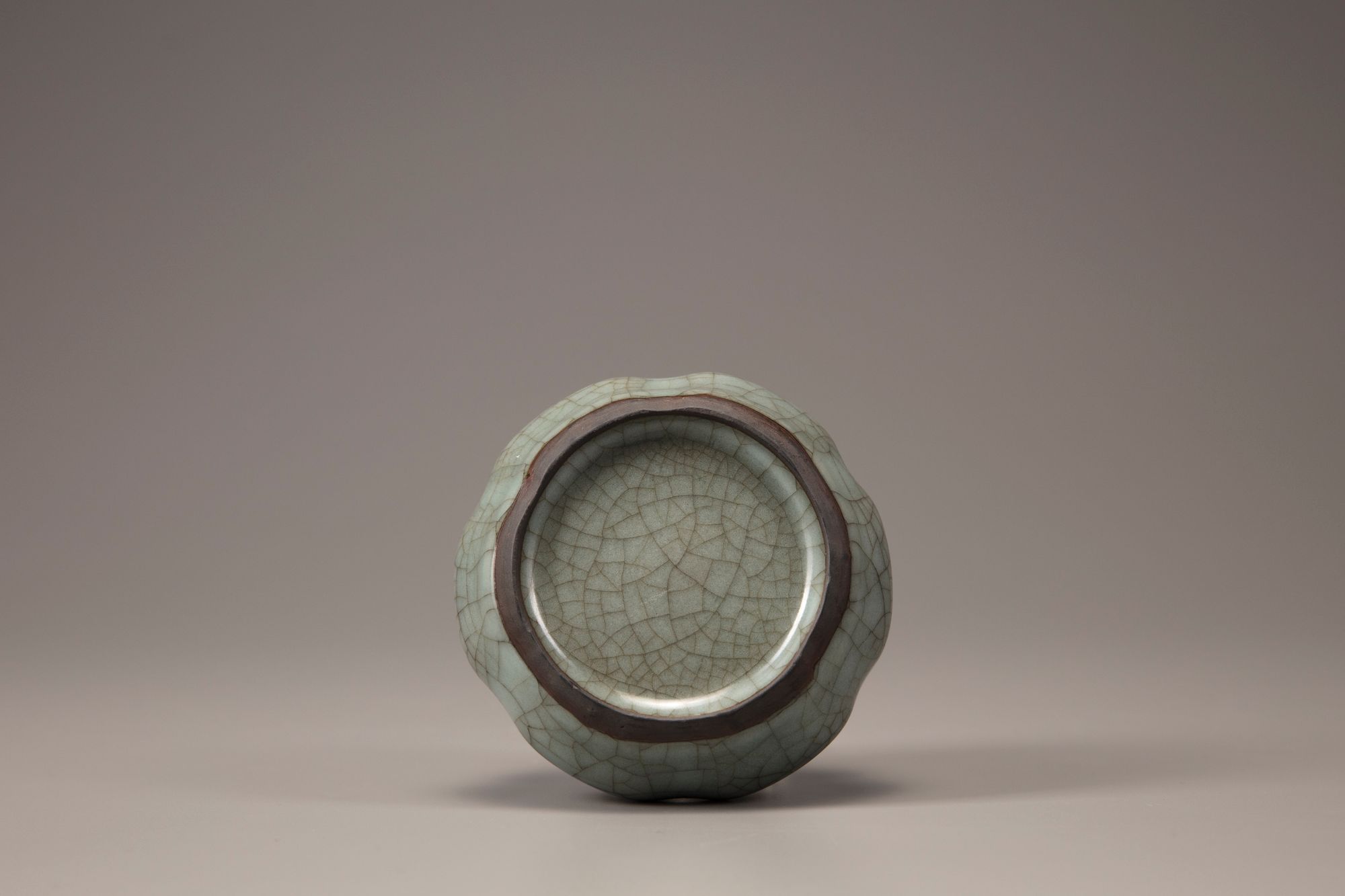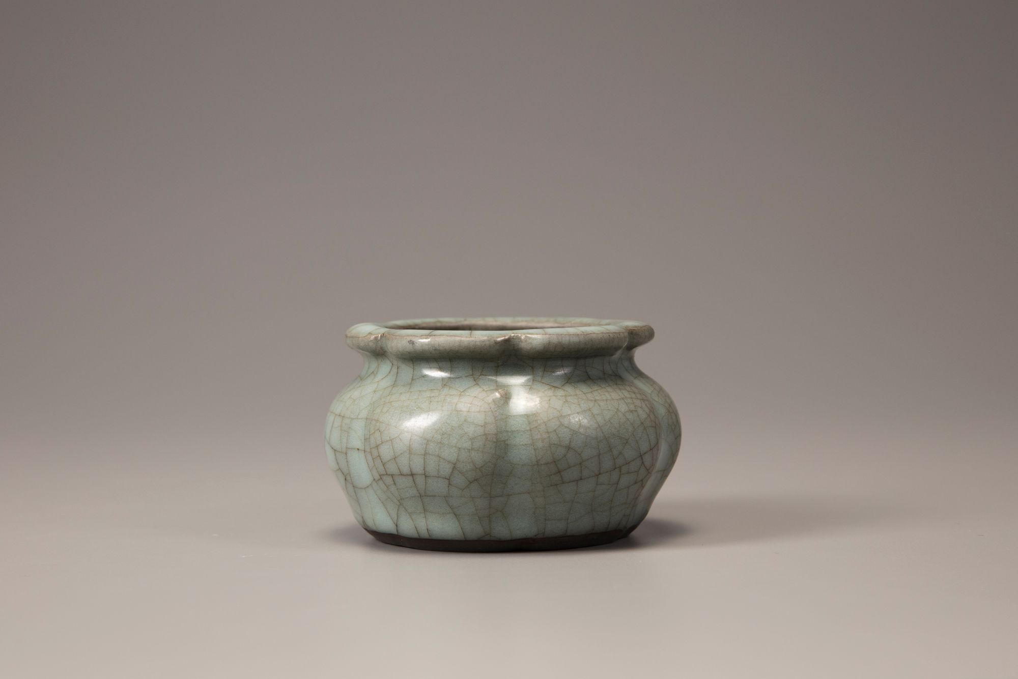 The squat, hexafoil vessel is modelled with an everted rim and is covered overall with an unctuous pale turquoise glaze infused with fine crackles stopping evenly just above the brown slip-glazed foot.