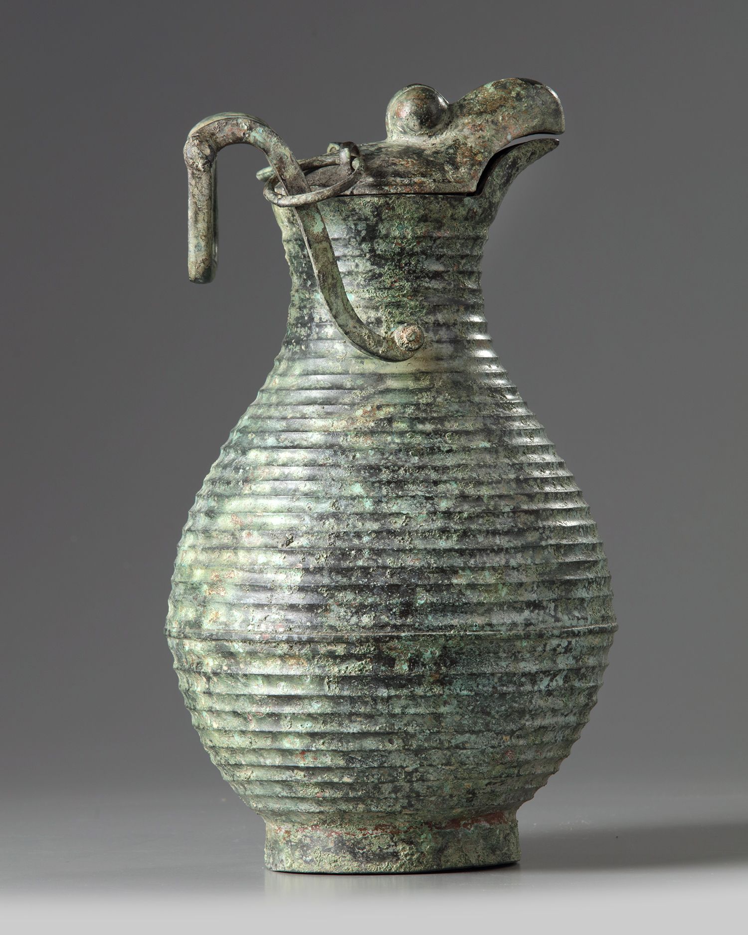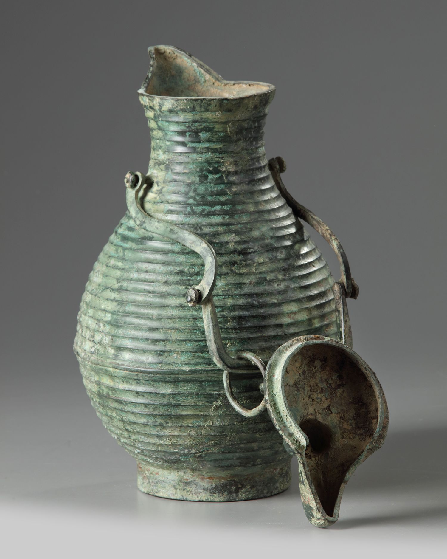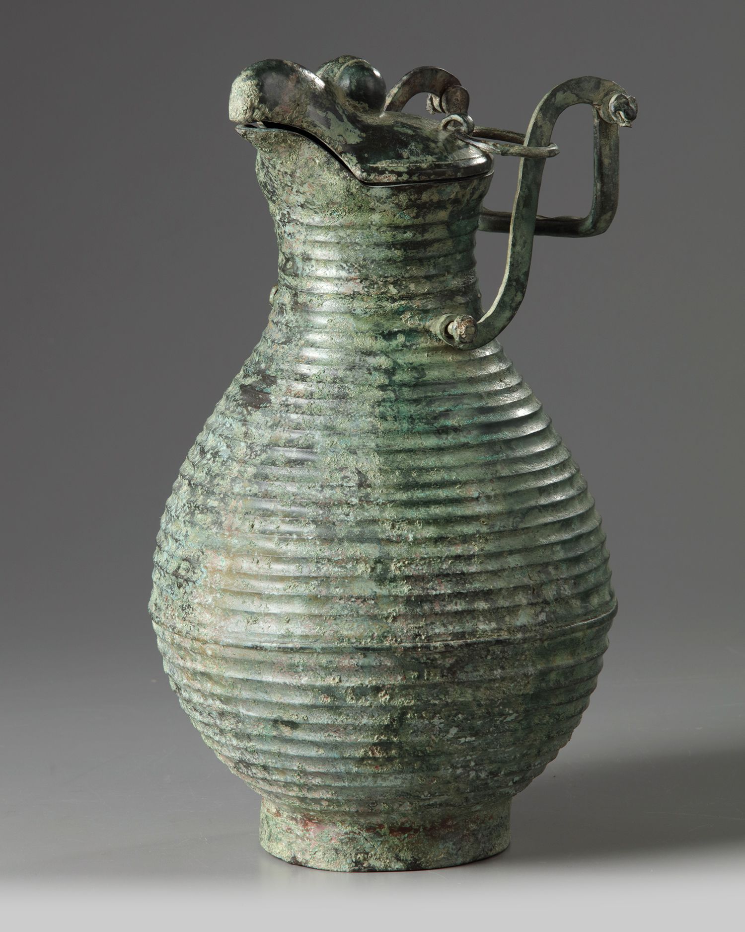 The pear-shaped ewer is decorated with horizontal ribs to the body, the bill-shaped spout is covered by a cover of a conforming shape, connected by an articulated hinge.
