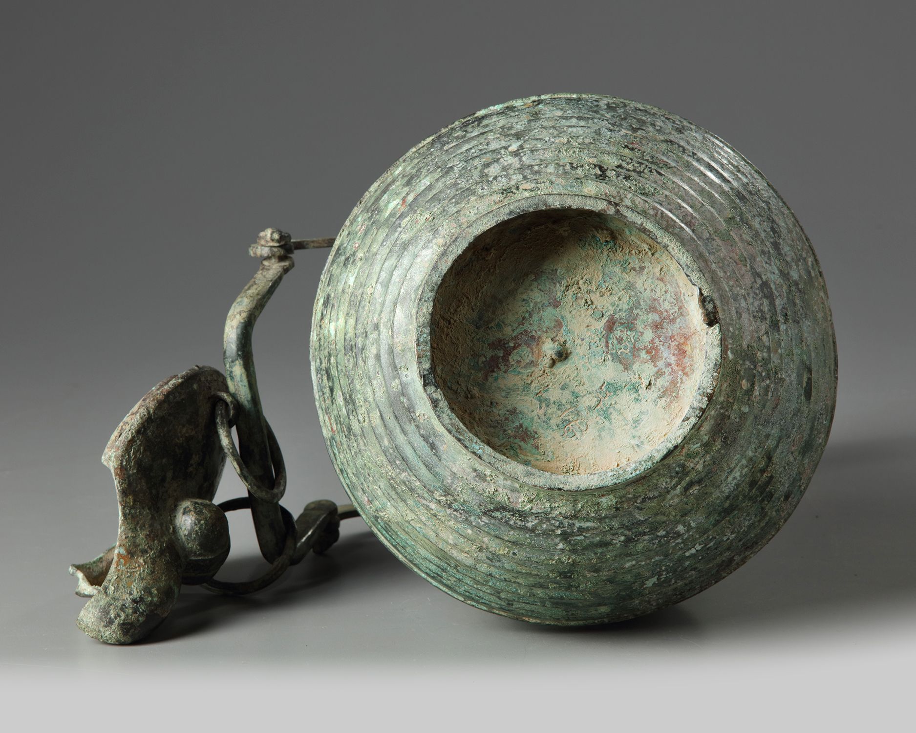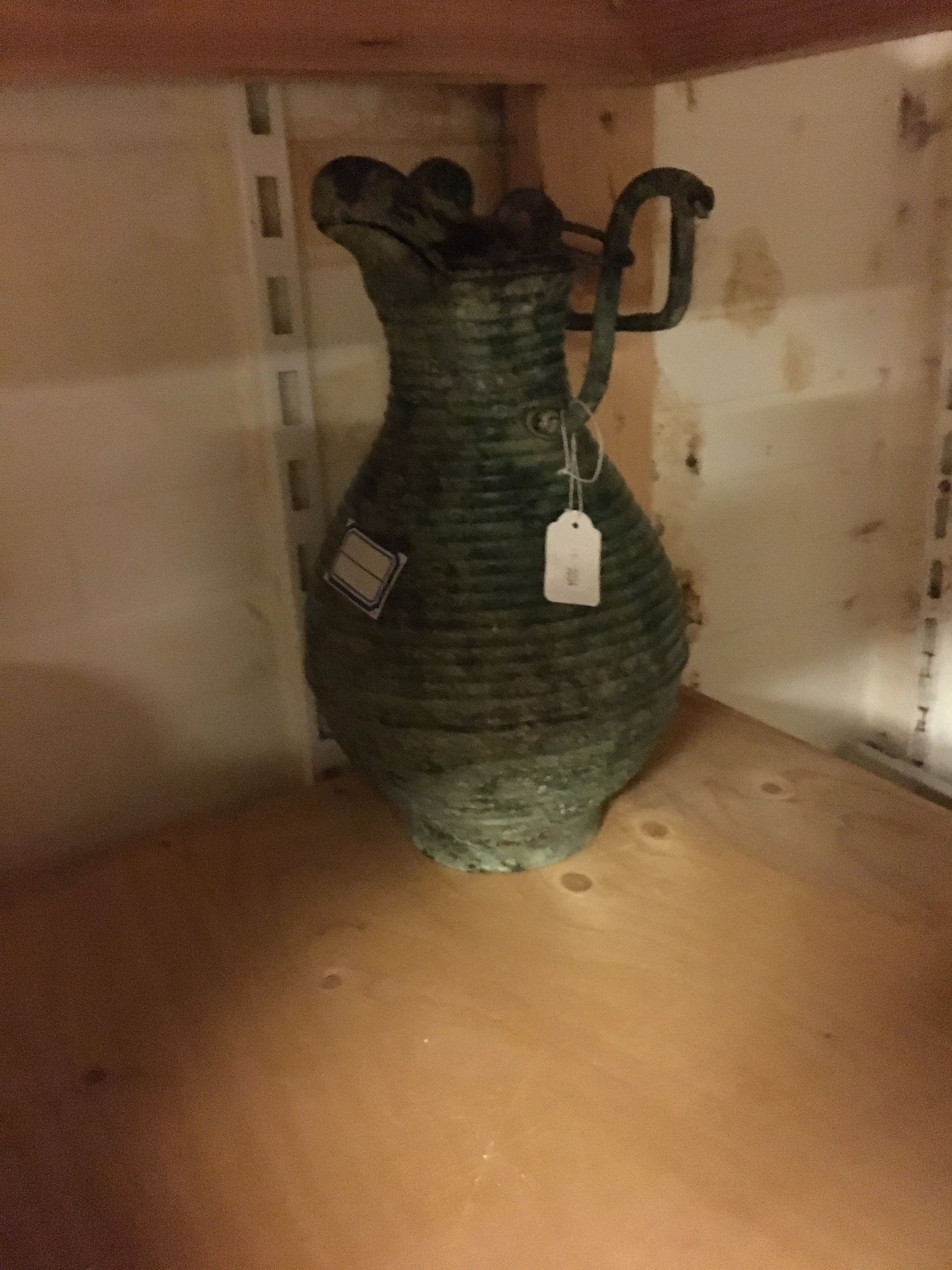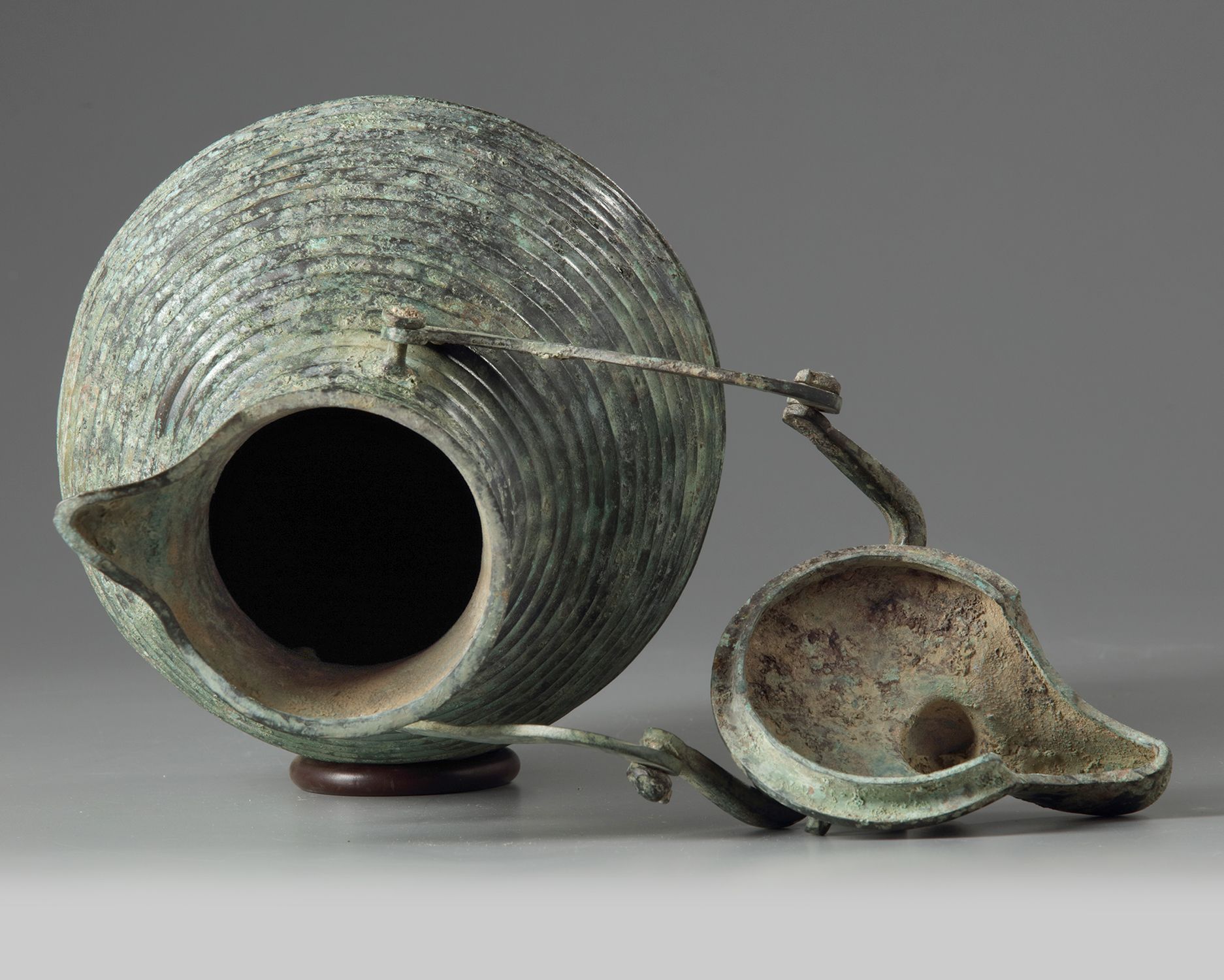 The pear-shaped ewer is decorated with horizontal ribs to the body, the bill-shaped spout is covered by a cover of a conforming shape, connected by an articulated hinge.